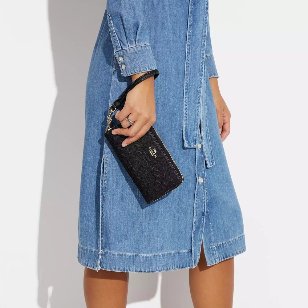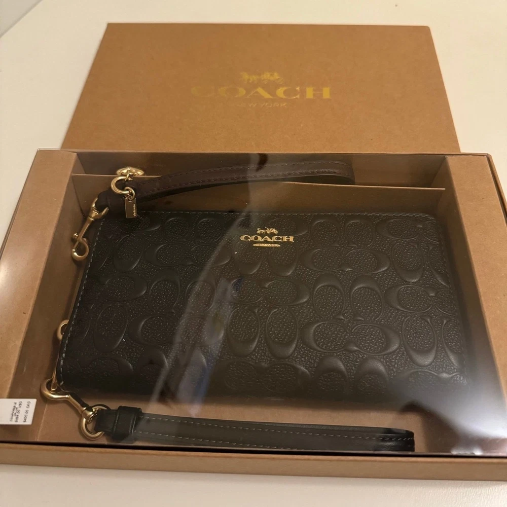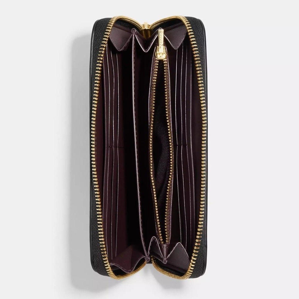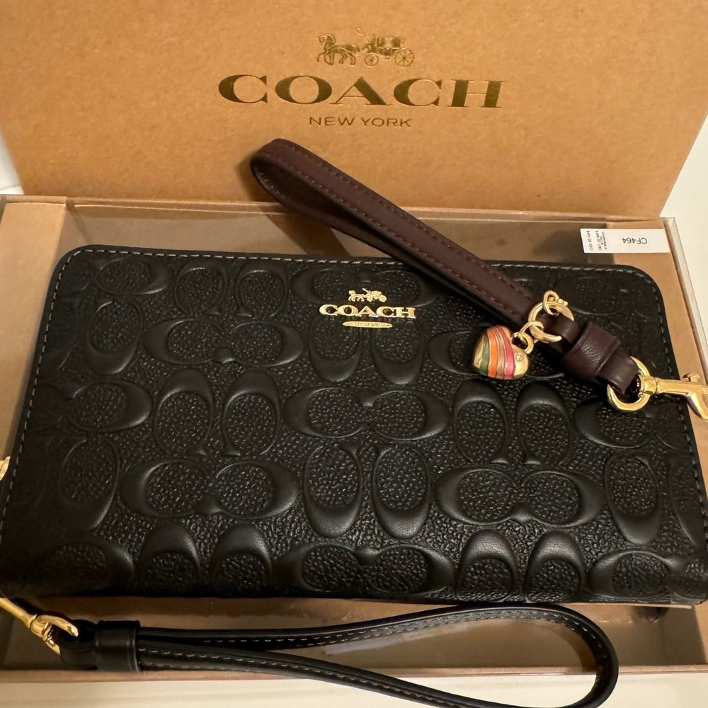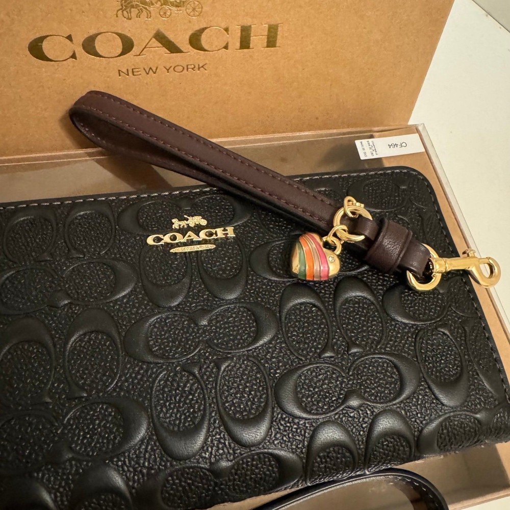 Style Number CF464 Measurements Length: 7.5" Height: 4.0" Width: 1.0" Materials Signature smooth calf leather and smooth leather Strap Detachable wrist strap Includes interchangeable strap with charm Detachable wrist strap Features Inside zip coin pocket 12 credit card slots Zip-around closure Full-length bill compartments Additional Details Packaged in a Coach gift box with ribbon