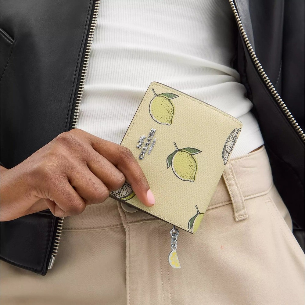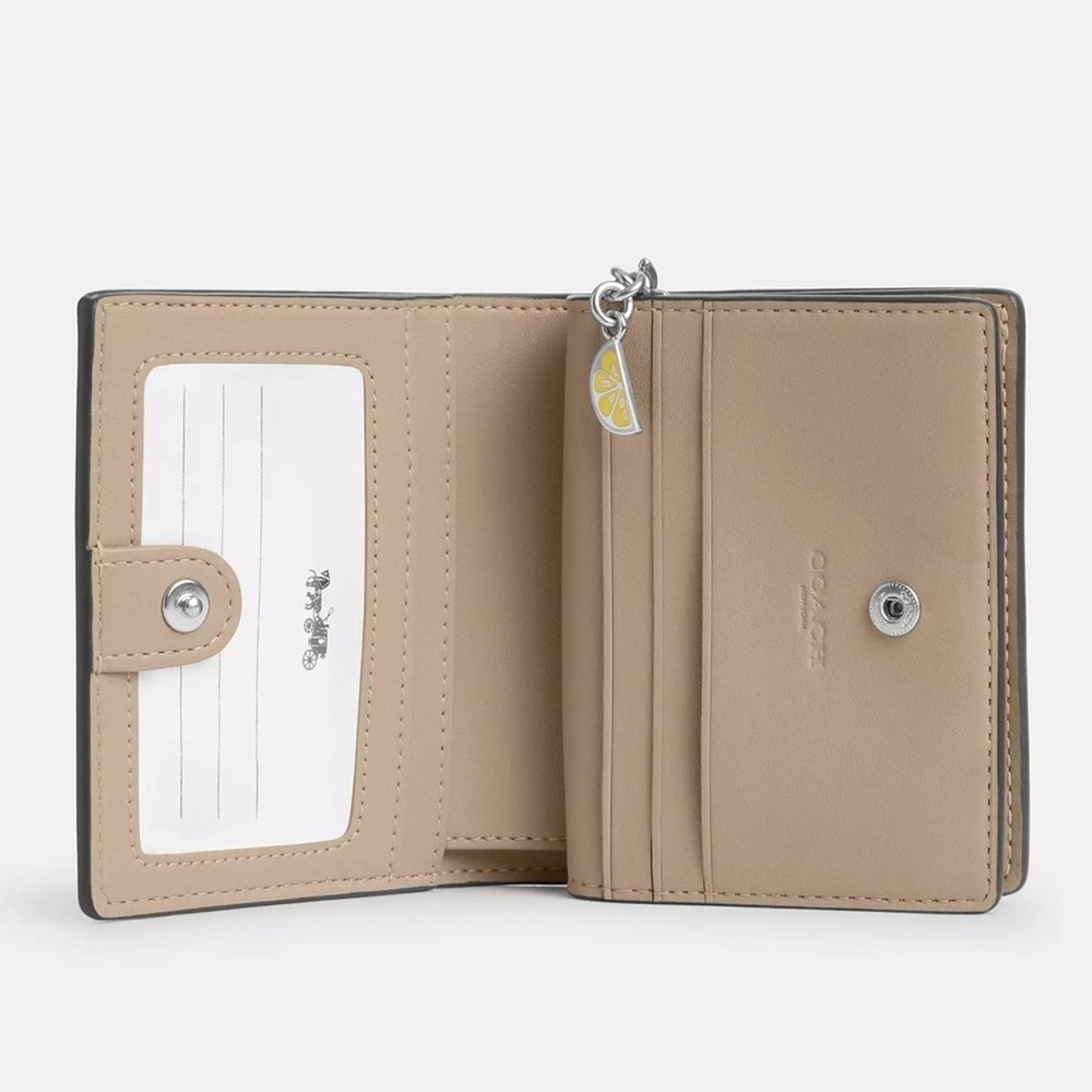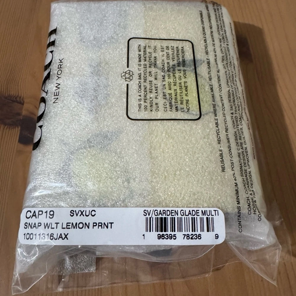 coated canvas/Sv/Garden Glade Multi Style Number CAP19 Measurements Length: 4.25" Height: 3.5" Width: 1.0" Materials Printed coated canvas Features Outside zip coin pocket Three credit card slots Snap closure Full-length bill compartment Additional Details ID window