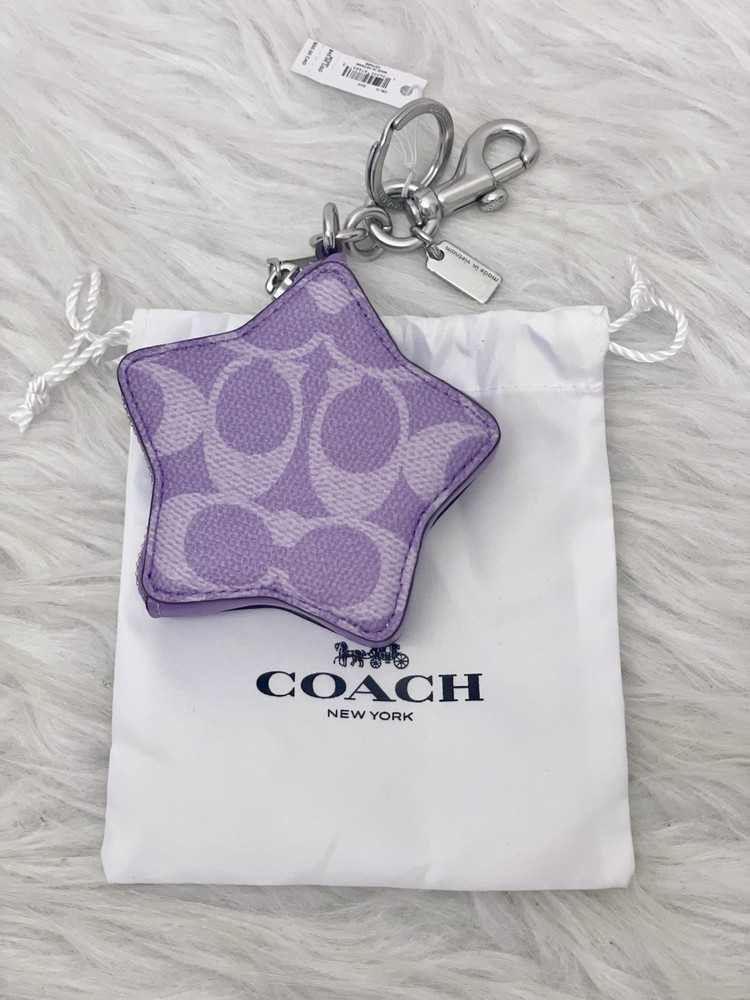 Coach Star Bag Charm In Signature Canvas Brand new with tags 100% Authentic Come with small dust bag Color: Silver/ Iris Style Number: CBL12 Measurements Length: 3.5" Height: 3.25" Width: 0.75" Materials Signature coated canvas and smooth leather Fabric lining Features Zip closure Attached dogleash clip Price is firm