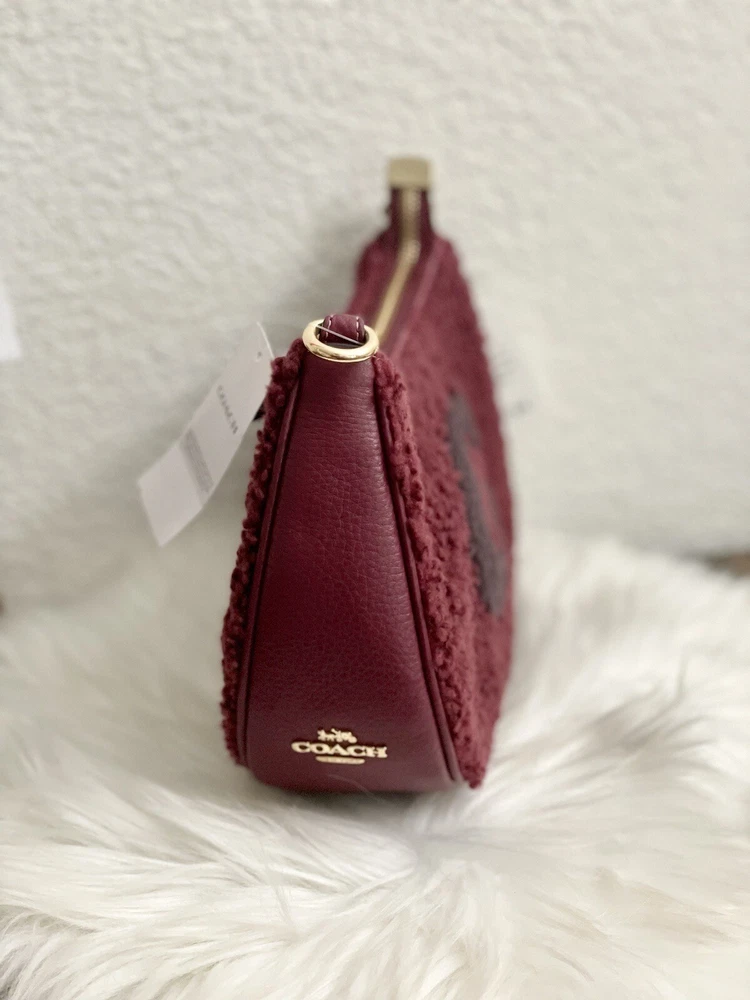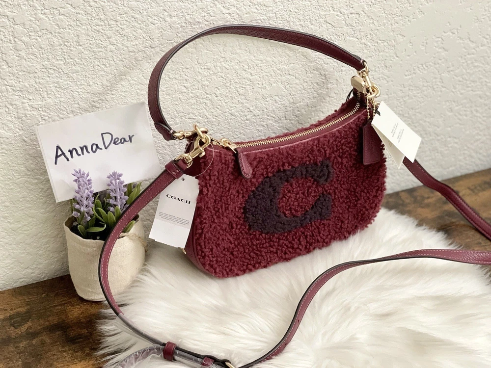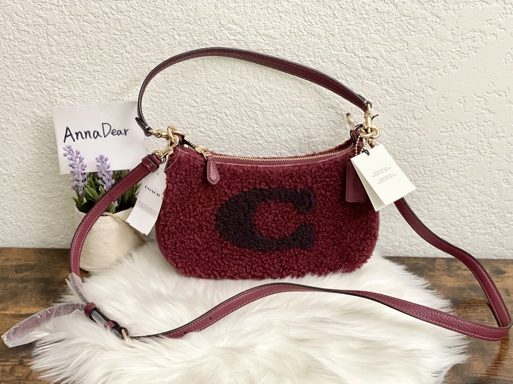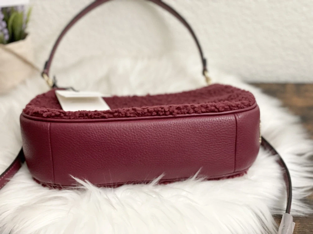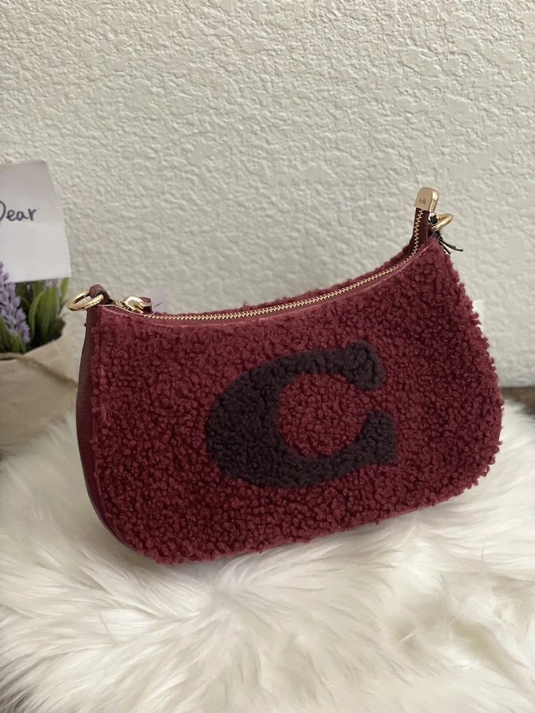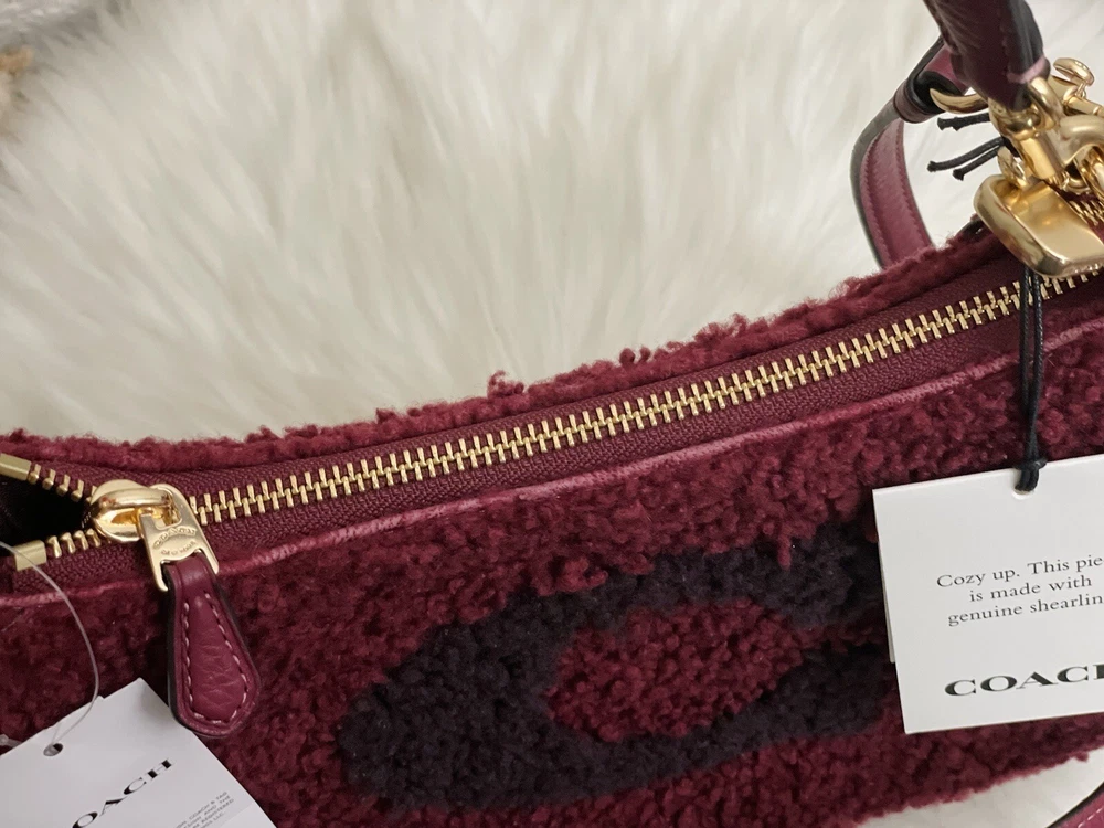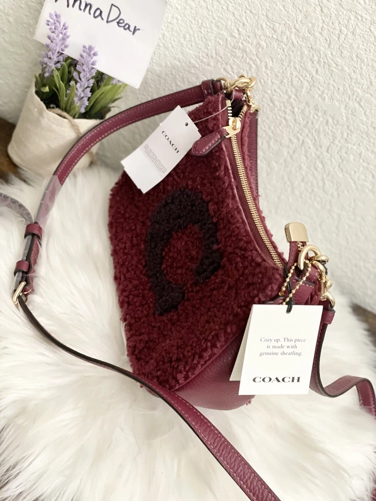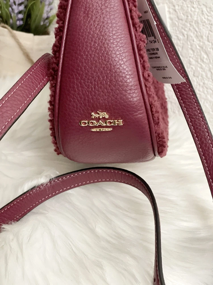 Coach Teri Shoulder Bag With Coach Motif Brand new with tags 100% Authentic Color: black Cherry Limited Edition Product Details Shearling and refined pebble leather Two credit card slots Inside multifunction pocket Zip-top closure, fabric lining Detachable handle with 8 1/4" drop Detachable strap with 22 3/4" drop for shoulder or crossbody wear 9 1/2" (L) x 6" (H) x 3" (W) Clean by leather specialist Style No. CE557 Price is firm