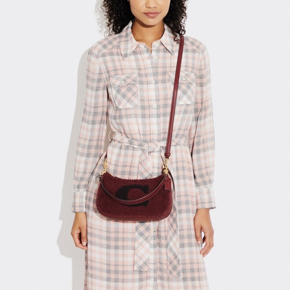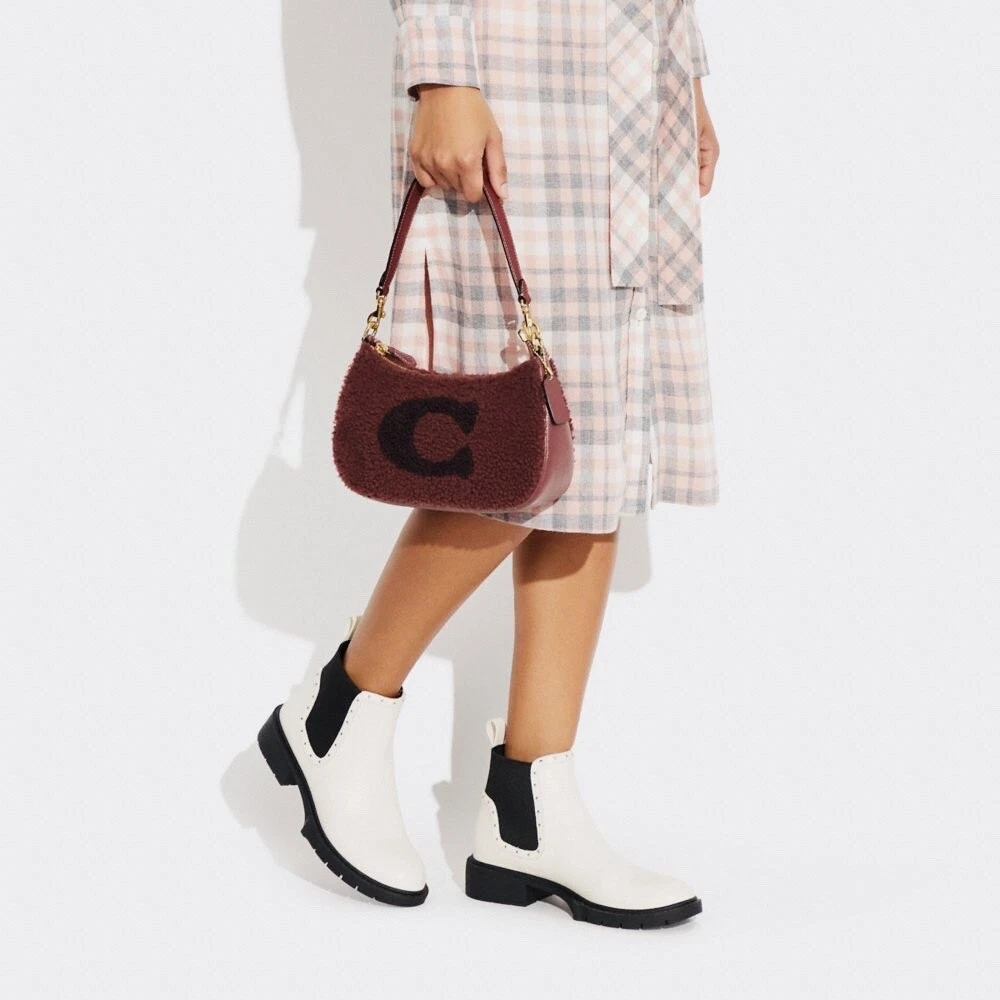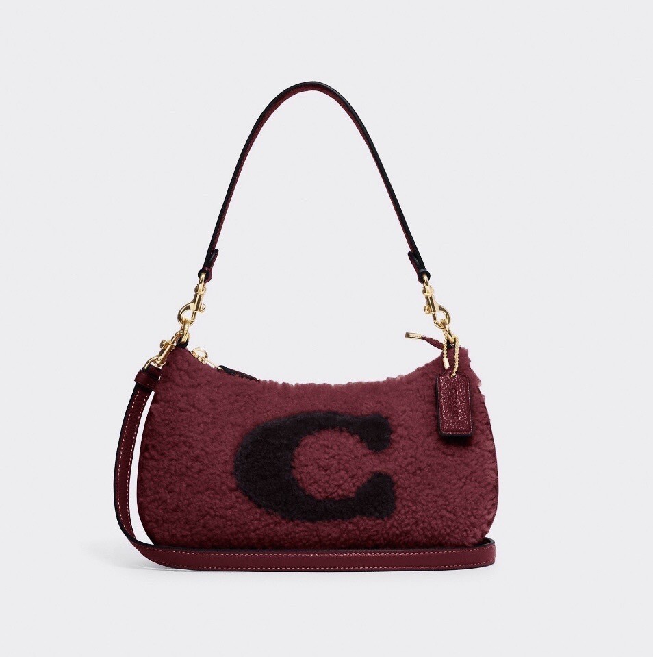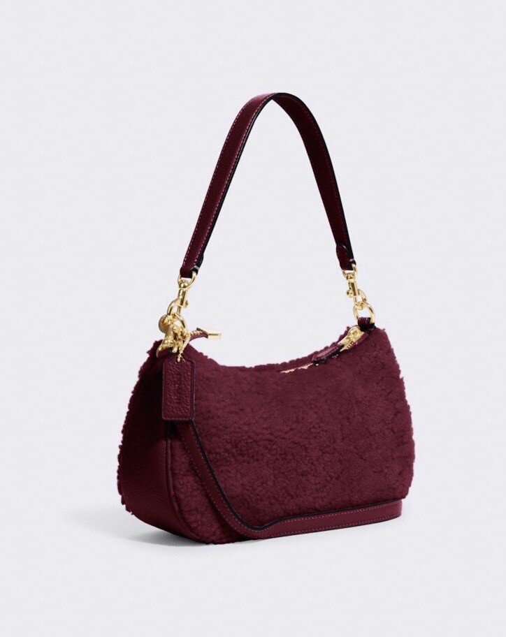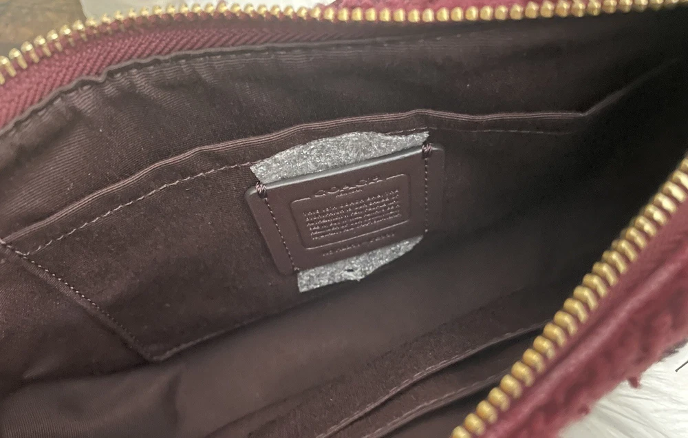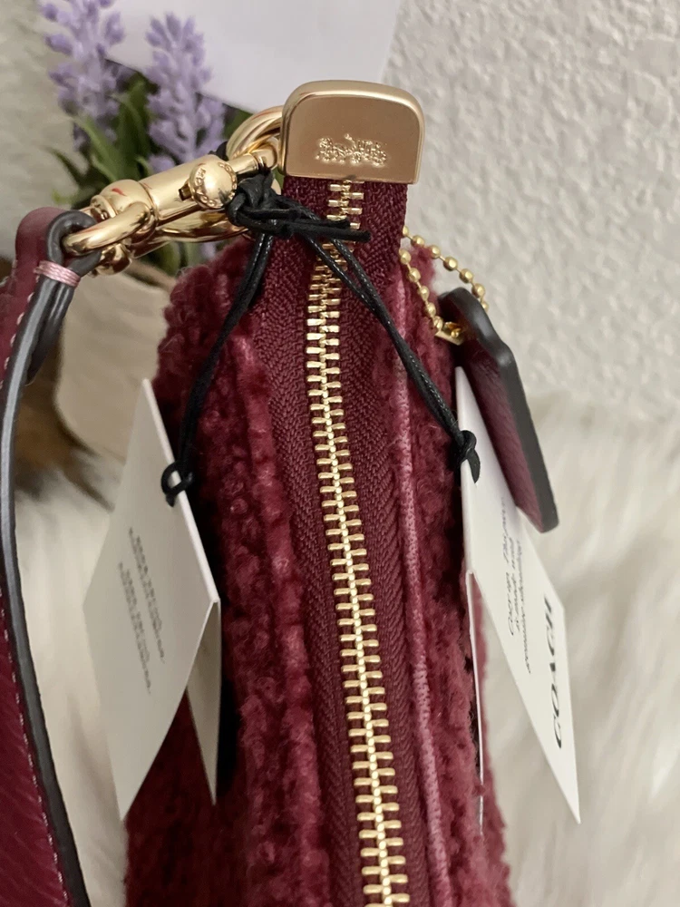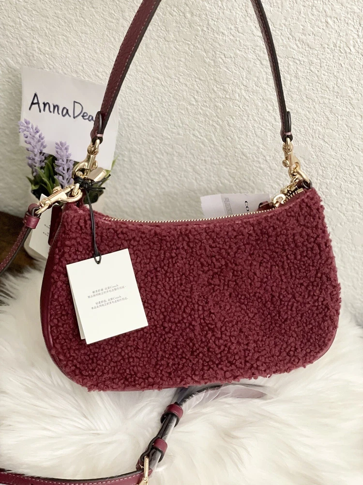 Coach Teri Shoulder Bag With Coach Motif Brand new with tags 100% Authentic Color: black Cherry Limited Edition Product Details Shearling and refined pebble leather Two credit card slots Inside multifunction pocket Zip-top closure, fabric lining Detachable handle with 8 1/4" drop Detachable strap with 22 3/4" drop for shoulder or crossbody wear 9 1/2" (L) x 6" (H) x 3" (W) Clean by leather specialist Style No. CE557 Price is firm