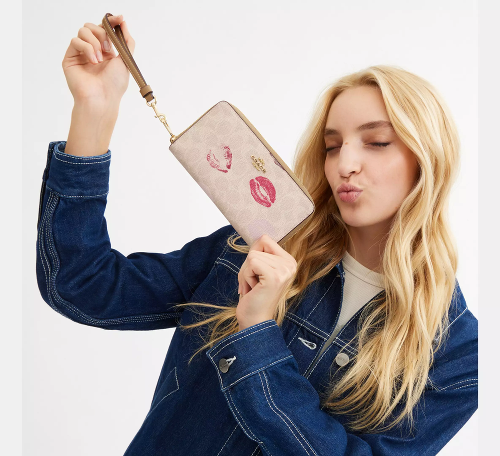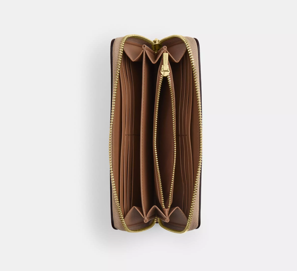 Gold/Sand Multi Style Number CZ955 Measurements Length: 7.5" Height: 4.0" Width: 1.0" Materials Signature coated canvas Strap Detachable wrist strap Features Inside zip coin pocket 12 credit card slots Zip-around closure Full-length bill compartments Fits all iPhone and Samsung Galaxy phones Additional Details Trim partially made with recycled leather fiber layer