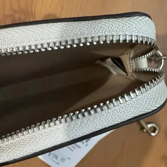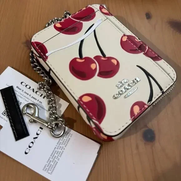 Silver/Chalk Multi Product Details Style Number CZ761 Measurements Length: 4.75" Height: 5.0" Width: 3.25" Materials Smooth leather Fabric lining Strap Chain wrist strap with dogleash clip attached Features Open pocket Two credit card slots Zip compartment