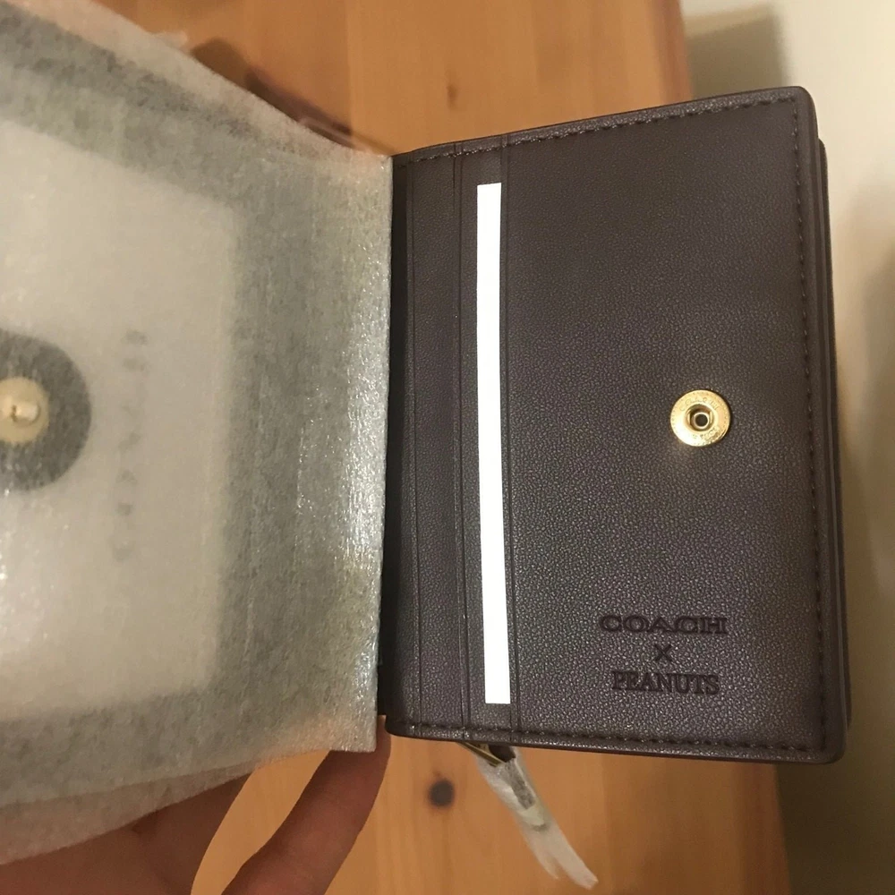 Absolutely love this Coach x Peanuts wallet! The pebble leather feels luxurious, and the playful Snoopy lights motif adds a fun touch. Perfect size with three card slots, an ID window, and a handy zip coin pocket—so practical yet stylish. The gold and wine color combo is classy, and the snap closure keeps everything secure. A must-have for Peanuts fans who appreciate quality!
