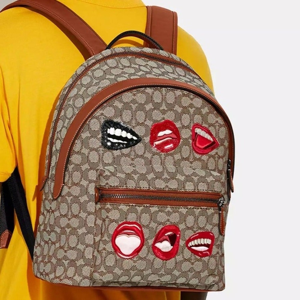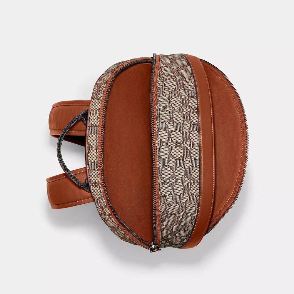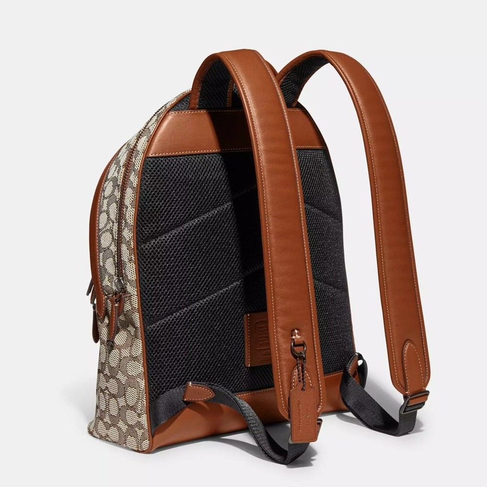 Cocoa Multi Signature textile jacquard and glovetanned leather Inside zip, cell phone and multifunction pockets Inside tech sleeve Double zip closure, fabric lining Top handle with 2 1/2" drop Outside zip pocket Adjustable shoulder straps Fits a 15" laptop 11 3/4" (L) x 15 3/4" (H) x 5" (W) Coach x Tom Wesselmann © Estate of Tom Wesselmann. Licensed by Artestar, New York. Style No. CA325