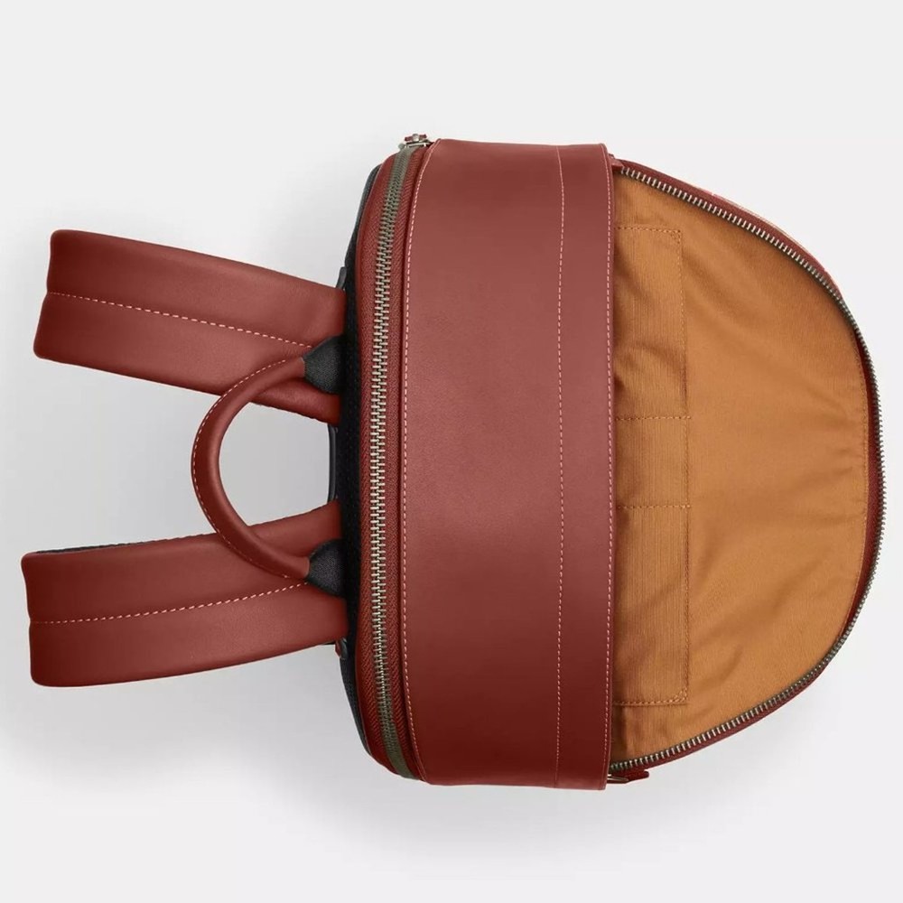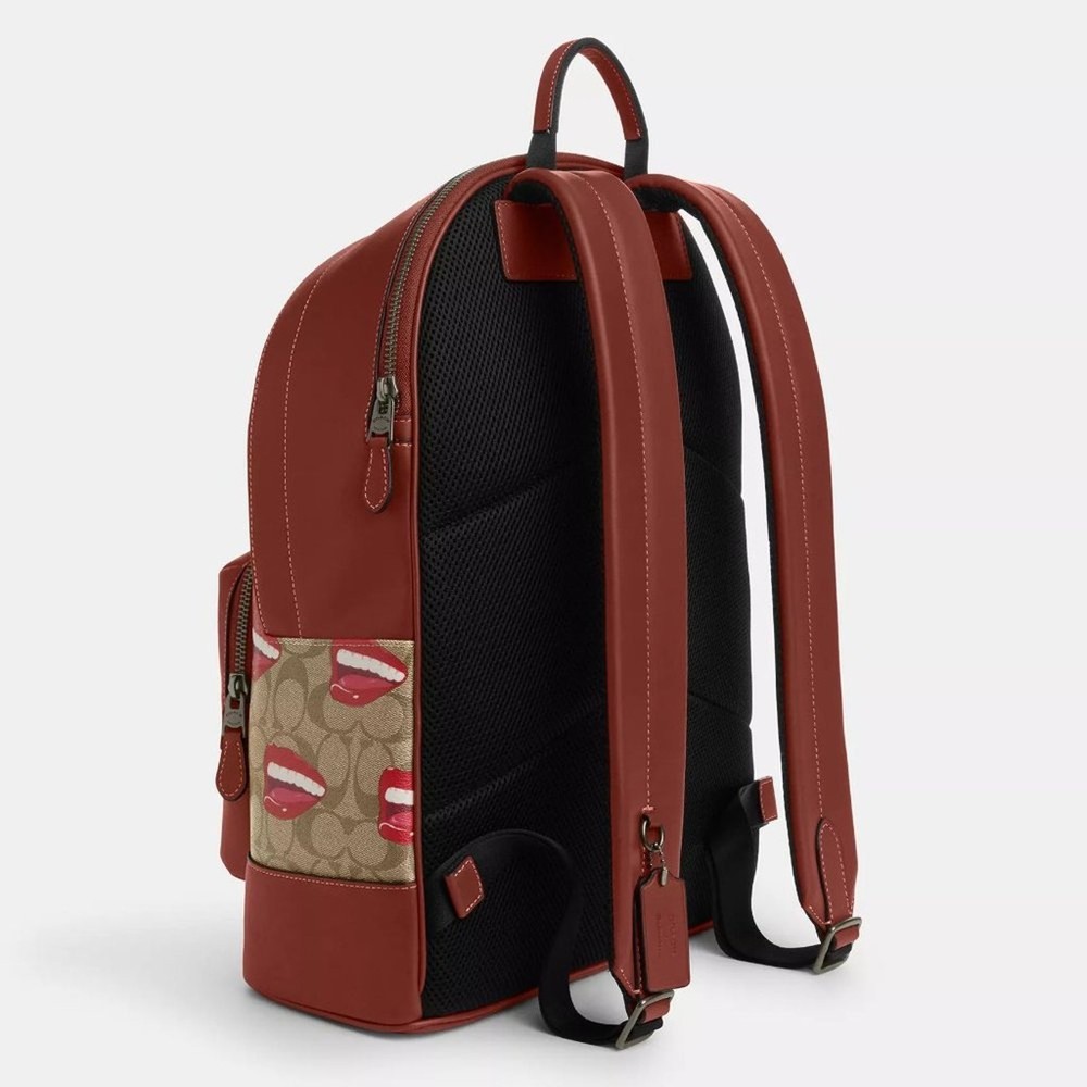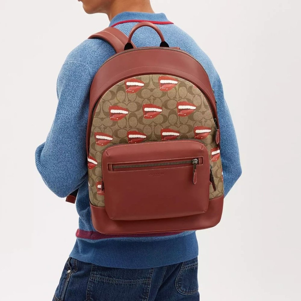 Style Number CQ084 Measurements Length: 12.5" Height: 16.75" Width: 6.0" Materials Signature coated canvas and smooth calf leather Fabric lining Handle Top handle with 2.5" drop Strap Adjustable shoulder straps Features Outside zip pocket Inside zip pocket, inside cell phone pocket Zip closures Two separate main compartments Inside multifunction pockets Additional Details Coach x Tom Wesselmann © Estate of Tom Wesselmann. Licensed by Artestar, New York.