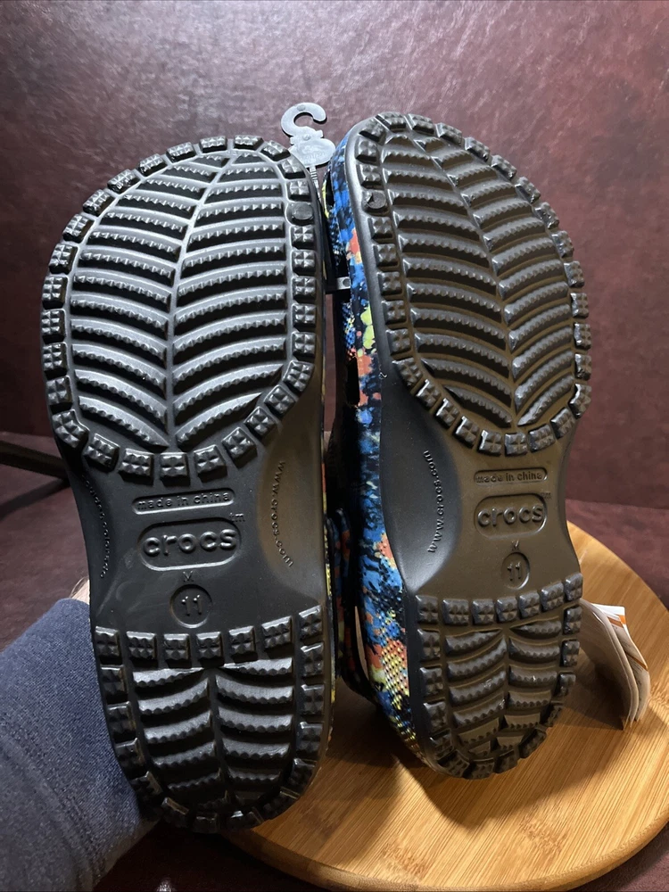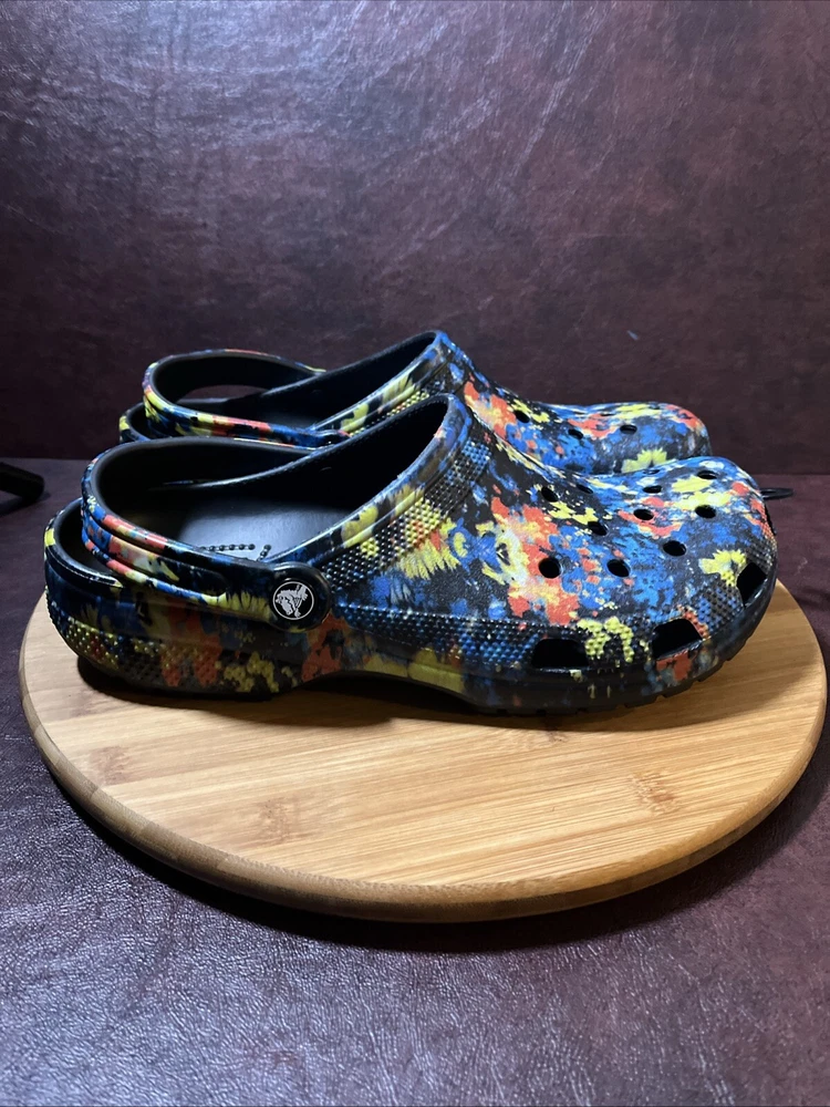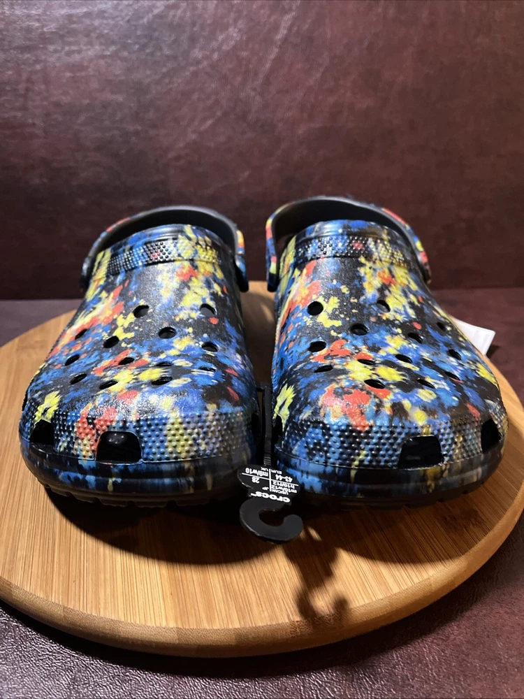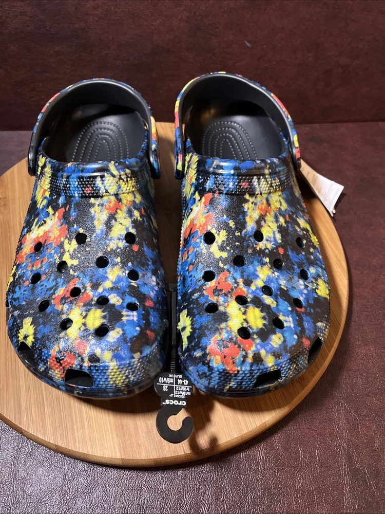 The NWT Crocs Classic Cyber Beach Clog in black multicolor splash is a unisex shoe designed for both men and women in size Mens 11 / Womens 13. This slip-on clog features a closed toe design with a paint splash pattern, accented with the Crocs logo, making it a stylish and comfortable choice for casual wear, travel, or activewear. The shoe is lightweight, breathable, and features an ankle strap for added comfort and support, suitable for outdoor activities and everyday wear in any season.