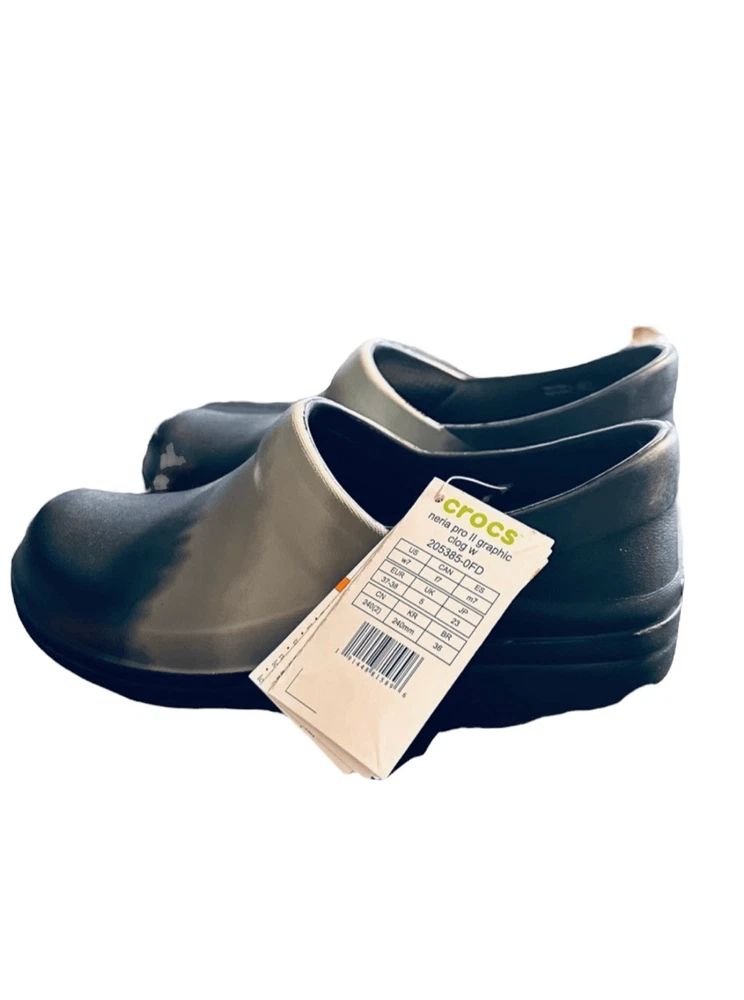 The product is a pair of Crocs Neria Pro II Graphic Casual Work Clogs in an Ombré Grey and black color scheme, designed for women in size 7. These slip-on clogs feature a multicolor exterior of Croslite material, making them both comfortable and stylish for casual wear. The ombré pattern adds a trendy touch to the classic clog style, perfect for everyday use. • Lightweight. Flexible • 360-degree comfort • Please review the size and pictures closely before purchasing. • NO RETURNS Product color may vary slightly due to photographic lighting sources or your monitor settings! ***Item: S54 All items are loaded with clear, detailed pictures, pre-checked, firmly well packed, bagged or covered with foam/bubble wrap, and sealed with extra taping. Images and recorded support items with a video before packaging and after for your security protection and mine! Tags- absorbing, adjustable, accent, accessories, aesthetic, air, airy puffed, ankle, ankle wrap, artificial, authentic, autumn, back zipper, basket, bean, birthday, boho, bohemian, bold, booties, boots, now, boy, buckle, butterfly, buttery-soft, cage, canvas, casual, certified, chain, chain-tread, character, characterized, cheetah, chic, Christmas, chunky, cinderella, classic, classy, clogs, closed-toe, closure, cocktails, collection, combat, comfy, compliment, costume, country, cowboy, cowgirl, cozy, crafted, crazy, criss-cross, crochet, crocodile, crocs, Croslite foam, custom, customizable, daily wear, date night, decor, design, designer, dinner, duck, durable, earth, eclectic, edgy, elegance, elegant, embellishments, EVA, evening, cozy, event, extraordinary, eye-catching, fabric, fall, fashion, faux fur, felt, feminine, flat-heel, flats, fleece, foam, fur, fuzzy, genuine leather, genuine suede, gift, girl, girly, glam, glitter, going out, go-go boots, gold-tone, golf gothic, grippers, grain, grunge, handles, hawt, hearts, heels, high, high quality, high-tops, hiking, hippie, holiday, hot, ice, indoors, infused, insulated, isotoner, Jibbitz, khaki, kids, knee-high, lace, lace-up, leather, light-up, lightweight, limited edition, loafers, luxe, luxurious, luxury, maine-made, man-made, manufactured, mary Jane, mesh, Mexican, mid-calf, modern, moto, motorcycle, mules must-have, night, night out, nubuck leather, oasis, office, ombre, ortholite, outdoors, outsole, padded, padded collar, party, patched, patten leather, pattern, parties, peep toe, pewter, PINK, pivoting heel strap, platform, pleated, pleather, polka dots, popular, premium, present, printed, PU leather, pumps, punk, PVC, rain, rainbow, rare rave, retro, round toe, rubber, ruffle, running, sandals, secure footing, sex appeal, sexy, sheer, shiny, shock-cushion, shoes, simple, skate, skateboarder, skimmer, slippers, slipper socks, slip-off, slip-on, slipper booties, slipper, snake skin, sneakers, socks, snow, socks, solid hue, sport, side buckle, side strap, side zip, Signature's, silhouette, slide, steel toe, steel shank, stitching, stilettos, strap, strappy, streetwear, stripe, stunning, stylish, suede, summer, superhero, sweater, synthetic, tennis, texture, thermolite, tie, tiger, toddler, traction, traditional, translucent, trendy, trending, triple needle, tropical, tumbled, two pull handles, the two-toned, unique, unisex, upper-class, upper layer, urban style, vast, vegan, velvet, versatile, vibes, vibrant, vintage, walking, warm, washable, waterproof, water repellent, water resistance, wedding, wedge, western, wide, winter, women, woman, work, wrap, woven, Y2K, yoga, zipper, zipper back