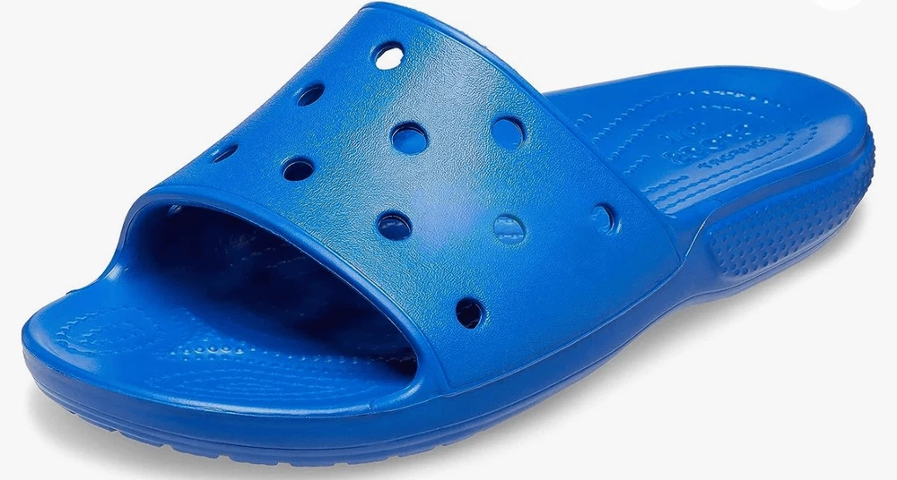 The product is a pair of Crocs Unisex-Adult Blue Classic Slide Sandals size M5/W7. These casual slip-on sandals feature a classic Crocs design with a blue exterior made of Croslite material. They are suitable for men and women in size 5 for men and size 7 for women. The sandals offer comfort and style for everyday wear, making them versatile for various casual occasions. • Jibbitz in the picture INCLUDED • Please review the size and pictures closely before purchasing. • NO RETURNS Product color may vary slightly due to photographic lighting sources or your monitor settings! ***Item: S4 All items are loaded with clear, detailed pictures, pre-checked, firmly well packed, bagged or covered with foam/bubble wrap, and sealed with extra taping. Images and recorded support items with a video before packaging and after for your security protection and mine! Tags- absorbing, adjustable, accent, accessories, aesthetic, air, airy puffed, ankle, ankle wrap, artificial, authentic, autumn, back zipper, basket, bean, birthday, boho, bohemian, bold, booties, boots, now, boy, buckle, butterfly, buttery-soft, cage, canvas, casual, certified, chain, chain-tread, character, characterized, cheetah, chic, Christmas, chunky, cinderella, classic, classy, clogs, closed-toe, closure, cocktails, collection, combat, comfy, compliment, costume, country, cowboy, cowgirl, cozy, crafted, crazy, criss-cross, crochet, crocodile, crocs, Croslite foam, custom, customizable, daily wear, date night, decor, design, designer, dinner, duck, durable, earth, eclectic, edgy, elegance, elegant, embellishments, EVA, evening, cozy, event, extraordinary, eye-catching, fabric, fall, fashion, faux fur, felt, feminine, flat-heel, flats, fleece, foam, fur, fuzzy, genuine leather, genuine suede, gift, girl, girly, glam, glitter, going out, go-go boots, gold-tone, golf gothic, grippers, grain, grunge, handles, hawt, hearts, heels, high, high quality, high-tops, hiking, hippie, holiday, hot, ice, indoors, infused, insulated, isotoner, Jibbitz, khaki, kids, knee-high, lace, lace-up, leather, light-up, lightweight, limited edition, loafers, luxe, luxurious, luxury, maine-made, man-made, manufactured, mary Jane, mesh, Mexican, mid-calf, modern, moto, motorcycle, mules must-have, night, night out, nubuck leather, oasis, office, ombre, ortholite, outdoors, outsole, padded, padded collar, party, patched, patten leather, pattern, parties, peep toe, pewter, PINK, pivoting heel strap, platform, pleated, pleather, polka dots, popular, premium, present, printed, PU leather, pumps, punk, PVC, rain, rainbow, rare rave, retro, round toe, rubber, ruffle, running, sandals, secure footing, sex appeal, sexy, sheer, shiny, shock-cushion, shoes, simple, skate, skateboarder, skimmer, slippers, slipper socks, slip-off, slip-on, slipper booties, slipper, snake skin, sneakers, socks, snow, socks, solid hue, sport, side buckle, side strap, side zip, Signature's, silhouette, slide, steel toe, steel shank, stitching, stilettos, strap, strappy, streetwear, stripe, stunning, stylish, suede, summer, superhero, sweater, synthetic, tennis, texture, thermolite, tie, tiger, toddler, traction, traditional, translucent, trendy, trending, triple needle, tropical, tumbled, two pull handles, the two-toned, unique, unisex, upper-class, upper layer, urban style, vast, vegan, velvet, versatile, vibes, vibrant, vintage, walking, warm, washable, waterproof, water repellent, water resistance, wedding, wedge, western, wide, winter, women, woman, work, wrap, woven, Y2K, yoga, zipper, zipper back
