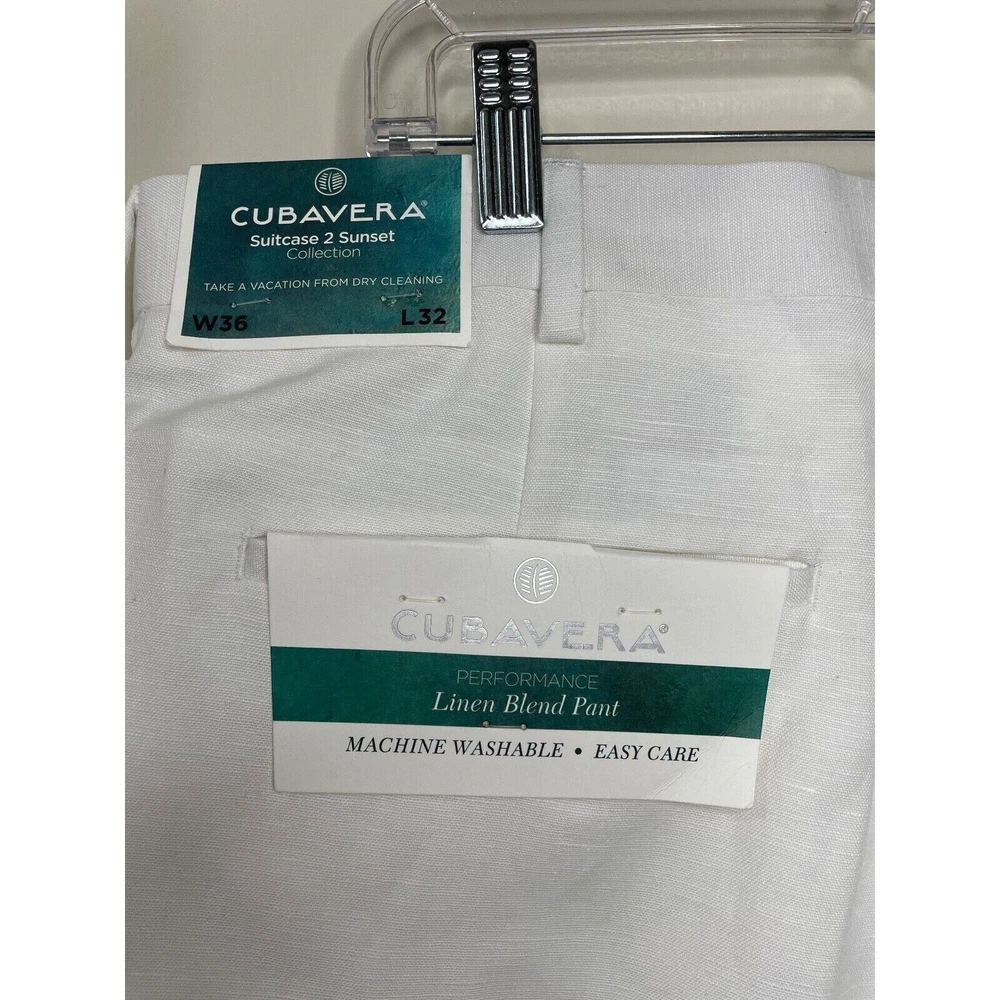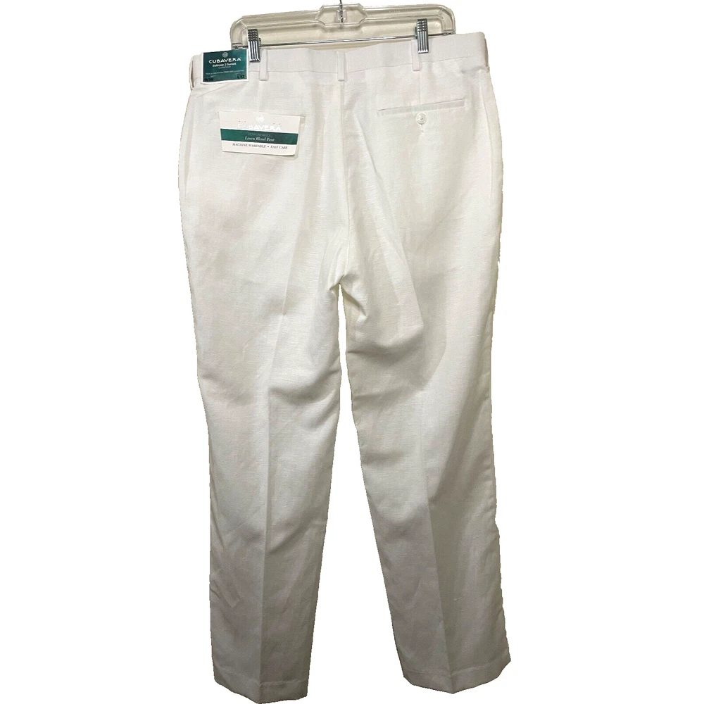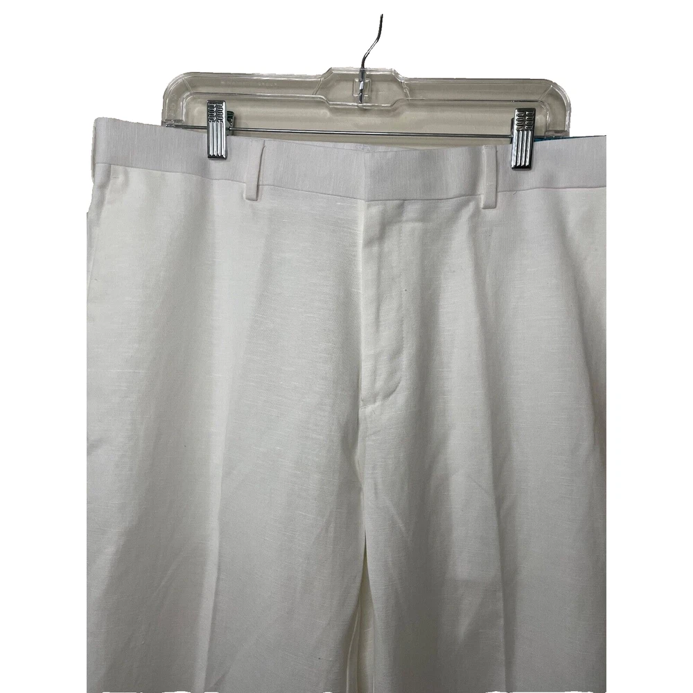Elevate your style with these brand new white dress pants by Cubavera. These classic fit pants are made of a lightweight and breathable linen blend material, perfect for summer and spring occasions such as weddings, parties, and even workwear. Featuring a flat front design and straight leg style, these pants have slash pockets for added convenience. With easy care instructions and a machine washable garment care label. The zip and hook & loop closure ensures a secure fit, making them a great addition to any wardrobe. Available in size 36 waist and 32 inseam, these pants will surely become a staple piece in your closet.