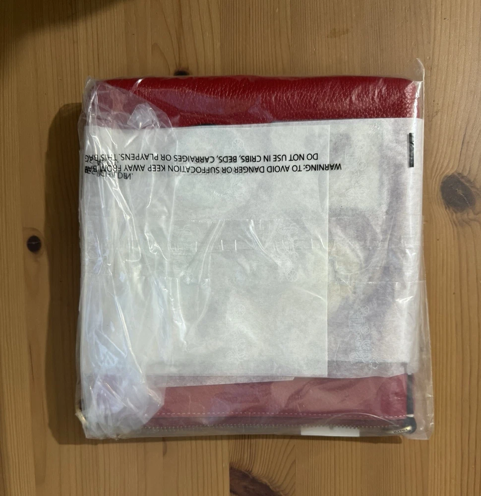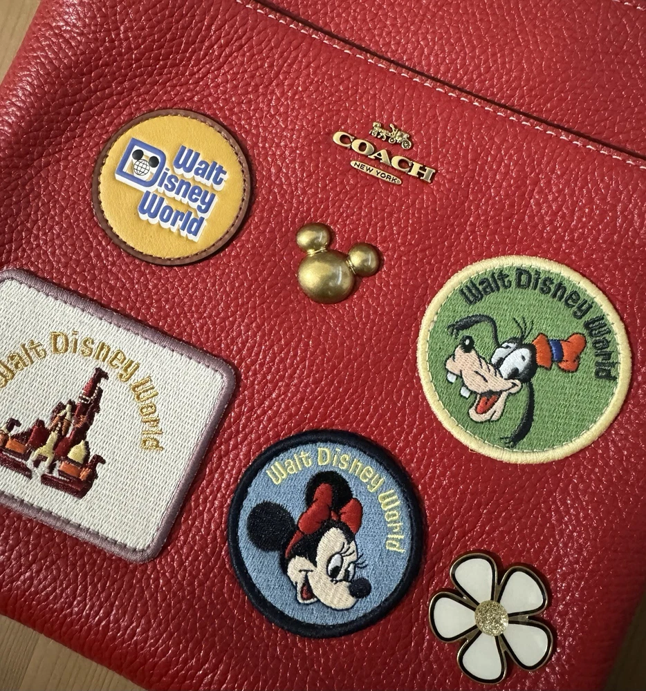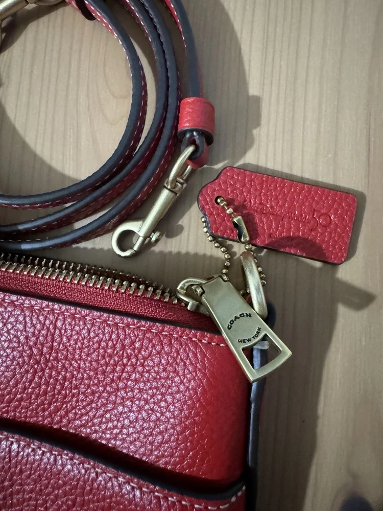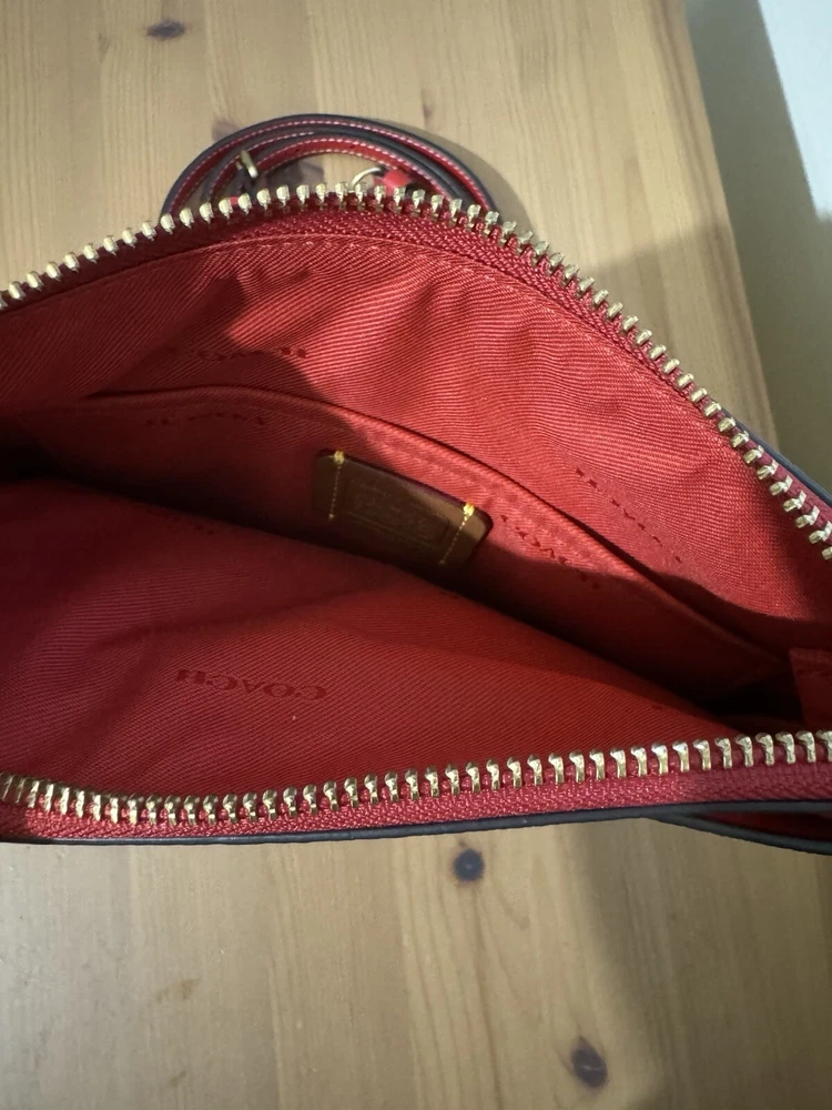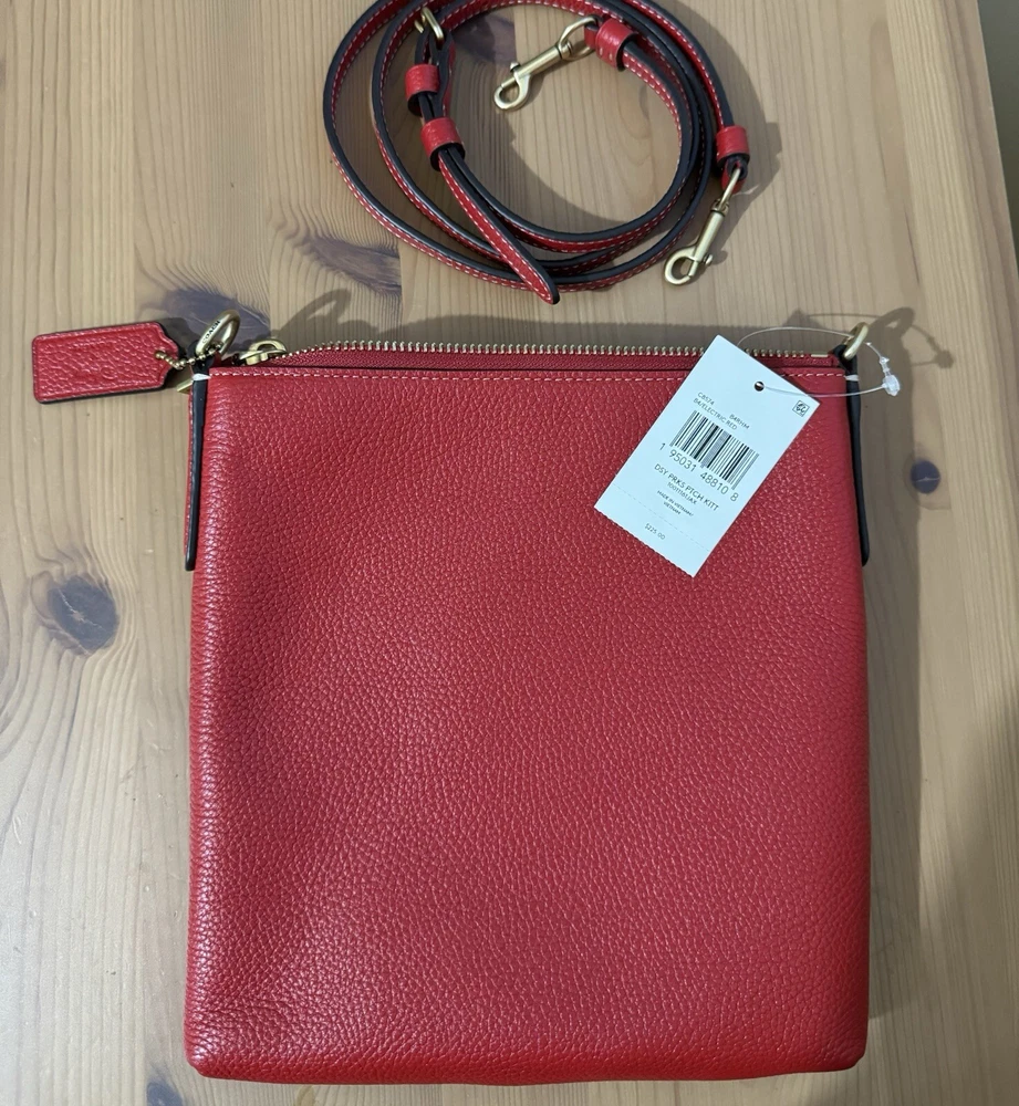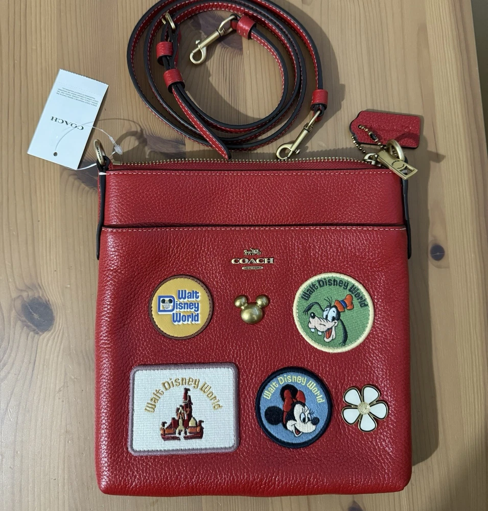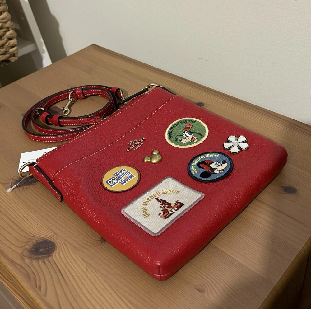 Polished pebble leather and smooth leatherInside open pocketZip-top closure, fabric liningOutside open pocketDetachable strap with 23" drop for shoulder or crossbody wearOrig. 2257 3/4" (L) x 8 1/4" (H) x 1" (W)Disney x Coach©DisneyStyle No. C8574Color: Brass/Electric Red
