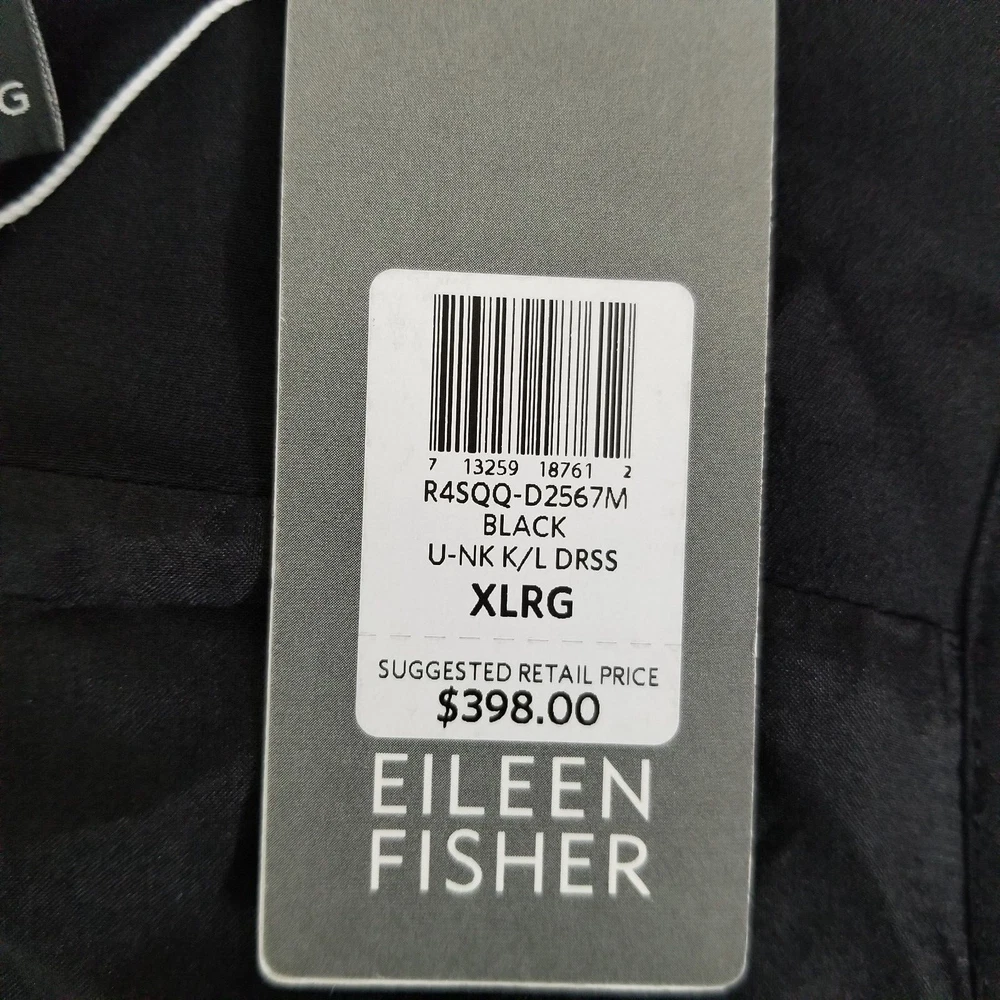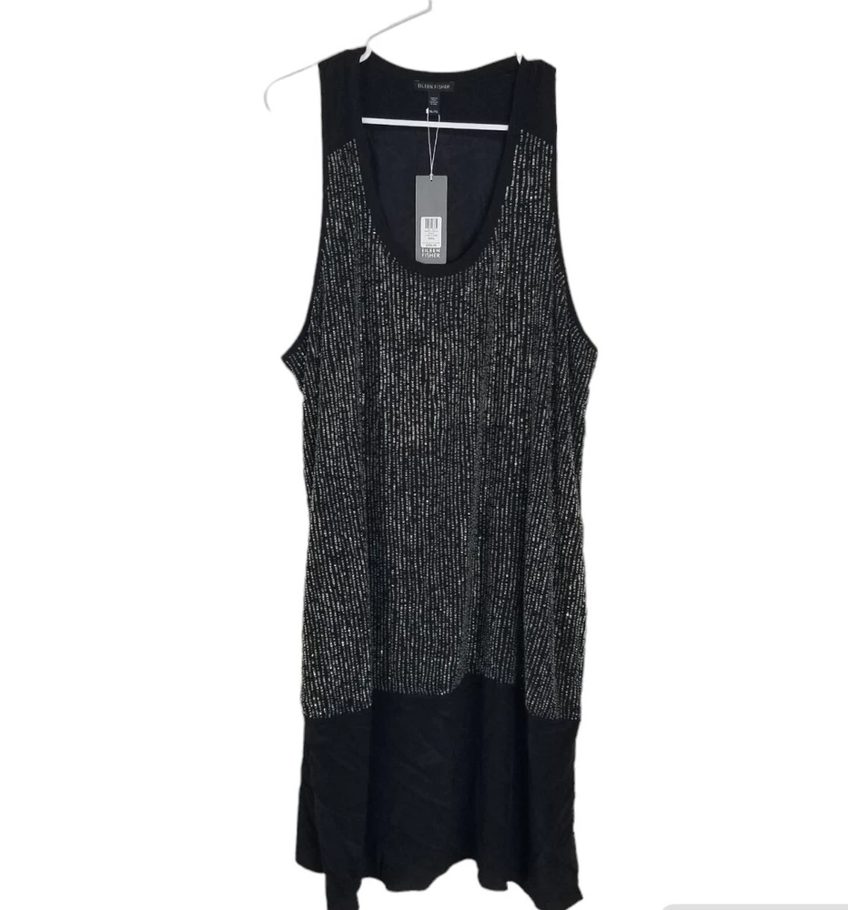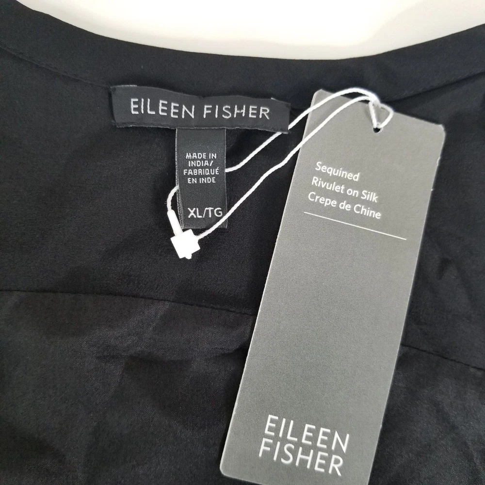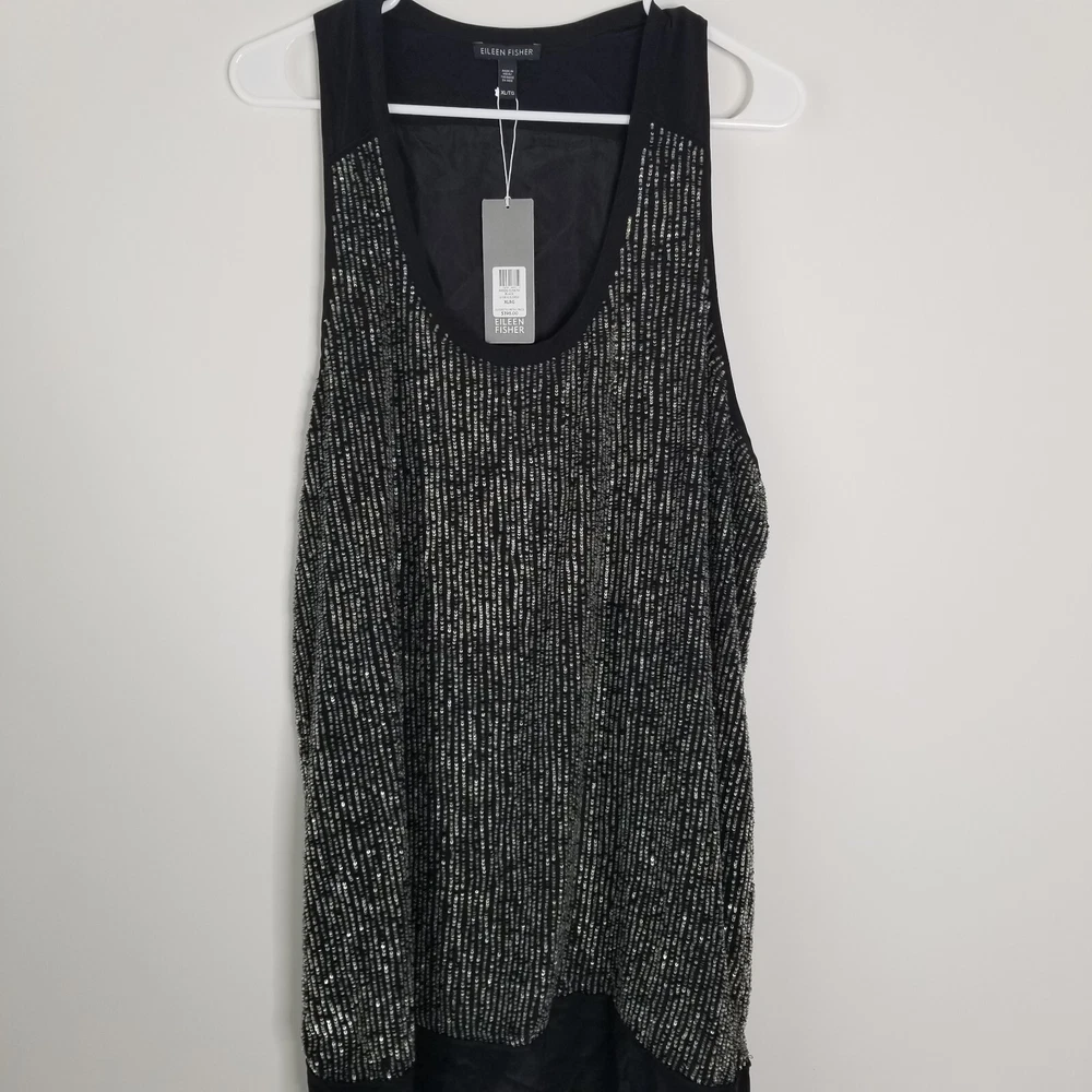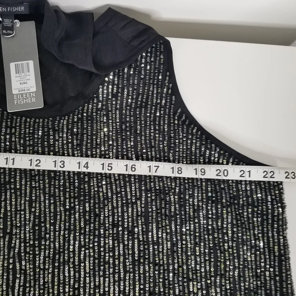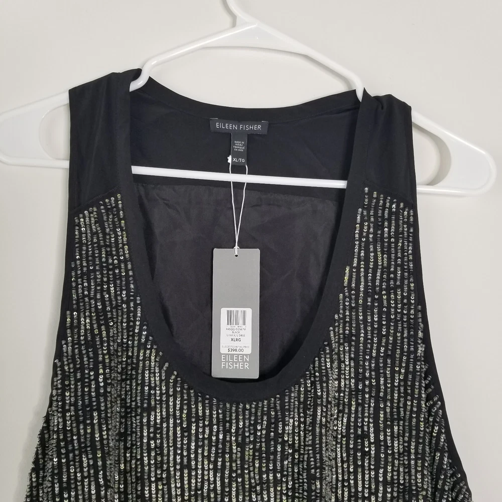 New with tags Eileen Fisher Sequined 100% Silk Crepe de Chine Tank Dress in a size XL. Color is black. No flaws observed, brand new. Scoop neckline Sleeveless Pullover style Racerback Sequin front Back seam detailing Lined 100% Silk, 100% silk lining Dry clean Measurements taken with item laid flat: Length: 40" Pit to Pit: 22" Waist: 25"