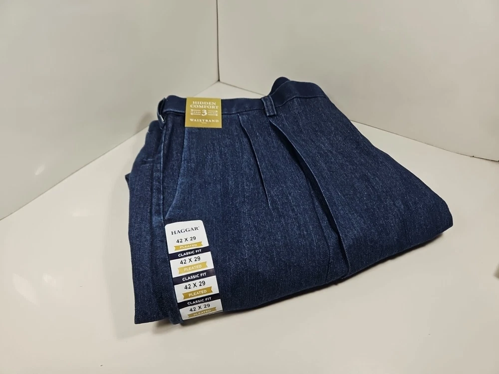 NWT HAGGAR Men’s PREMIUM STRETCH DENIM PANTS Jeans PLEATED CLASSIC FIT 42 x 29 Style: hc00280 Color: 422 med blue Premium stretch denim Product will be shipped timely and packaged with care. Offers are encouraged. Please feel free to reach out with questions. Please see pictures. Thank you. New old stock jeans. See pictures. These are NWT Haggar men's premium stretch denim pants in a classic fit size 42 x 29. The jeans are pleated with a straight leg style in a blue color. Made of denim fabric with added stretch for comfort. Sku: ghang
