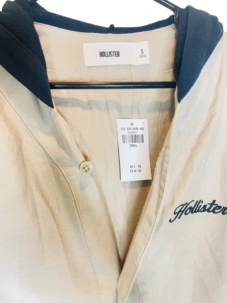 Elevate your wardrobe with the Hollister Men's Button-Up Shirt, combining comfort with a touch of casual sophistication. The shirt comes in a versatile beige hue, making it an easy match for a variety of outfits, whether you're aiming for a laid-back look or dressing up for a casual event. Its long sleeves and hooded design provide an extra layer of warmth, making it ideal for transitioning through seasons from fall to winter.Crafted from a soft blend of cotton and viscose, the shirt promises ease of movement and a breathable feel, perfect for everyday wear. The V-neckline adds a modern touch to the classic button-up closure, ensuring a flattering fit for a size small. With its solid pattern and subtle button accents, this piece is a staple for any occasion, from workwear to social gatherings.