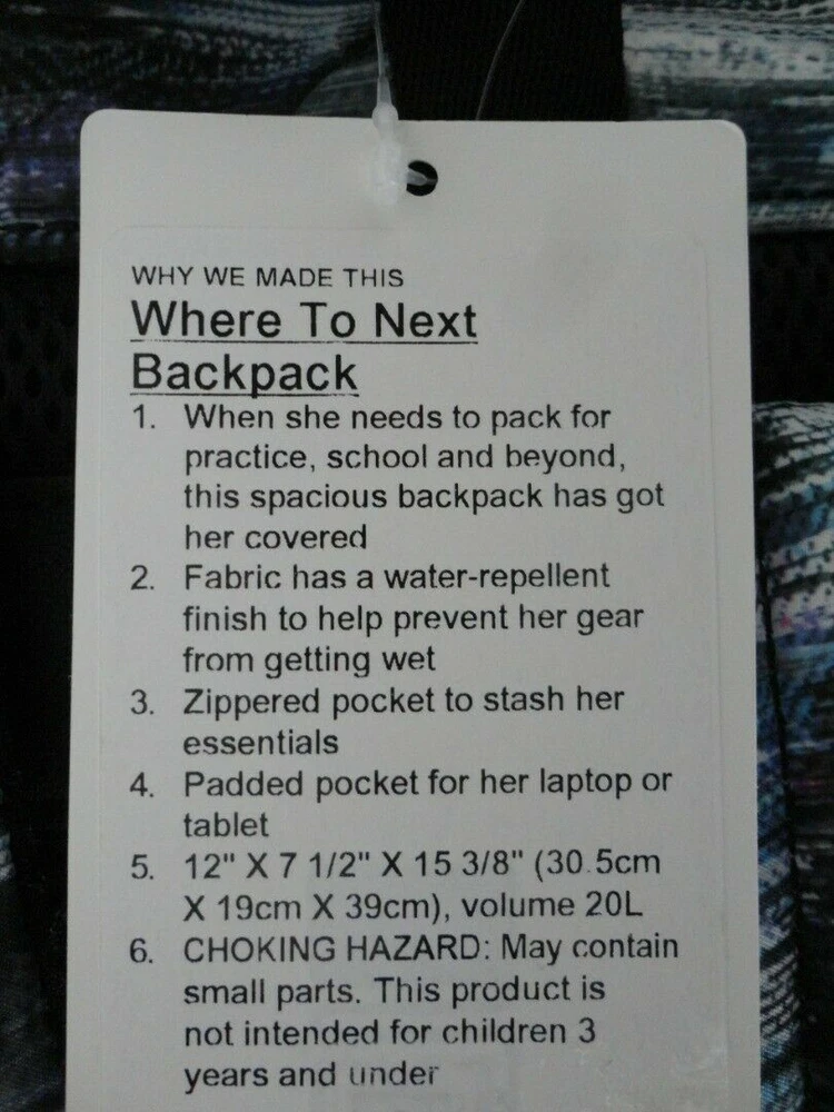 Brand: Ivivva by Lululemon Size: One Size Official Color: WVFT Condition: New With Tags Description: Where To Next Backpack When she needs to pack for practice, school and beyond, this spacious backpack has got her covered Fabric has a water-repellent finish to help prevent her gear from getting wet Zippered pocket to stash her essentials Padded pocket for her laptop or tablet 12″ x 7 1/2″ x 15 3/8″ (30.5cm x 19cm x 39cm), volume 20L CHOKING HAZARD: May contain small parts. This product is not intended for children 3 years and under Authenticity Guarantee All our items are 100% authentic, guaranteed! Payment We accept all forms of payment through eBay Managed Payments. Please make payment promptly after purchasing or once the auction has ended. Shipping We provide Free Shipping to the USA. Items are shipped via USPS/Canada Post and are tracked. For Canadian shipments, we provide discounted shipping. We ship via Canada Post and are tracked. For International shipments, we provide discounted shipping, please refer to the shipping cost on the listing once you have chosen your country. Returns We allow up to 30 days for returns. Item must be in the original condition that was shipped to you including any tags attached. All returns must be shipped via postal service, not UPS, FedEx or any other courier service. Please note that we detail the color as accurately as possible in our description and we take many pictures to show the item at different angles. However, the actual colors may vary in person due to different monitors and their settings. Taxes & Duties As a registered business we are required to collect taxes. All Canadian shipments are subject to the tax of their province. Taxes are based on the item and shipping. International Buyer's are responsible for their country's taxes and duties. Powered by Infinato.