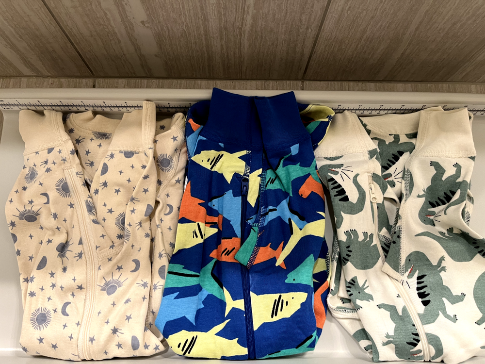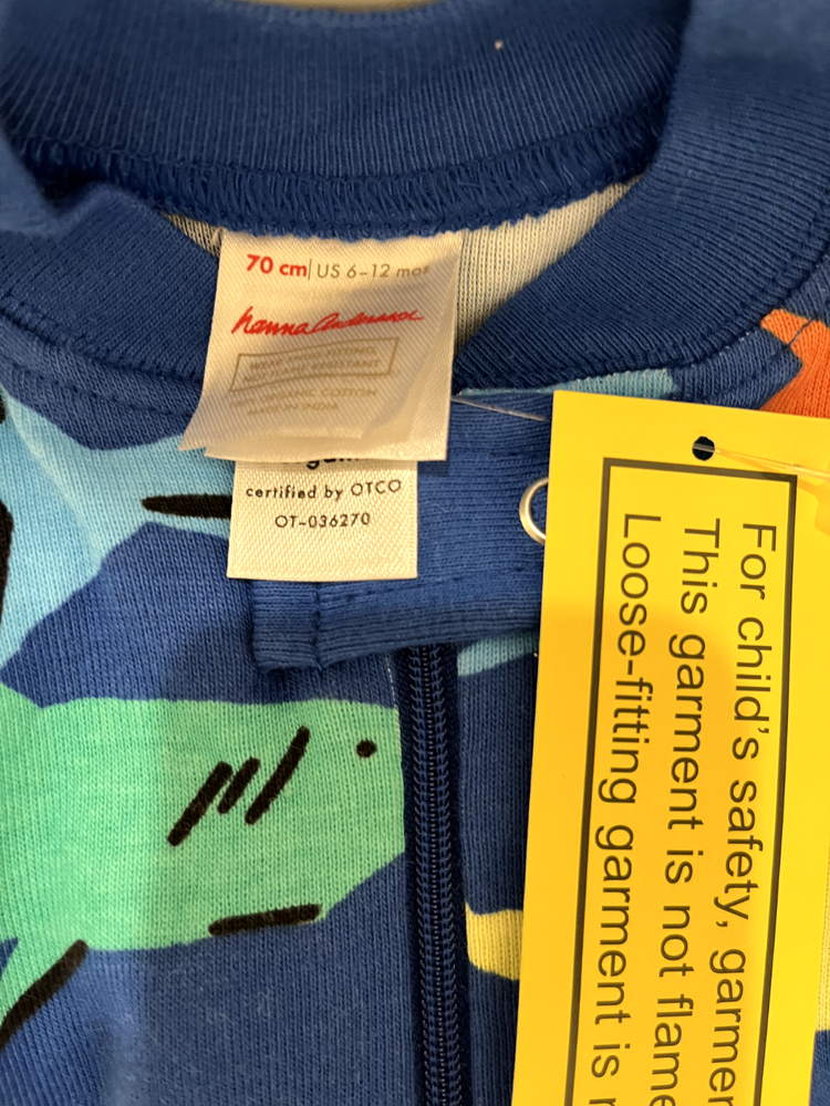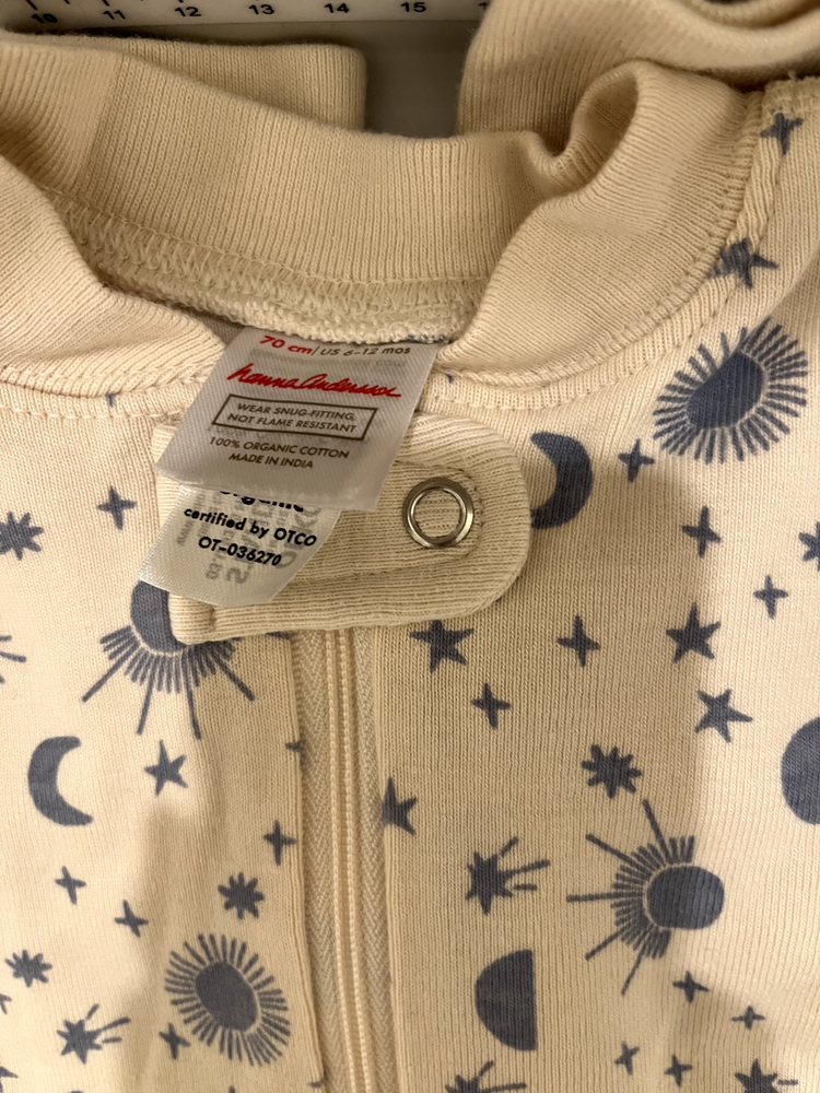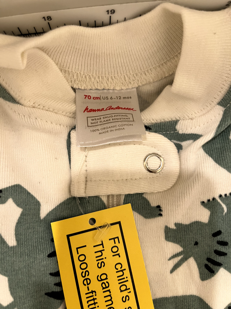 Lot of 3 Hanna Anderson Organic Cotton Pajamas Sleeper Footless 6-12m, double zipper making diaper change easy. Both dinosaur ones are new with tag, the stars one was washed and worn once for photos. Comes from a pet free and smoke free home.