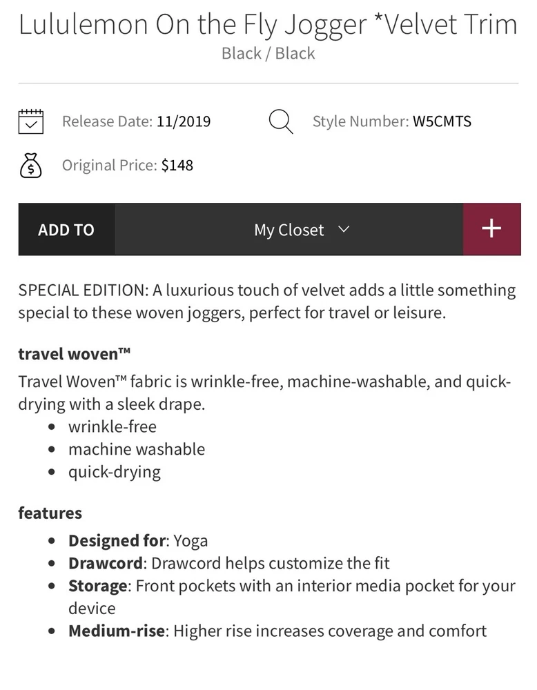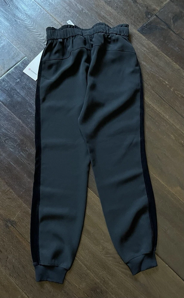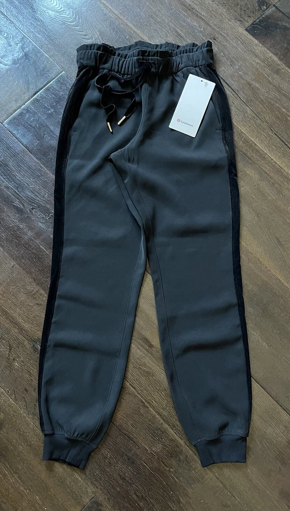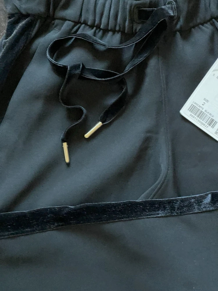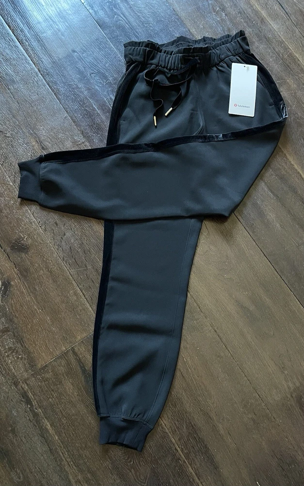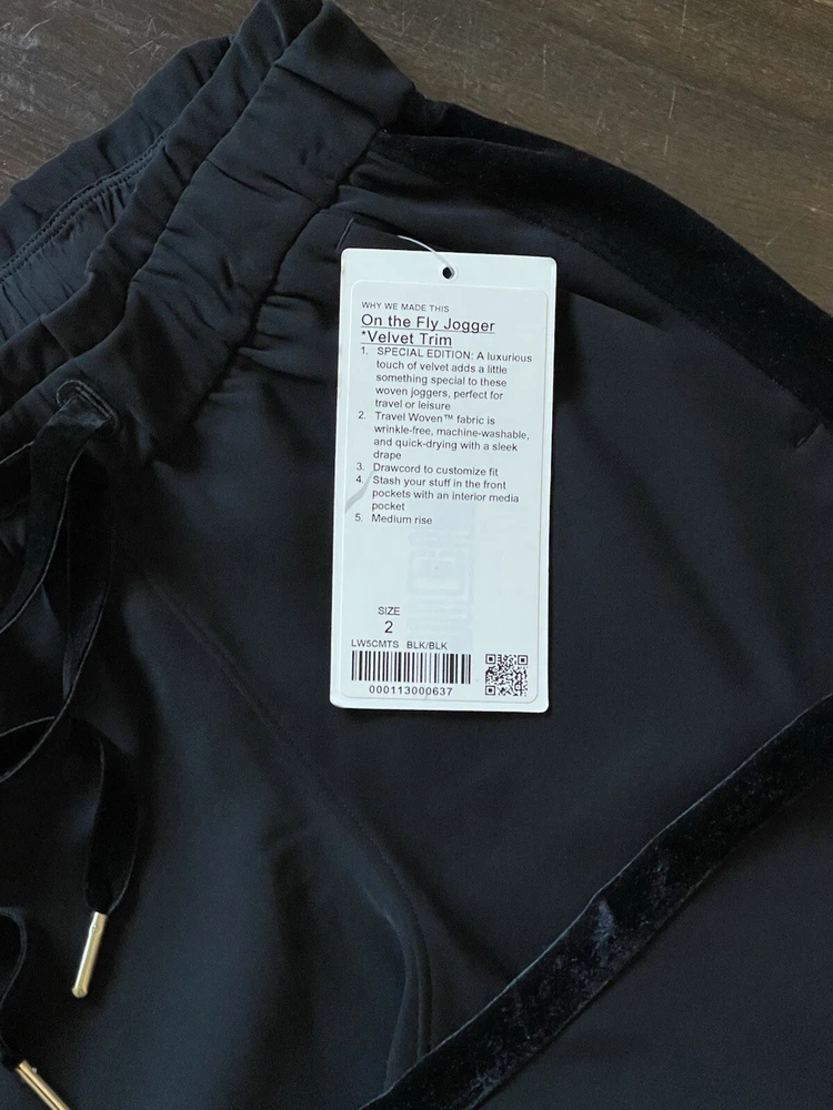 Lululemon On The Fly Jogger Holiday Edition Black Drapey fabric with Velvet trim and Velvet waistband drawstring so cute for a casual yet cute and comfortable holiday party outfit Retail $148 a luxury pant in a casual look Very hard to find w tags. I found the next size up or I would be wearing them. Side Pockets, relaxed fit True to size 2