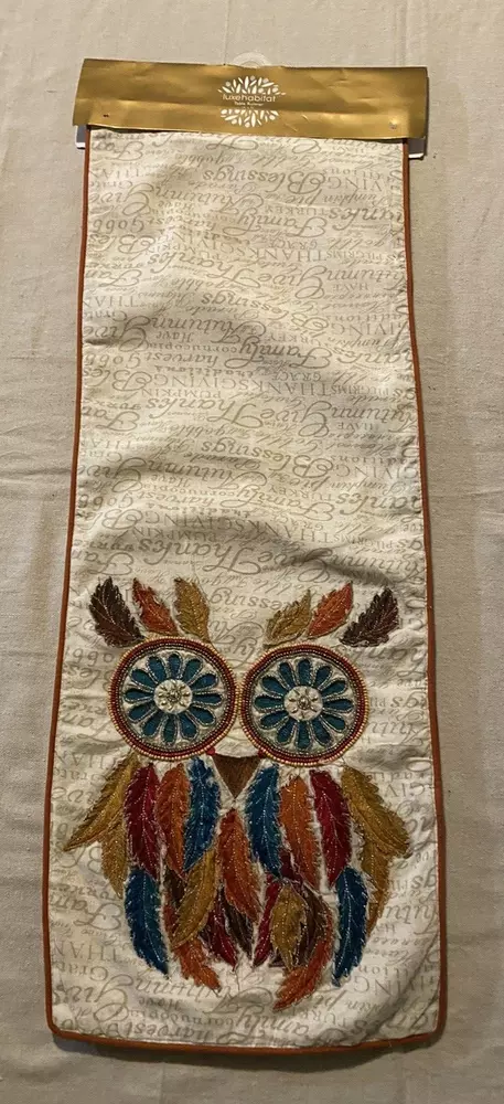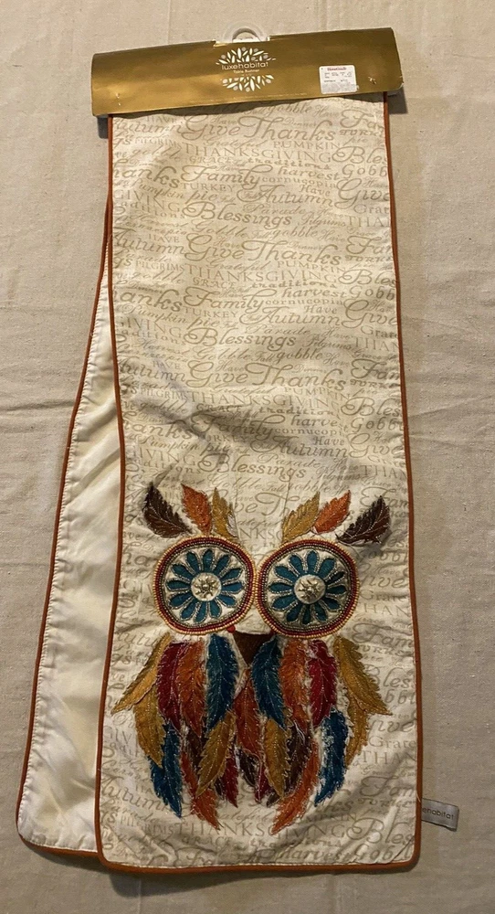 NWT Luxe Habitat Table Runner Boho Beaded Embroidered Owl Thanksgiving Fall Adorable beaded embroidered owl says "Thanks" & "Blessings", etc. Super cute! -Front: 85% Cotton/15% -Back: 100% Polyester -Spot Clean -SKU E24-438 -Measurements: 12' Wide x 68" Long Questions? Please ask. Ships next business day. Offers welcome.