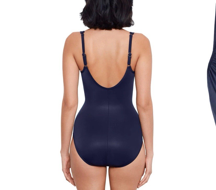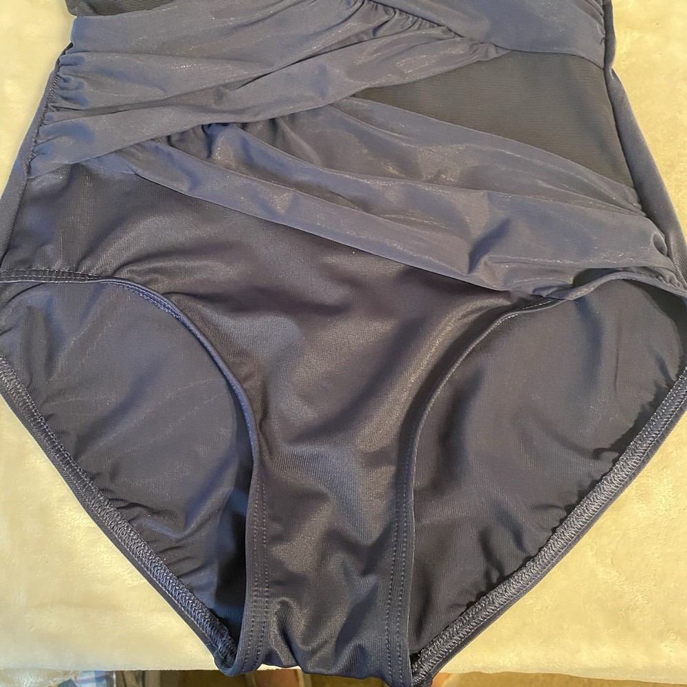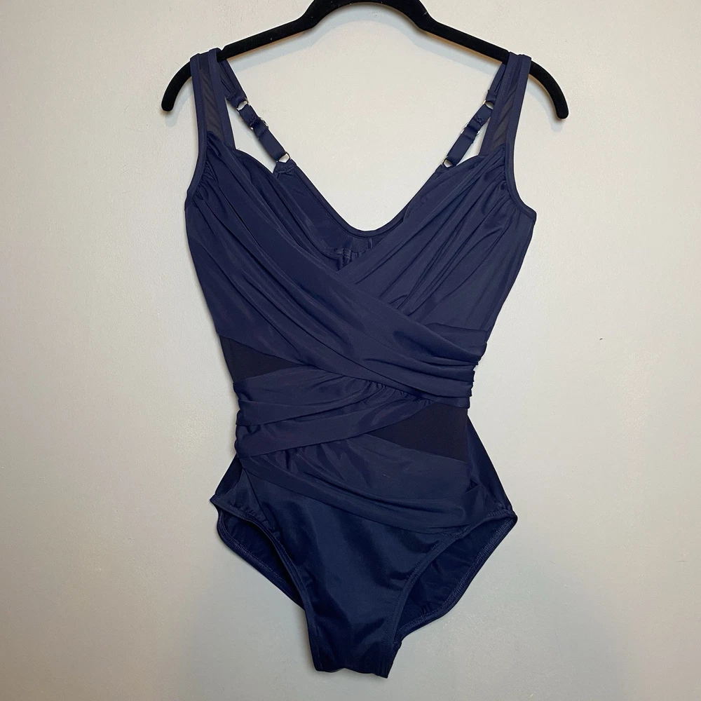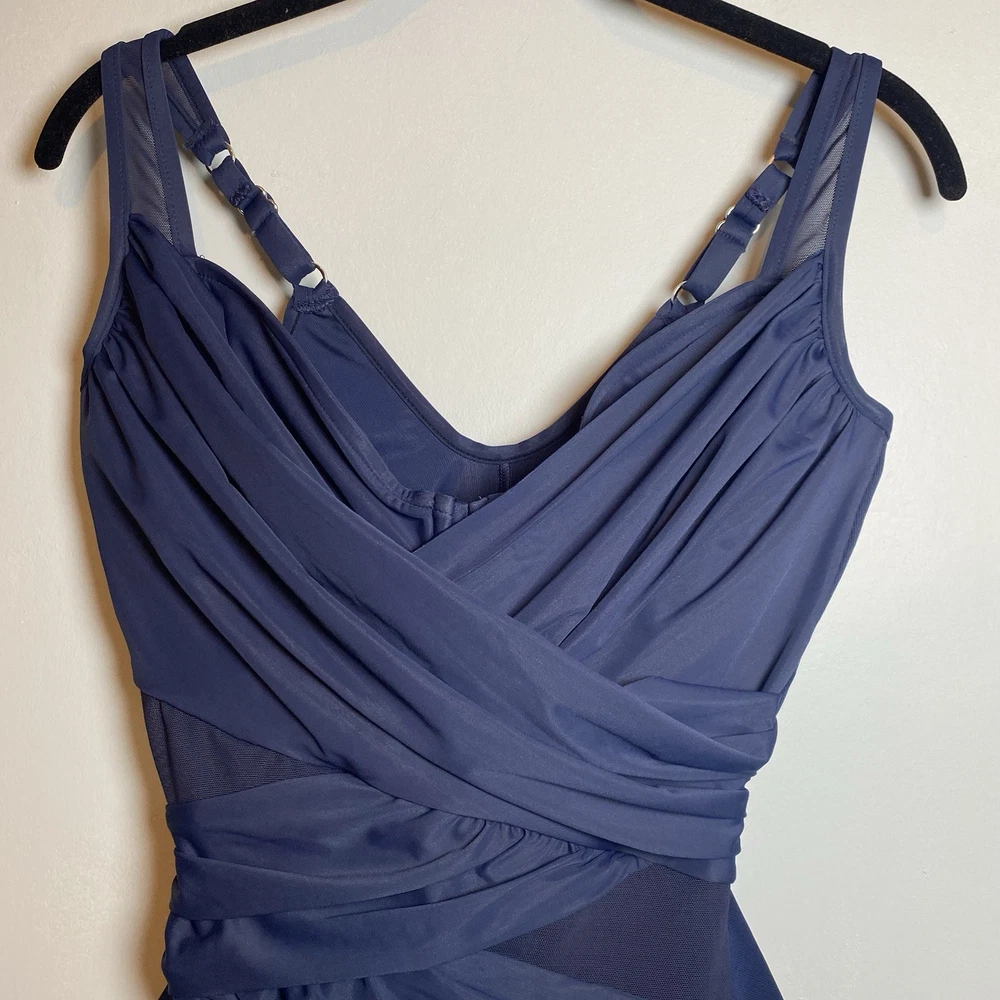 The Madero one piece features a stunning draped design with sheer panels. It’s thicker-set adjustable shoulder straps lead to a classic v-neckline. The shirring and peek-a-boo mesh detailing extends across the waist and hips providing undeniable coverage all-over control. A hidden underwire bra and scoop back work hand in hand to offer the support you crave in a solidly stunning one-piece. Underwire cups are lined with microfiber The neckline has covered elastic edges to keep in place Adjustable straps One piece provides full rear coverage New Smoke free Size 10 DD Cup Smoke free Fast shipping