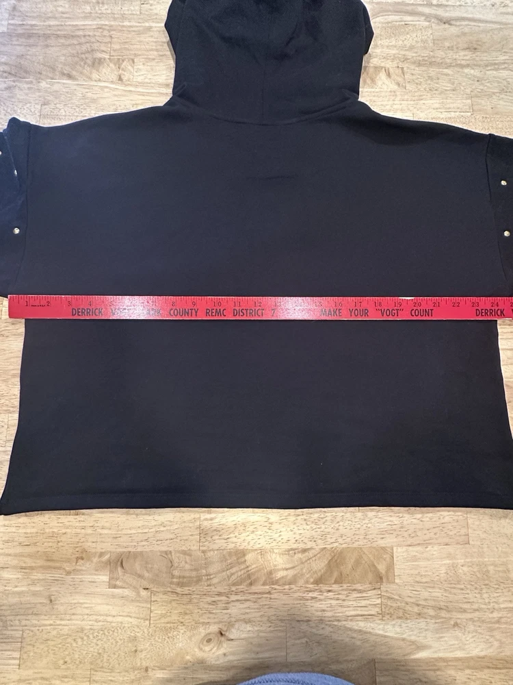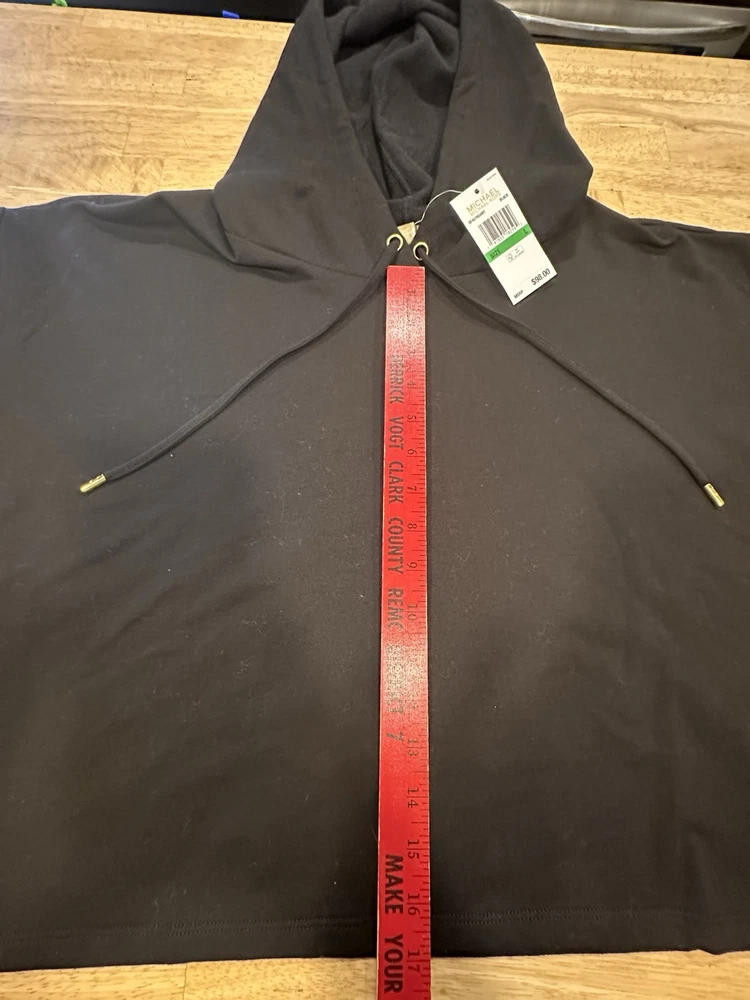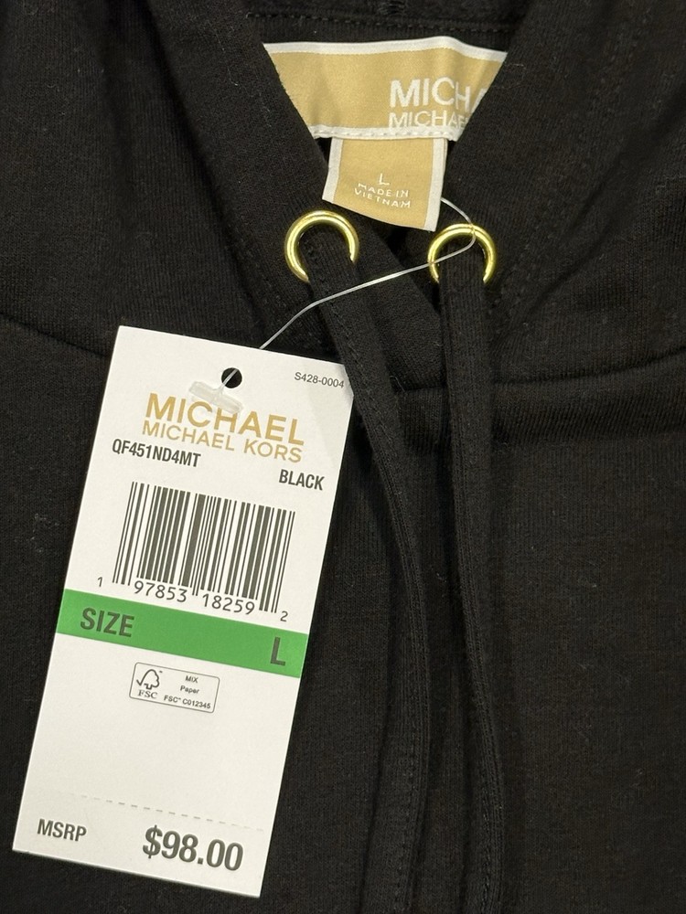 (1) Embrace the epitome of luxury and comfort with this Michael Kors women's hoodie, size large, a perfect blend of style and practicality for your casual outings. Crafted from a soft jersey fabric that combines cotton, polyester, and a hint of elastane, it promises a comfortable fit and easy movement. The hoodie features a round neckline, long sleeves, and a convenient pullover closure, making it an ideal choice for the transitioning seasons of fall, spring, and winter. The classic black hoodie is accentuated with a bold Michael Kors gold studs that exudes designer appeal, complements by subtle rhinestone/studded embellishments that add a touch of glamour to the casual ensemble. It's machine washable for easy care, ensuring that this garment remains a staple in your wardrobe for seasons to come. 07/24 brand new $98 value