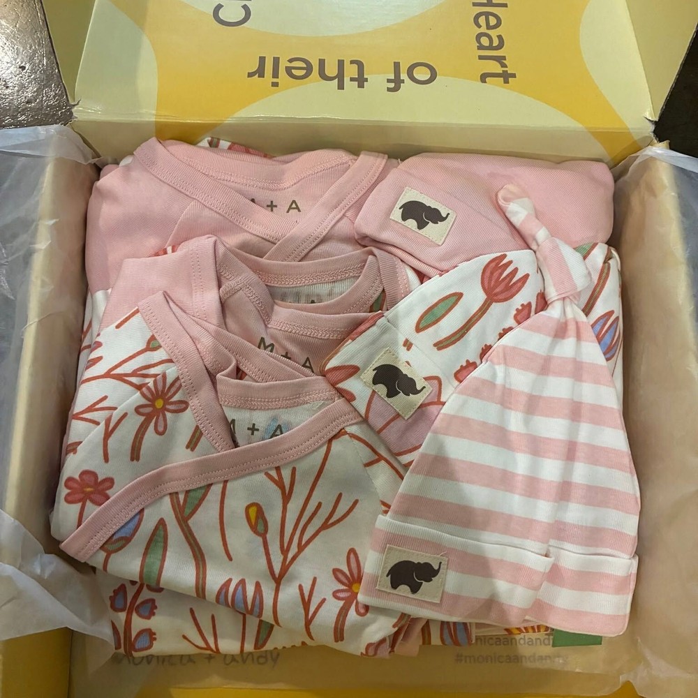 New in box Monica & Andy newborn gift set - contains layette, gown, 2 bodysuits, 2 tops, 2 leggings, 3 hats, 2 burp cloths, and a baby blanket. All clothes are size newborn (NB). Perfect gift for a baby shower or to prepare for your little one! The box in the photos has been opened to photograph, but you will receive a new box (only opened to check pattern).