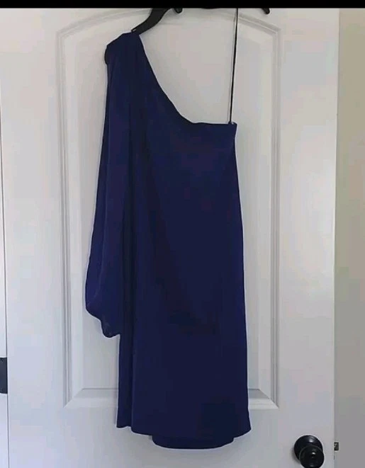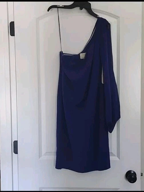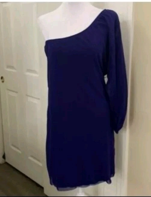 This stunning Nicole Miller Artelier silk dress is perfect for any occasion. The deep purple color and one-shoulder neckline add a touch of elegance to this mini dress, while the open sleeves and short length keep it playful and on-trend. The dress is made with high-quality silk material, ensuring both comfort and luxury. This dress is a size 4 and fits regular size types for women. Its brand, Nicole Miller, is well-known for creating high-end fashion that is both stylish and timeless. Perfect for a night out or a special event, this dress is a must-have for any fashion-forward woman's wardrobe. Model is not wearing this exact dress!!