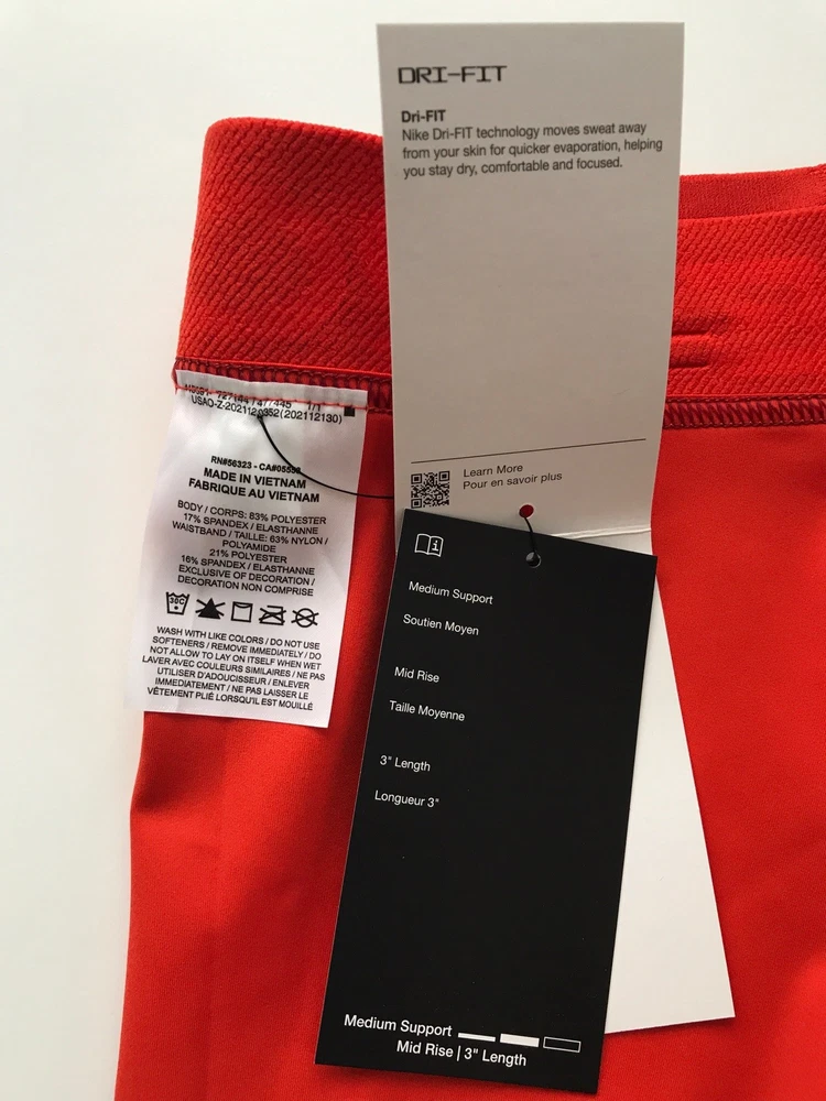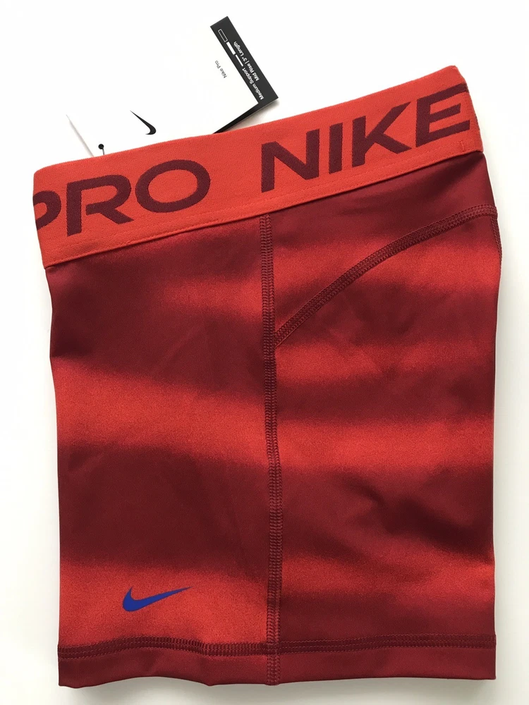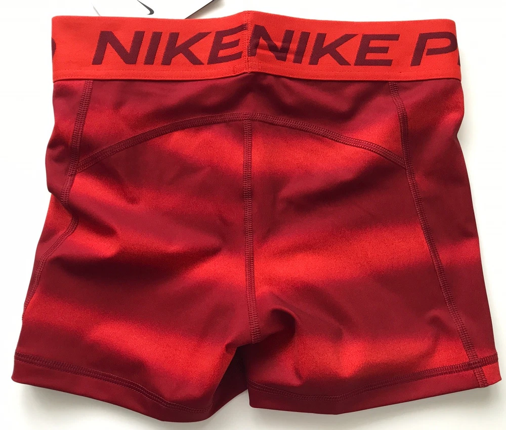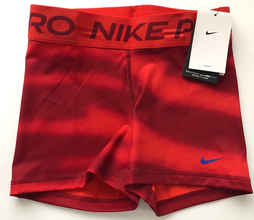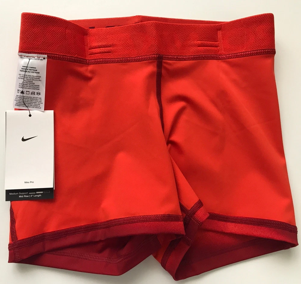 Nike Women's Pro 3” Shorts SUPPORTIVE AND STRETCHY. The Nike Pro Shorts are made with stretchy, sleek and supportive fabric that wicks sweat to help you stay dry and comfortable during your workout. Benefits Nike Dri-FIT technology helps you stay dry, comfortable and focused. A wide, mid-rise elastic waistband feels supportive around your core. Product Details New with tags. Color: Red Size: Women's S Medium support Tight fit for a body-hugging feel 83% polyester/17% spandex Machine wash Style: IH7636-633 Made in Vietnam