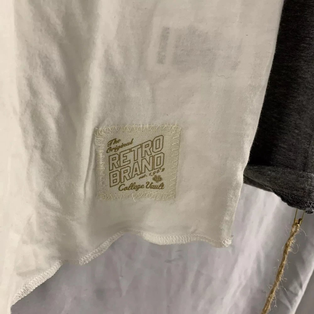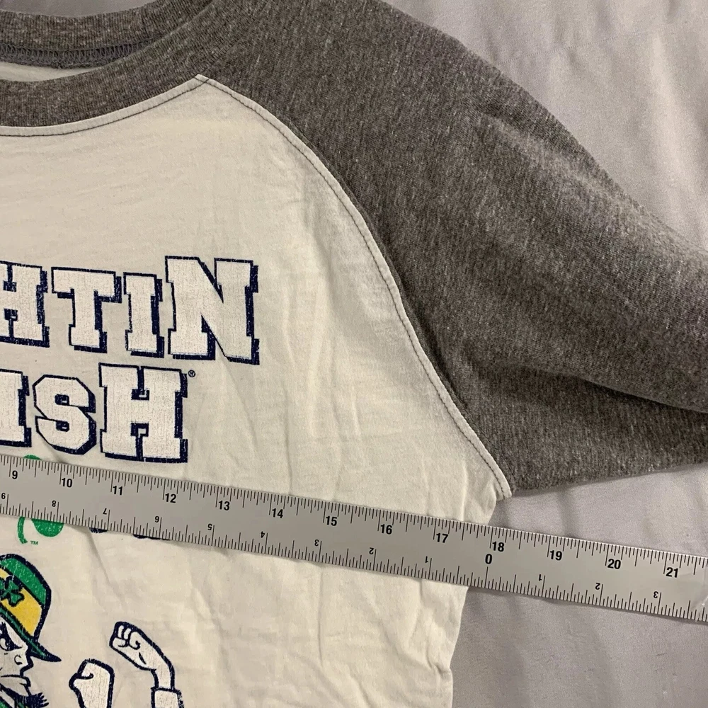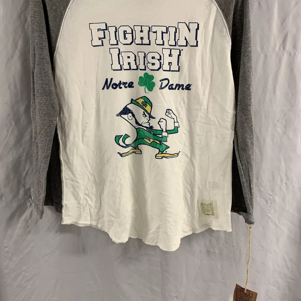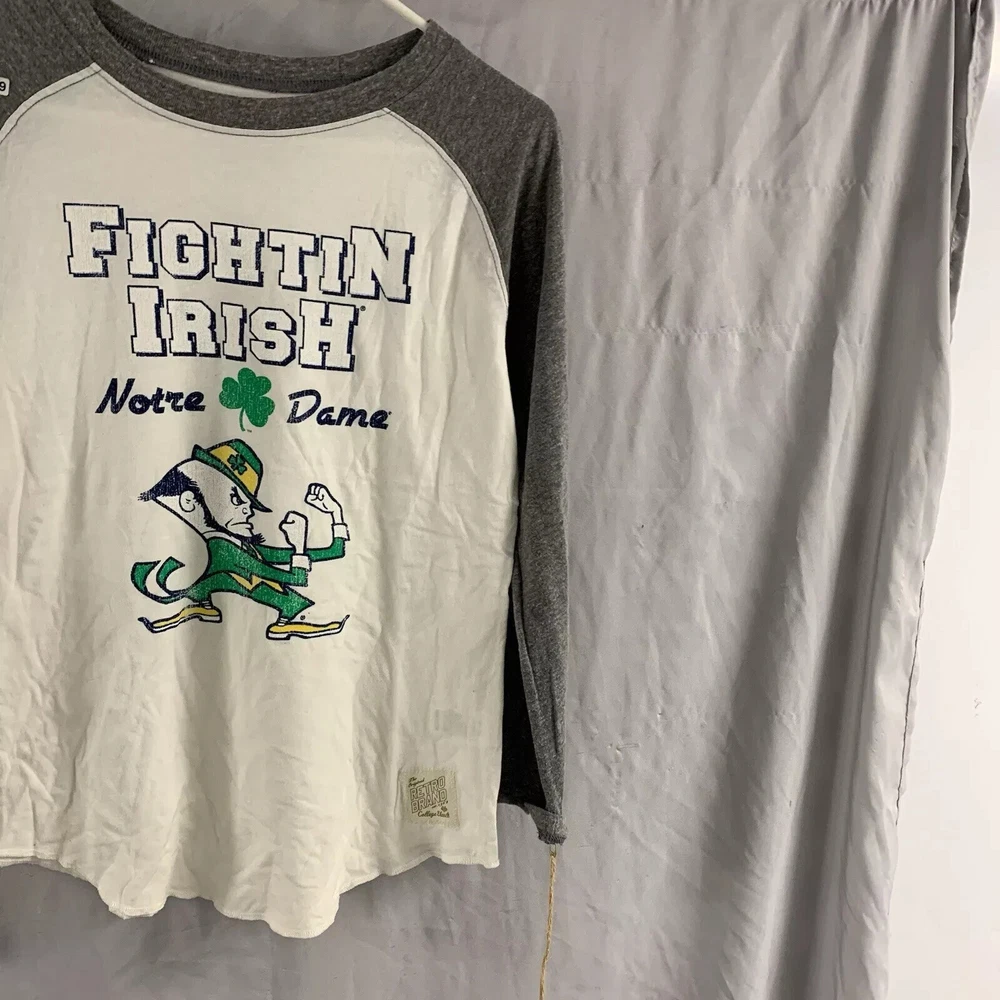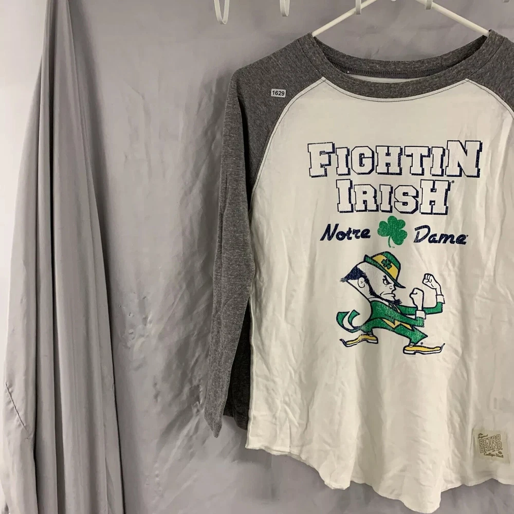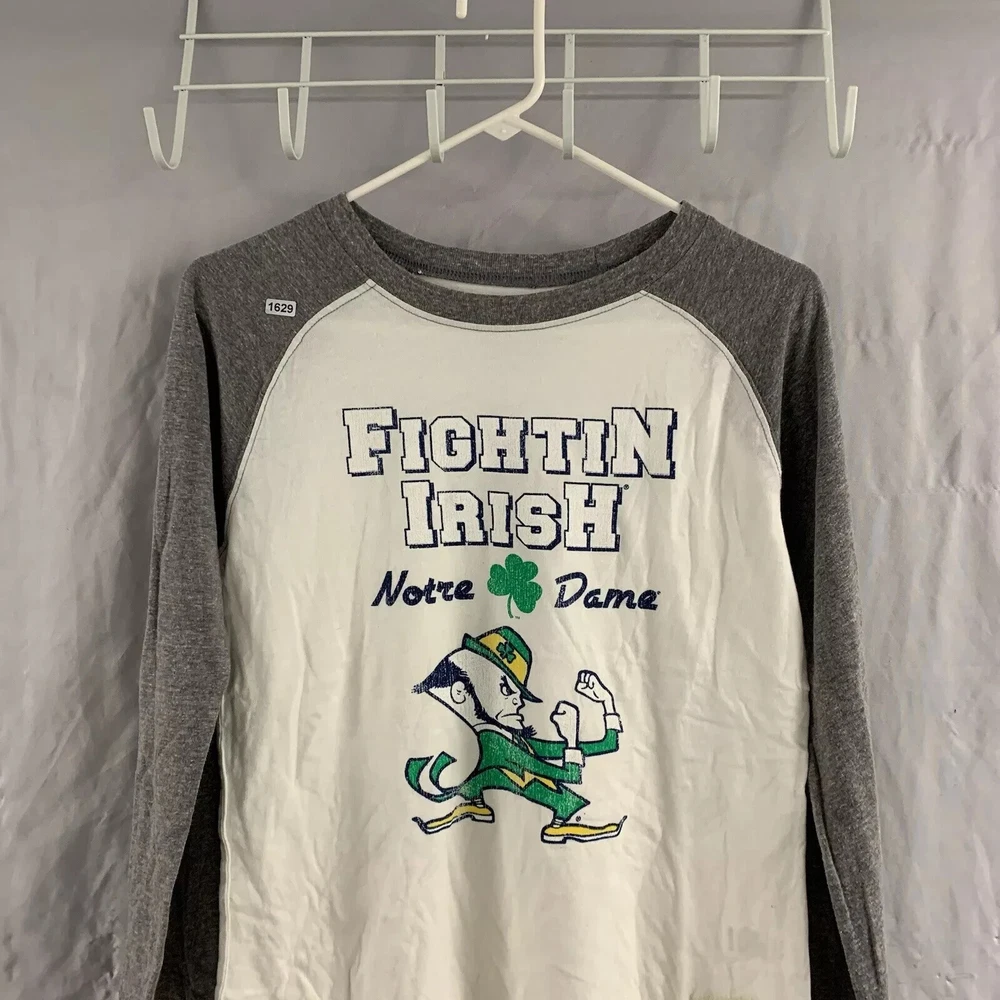 Show off your love for the Fighting Irish with this Norte Dame shirt from M & M. This retro-style t-shirt features a solid white color with blue accents, perfect for any fan of the team. The long sleeve crew neck shirt is made from a comfortable cotton and cotton blend fabric, with a knit texture and a lightweight feel. The shirt is designed with a variety of features, including a full zip hooded design, stretch and quick-dry capabilities, and a double-sided print. It's a limited edition item from the 1990s, perfect for collectors and fans alike. Whether you're wearing it to a game or just showing off your love for Norte Dame, this shirt is sure to be a hit.