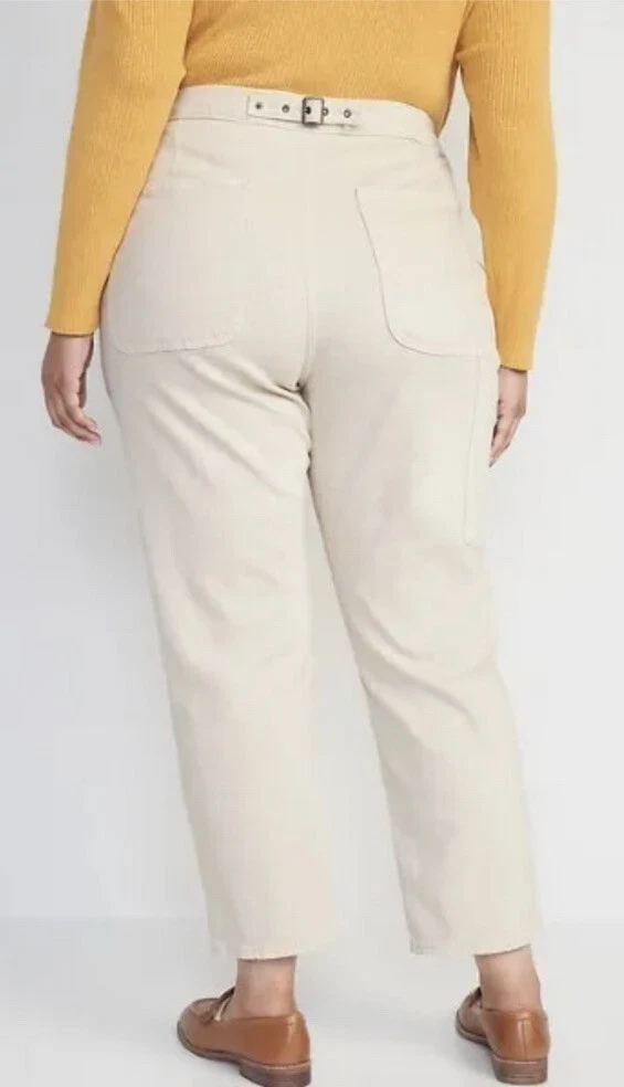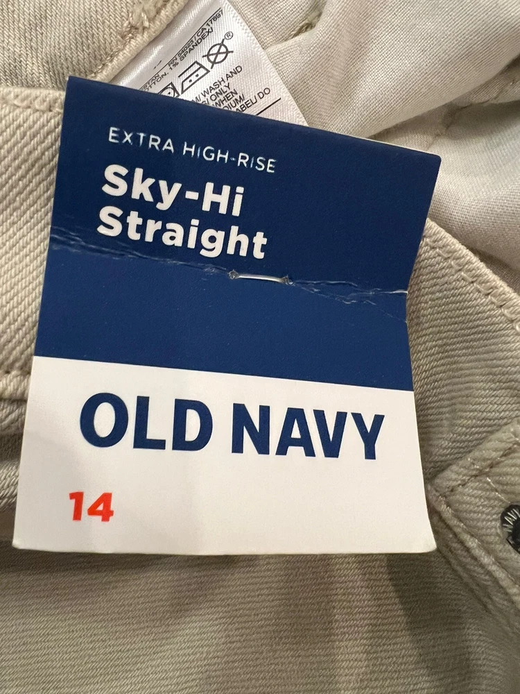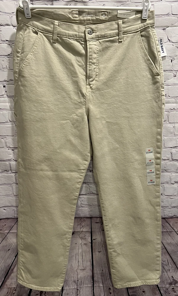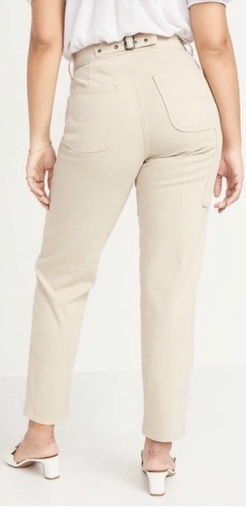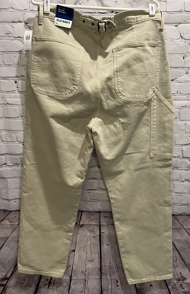 NWT Never Worn or Washed MSRP $40 Old Navy Women’s Beige / Sand Extra High Rise Sky-Hi Straight Secret-Smooth Pocket Cotton Blend Stretchy Denim Fabric 99% Cotton / 1% Spandex Adjustable Waist with Back Buckle Workwear Jeans Pants Size 14 Condition is New with Tag attached Please carefully check out all pictures and measurements Waist ~ 18” Rise ~ 13.5” Inseam ~ 28” Legs opening ~ 16” Shipped with Priority Mail 2338 Elevate your wardrobe with these versatile Old Navy pants in size 14. The extra high rise and tapered leg style create a flattering silhouette suitable for any occasion, while the beige color and solid pattern make them a classic addition to your wardrobe. With a zip and button closure, as well as multiple pockets, these cargo pants are both functional and stylish. Made with a comfortable cotton blend and stretch fabric, these pants are perfect for any season, whether it's winter, summer, fall, or spring. The buckle and zipper accents add a touch of detail to these easy-care, secret-smooth pocket pants. Perfect for school or uniform attire, these pants are sure to become a staple in your closet.