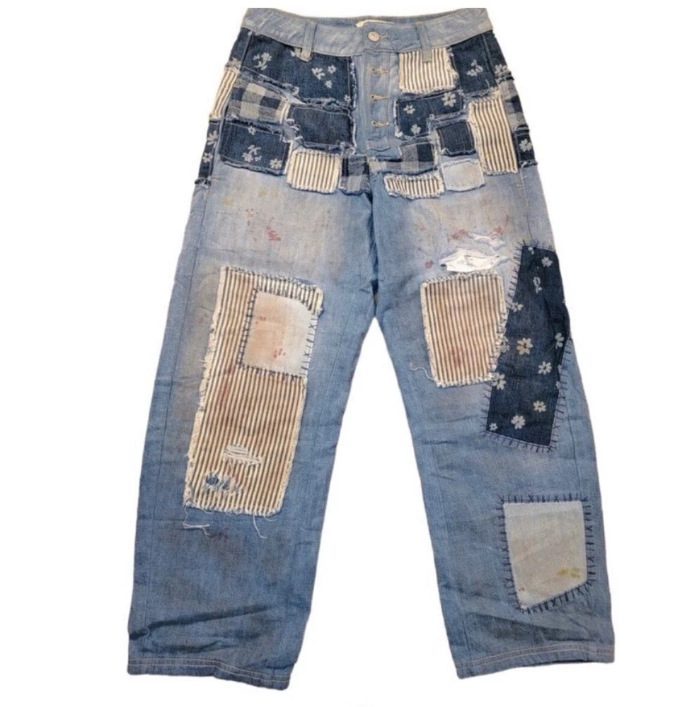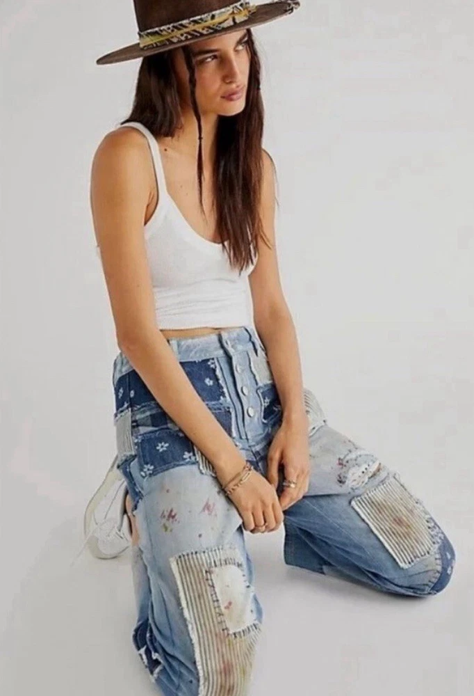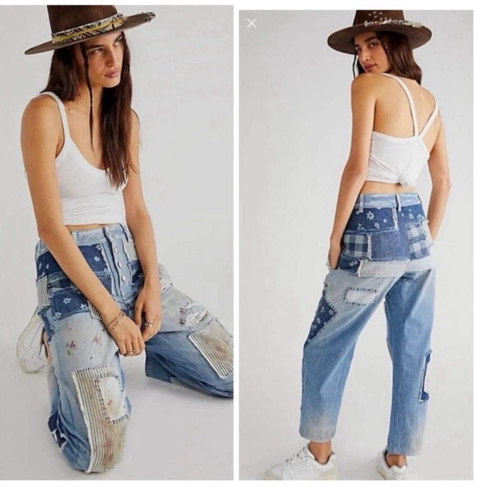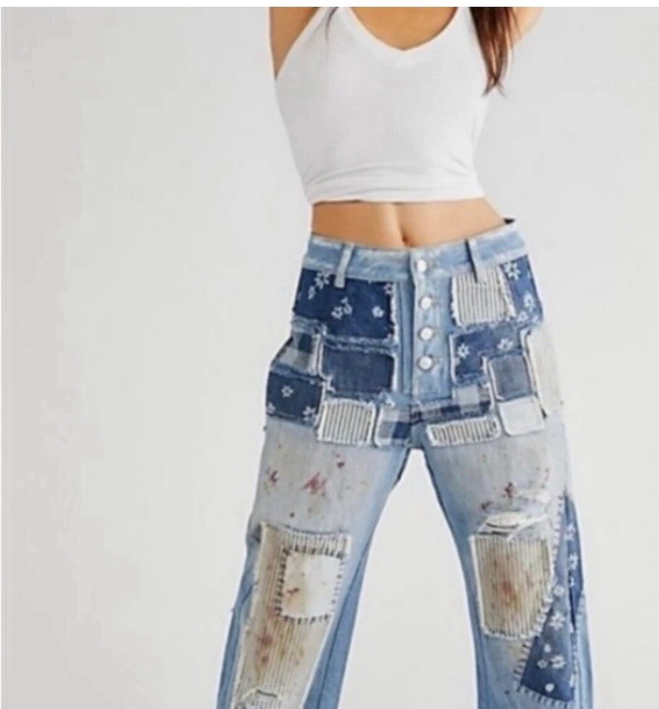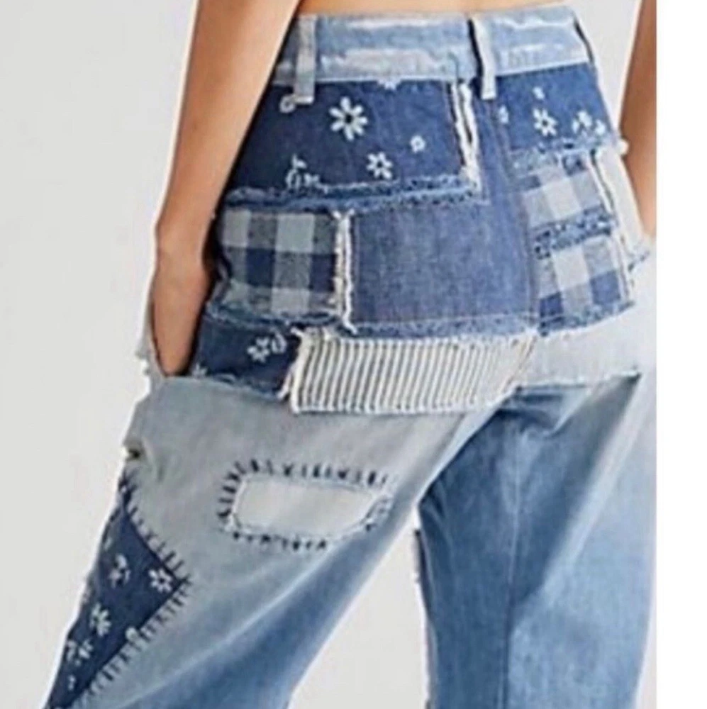 Free people x We The Free Azalea Daisy Patchwork Blue size 28 NWT Perfectly distressed and patchwork-inspired, these need-now jeans are featured in a high-rise, straight silhouette with mixed print patches, raised seaming, and paint-splatter detailing throughout for added dimension. Exposed button fly Flat front and back Belt loops at waist Rigid denim fabrication We The Free Heritage inspired and lived-in staples. We The Free is an in-house label. Care/Import Machine Wash Cold Import Measurements in lying flat Rise 13” Waist 30” Inseam 27 New with tag. Never worn.