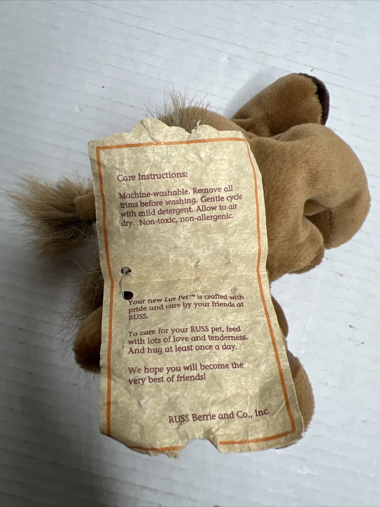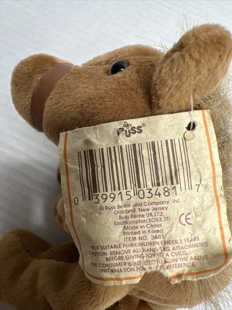 This adorable 6" plush stuffed animal is perfect for any occasion. With its soft and silky fur, it's sure to be a hit with kids and adults alike. The Russ Berrie brand is known for their high-quality stuffed animals, and this one is no exception. Featuring a beautiful brown color and a small size, this horse is great for cuddling or as a decorative piece. It's also washable, making it easy to keep clean and healthy. Whether you're looking for a gift for a child or just want to add to your collection, this Russ Berrie Silky the Horse Beany Bunch is a must-have.