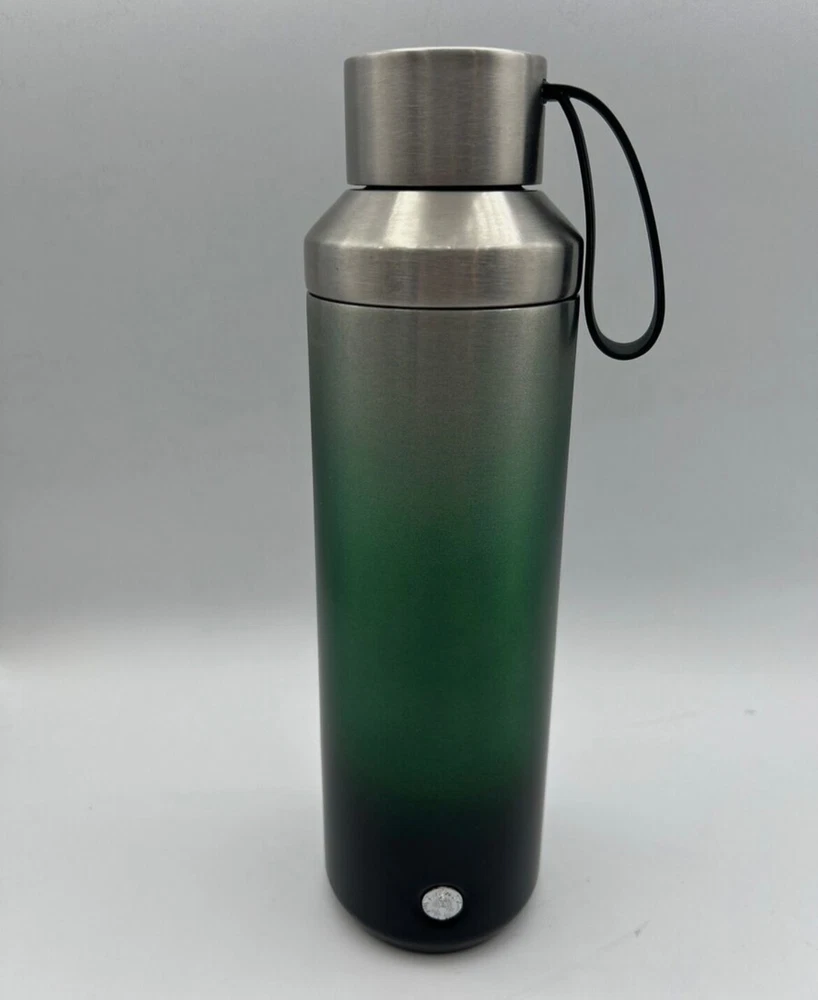 This Starbucks stainless steel water bottle is the perfect addition to any collection. With a 20 oz capacity, it's perfect for on-the-go use. The green ombré design adds a pop of color to any outfit. The rubber hook ensures it stays securely in place. It has a clever design that can unscrew in the middle to be used as a cup. Keeps liquid cold for up to 12 hours!