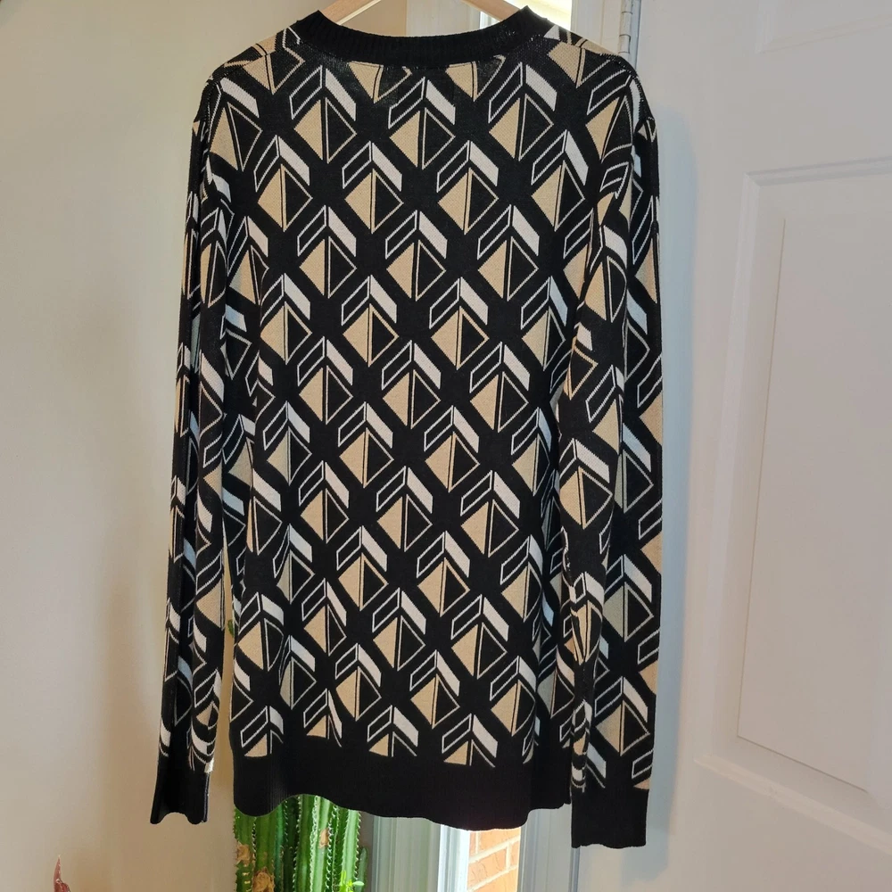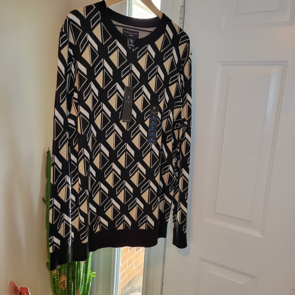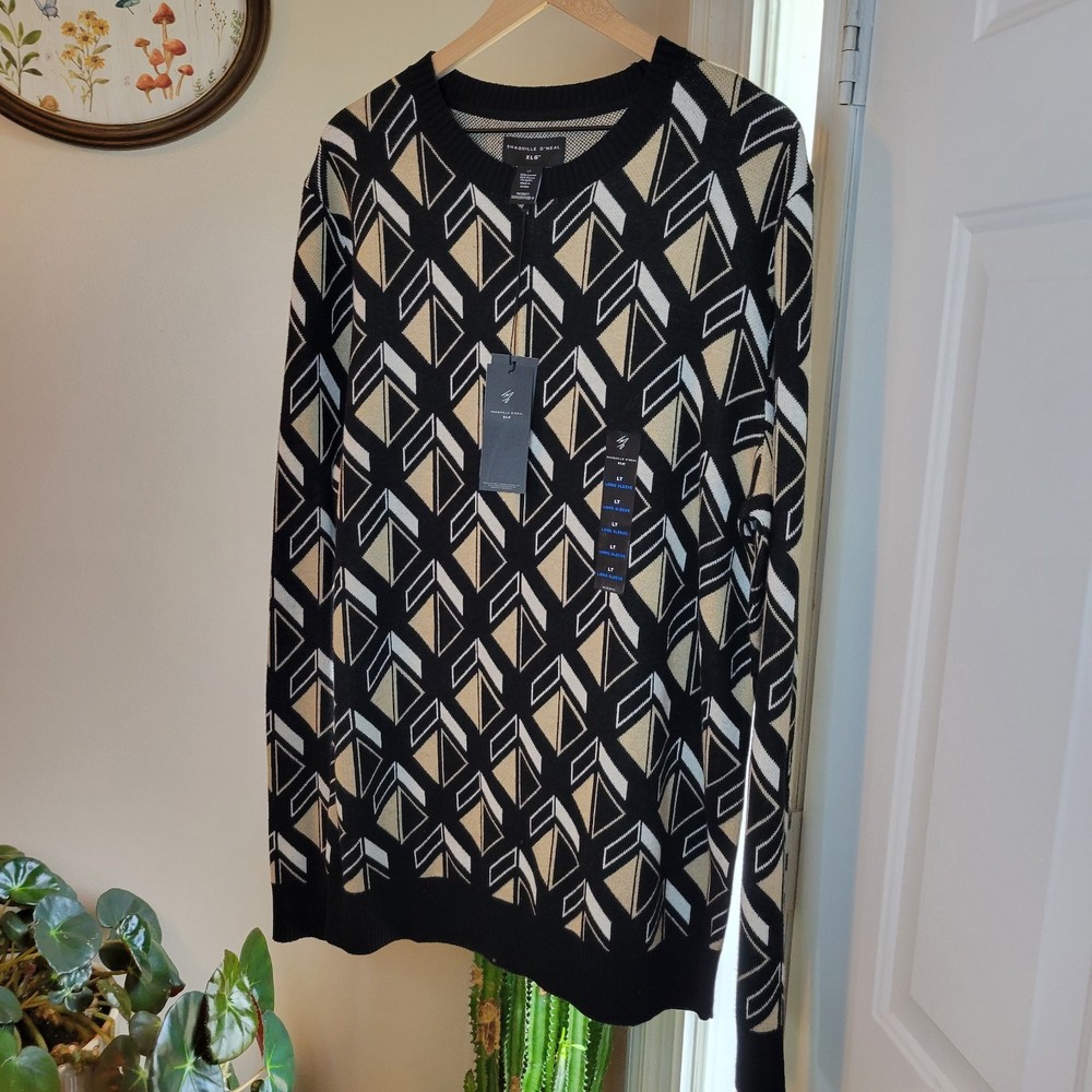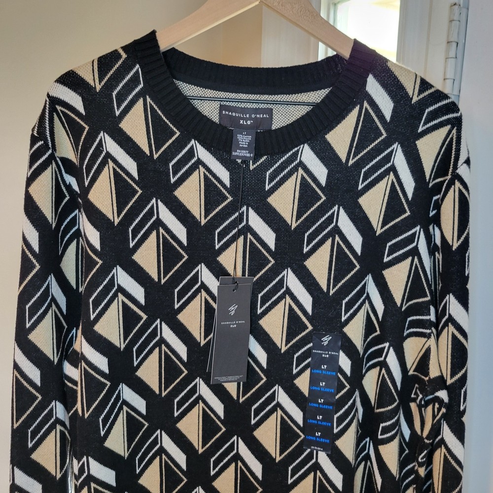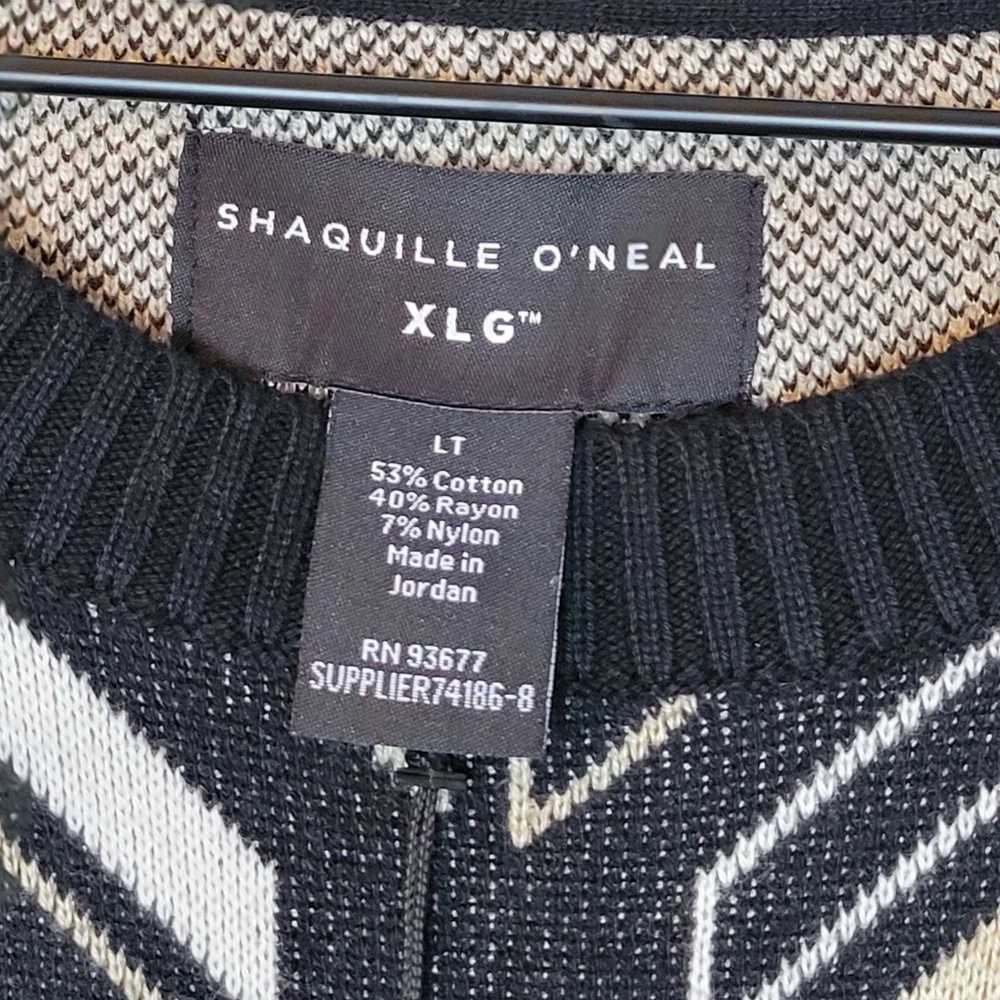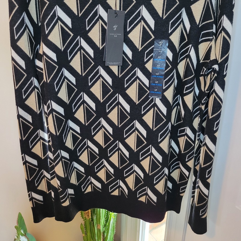 The NWT Shaquille O'Neal Chevron Printed Heavy Black/Cream Sweater in size L Tall is a stylish and versatile piece for men. This tight-knit sweater features a geometric pattern in beige and black, making it suitable for various occasions such as travel, parties, casual outings, and business meetings. Crafted from a blend of nylon, rayon, and cotton, this pullover sweater is machine washable for easy care. Designed for tall men, it has a classic style and features long sleeves with a crew neckline for a comfortable fit. Perfect for the winter, fall, and spring seasons, this sweater is a must-have addition to any wardrobe.