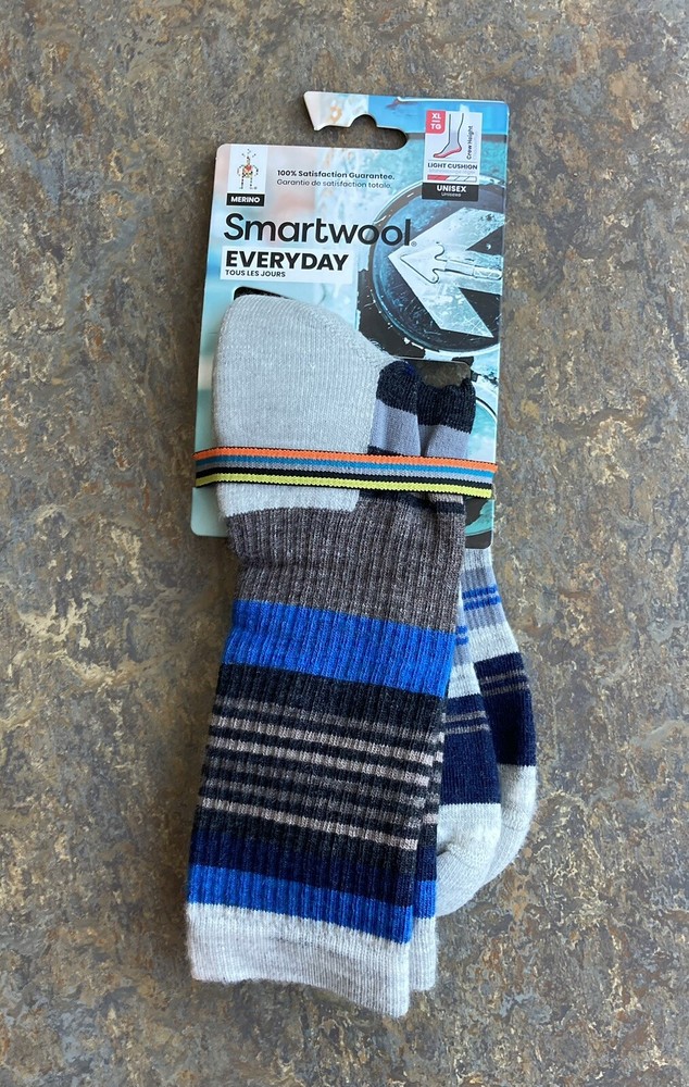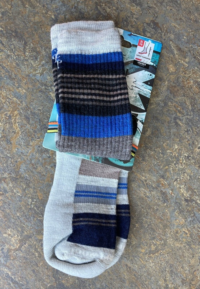 SmartWool light Cushion Perfect Fit Striped Hiking Socks Pale Gray with Rainbow stripes Size XL Super Breathable. Moisture Control. Odor Resistant. Stay in Place Fit. Protects from Blisters. Size XL men 12-14.5 US 52% Wool, 28% Recycled Nylon, 17% Nylon, 3% Elastane. Suggested Retail: $23.00 Made in USA!