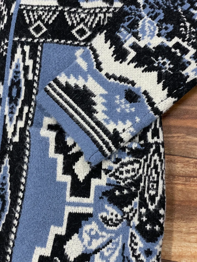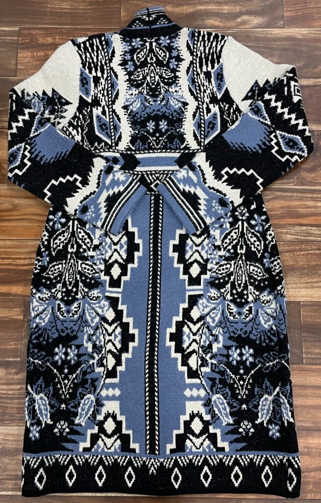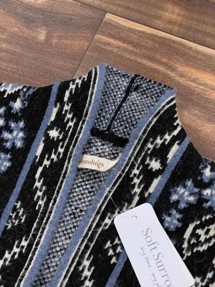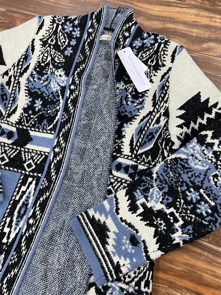Country/Region of Manufacture: China Sleeve Length: Long Sleeve Color: Blue Garment Care: Dry Clean Only Fabric Type: Knit Fit: Regular Style: Cardigan Department: Women Season: Fall, Winter Type: Sweater Features: Open, Pockets Pattern: Geometric Theme: Western Size Type: Petites Material: 45%Acrylic, 37%Polyester, 16%nylon, 2%Spandex Size: 1X Brand: Soft Surroundings