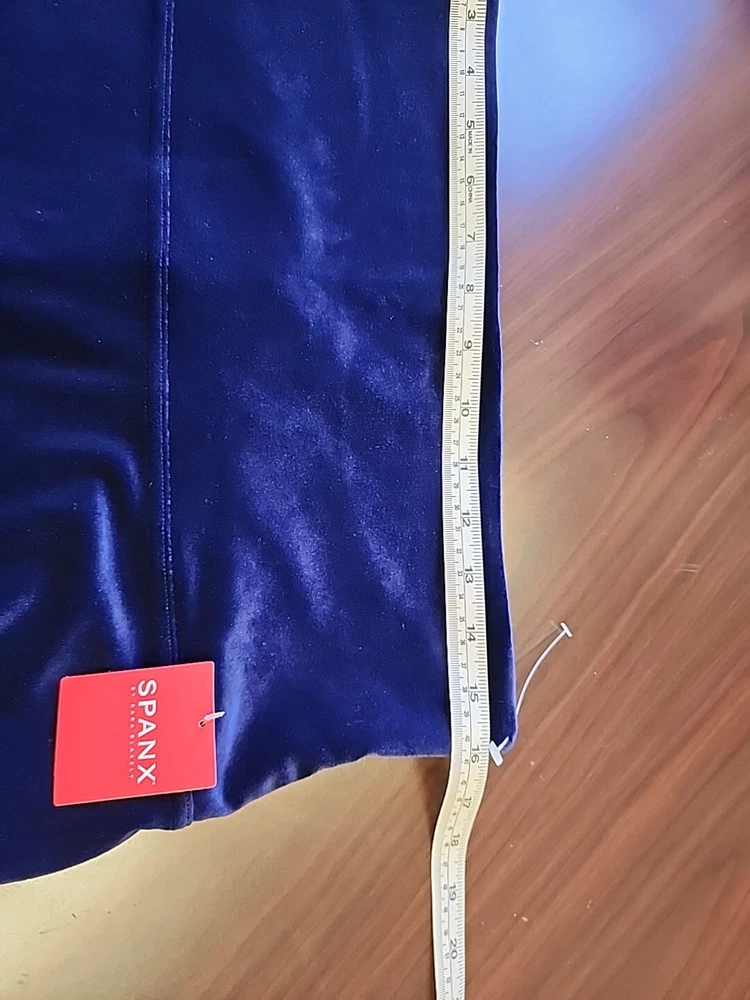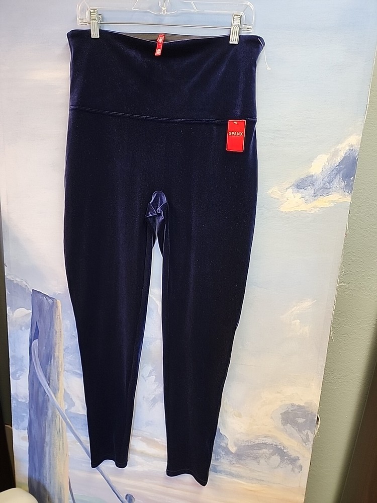 This NWT Spanx leggings in size 2XL are crafted in a luxurious navy blue velvet fabric, featuring a high rise waist with a 32-inch (un-stretched) waist size. The leggings offer a slimming and shaping fit with stretch capabilities, perfect for various occasions such as travel, parties, or casual outings. Ideal for winter, fall, or spring, these ankle-length leggings from the Spanx by Sara Blakely collection are designed for comfort and style, suitable for activities like walking, dancing, or yoga.