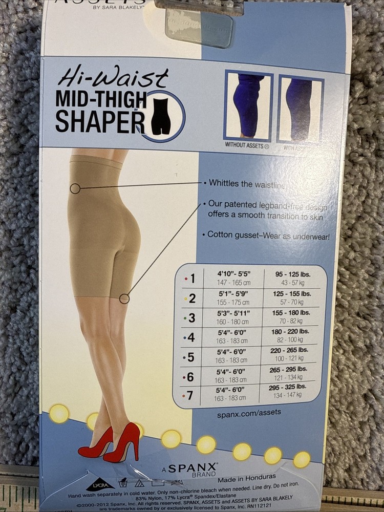 The NWT Spanx Mid-Thigh Shaper in size 4 is a shaping bottom shapewear designed for women. It provides compression in key areas such as the buttocks, waist, abdomen, and legs, helping to smooth and shape the body. The nude beige color adds versatility to the garment, making it a great option for everyday wear. Made in Honduras, this shaper is recommended for hand wash to maintain its quality. Perfect for those looking to enhance their silhouette and achieve a more flattering figure.