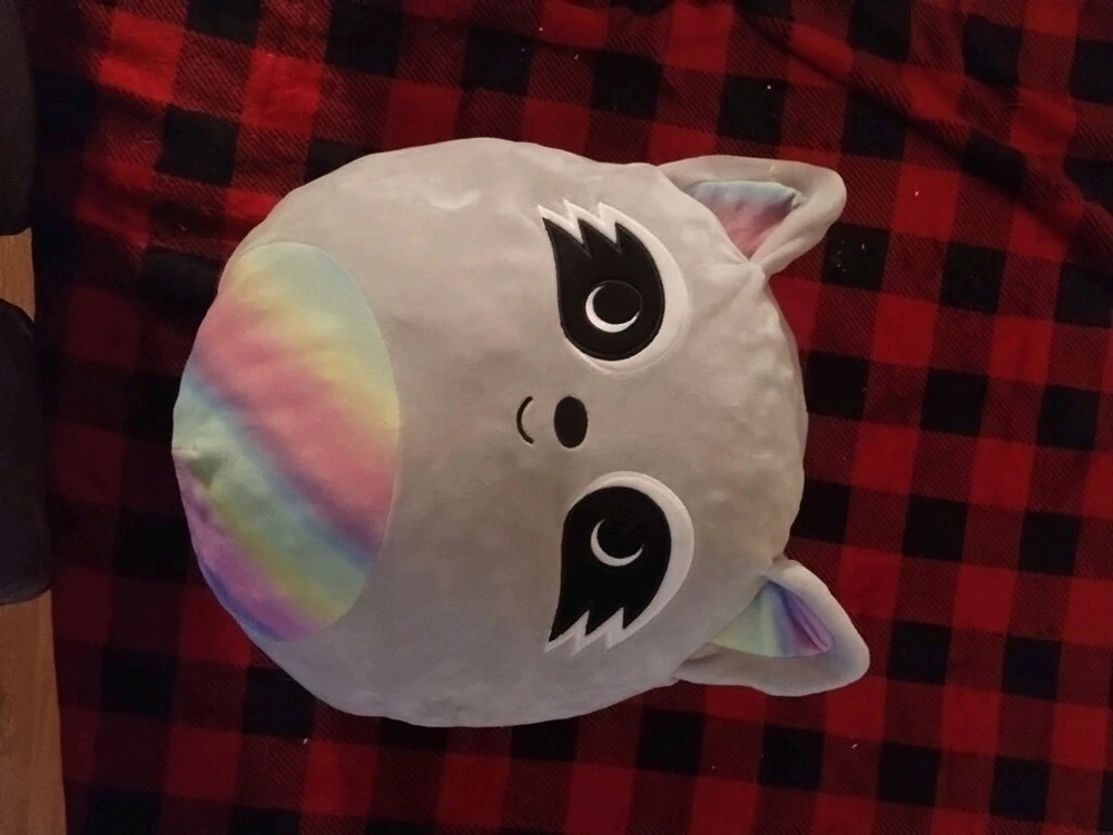 This is a 2021 Kellytoy Squishmallows plush of Max the Raccoon. Max is a medium-sized (16”) gray raccoon with a rainbow belly and ears. He is part of the Squishmallows character family and is recommended for ages 3 and up. Max is washable and suitable for various age levels, making him a cuddly and colorful addition to any collection.