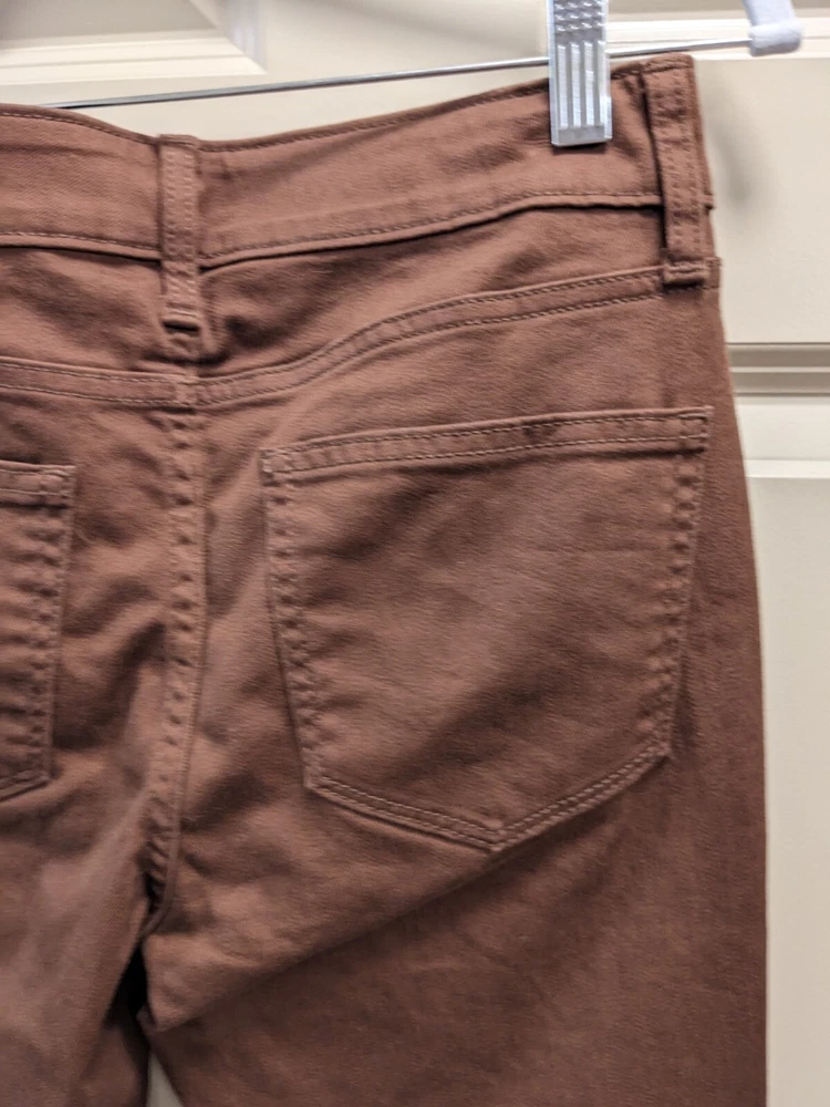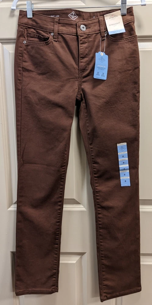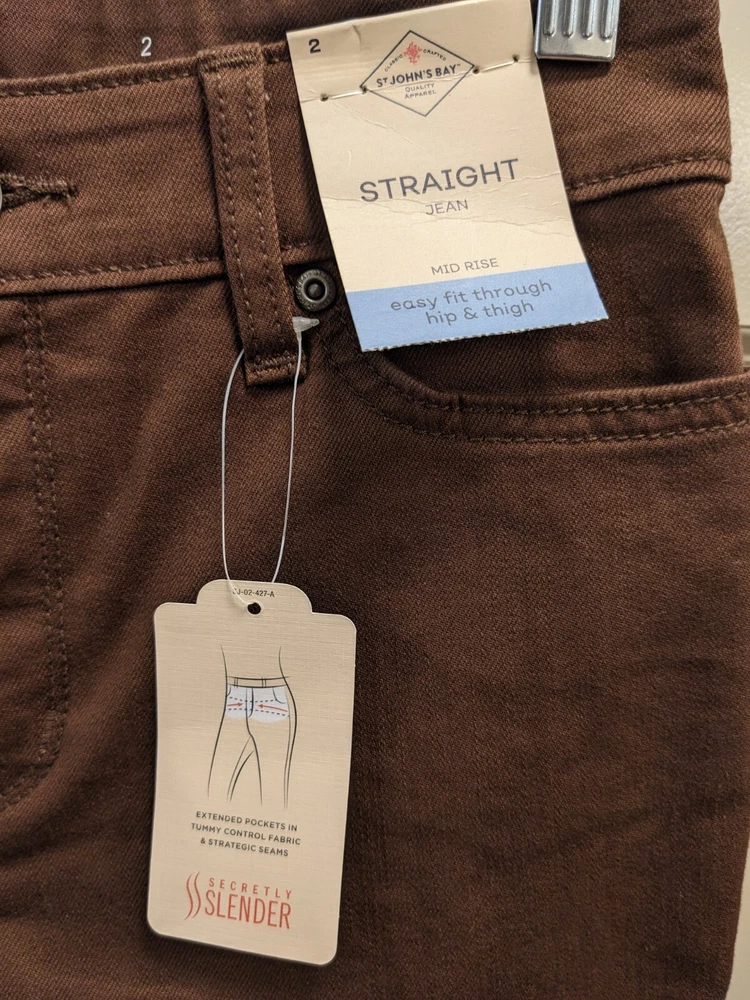 NWT: St. John's Bay Brown Straight Leg Jean Pants - Size 2, midrise, easy fit through hip and thigh wide comfortable waistband, hidden elastic waistband in back adds extra comfort with no gap, extended pockets and tummy control fabric and strategic seams are slimming, soft fine wale corduroy, five pocket design, button / zipper front closure. 75% cotton, 23% polyester, 2% spandex. MSRP $46 Measurements: Waist laid flat - 14 in Length-41 in Inseam - 31 in **Please note I have several other pairs of the same pants in different colors for sale. Message me if interested in combining for a discount on price and combined shipping.