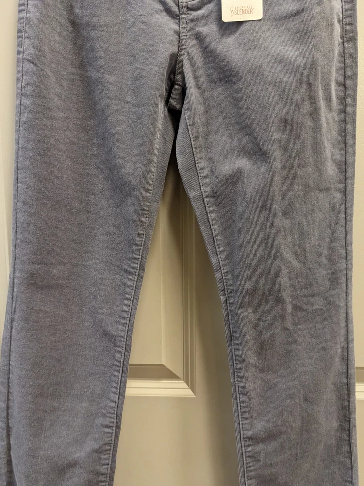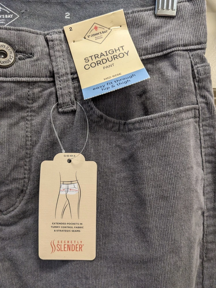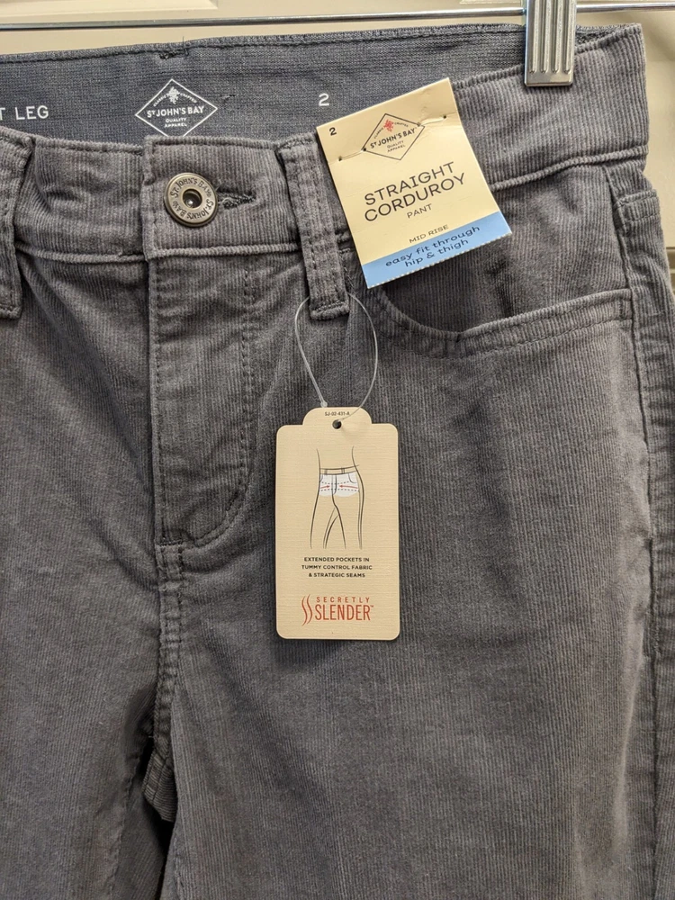 NWT: St. John's Bay Gray Straight Leg Corduroy Pants - Size 2, midrise, easy fit through hip and thigh wide comfortable waistband, hidden elastic waistband in back adds extra comfort with no gap, extended pockets and tummy control fabric and strategic seams are slimming, soft fine wale corduroy, five pocket design, button / zipper front closure. 75% cotton, 23% polyester, 2% spandex. MSRP $46 Measurements: Waist laid flat - 14 in Length-41 in Inseam - 31 in **Please note I have several other pairs of the same pants in different colors for sale. Message me if interested in combining for a discount on price and combined shipping.