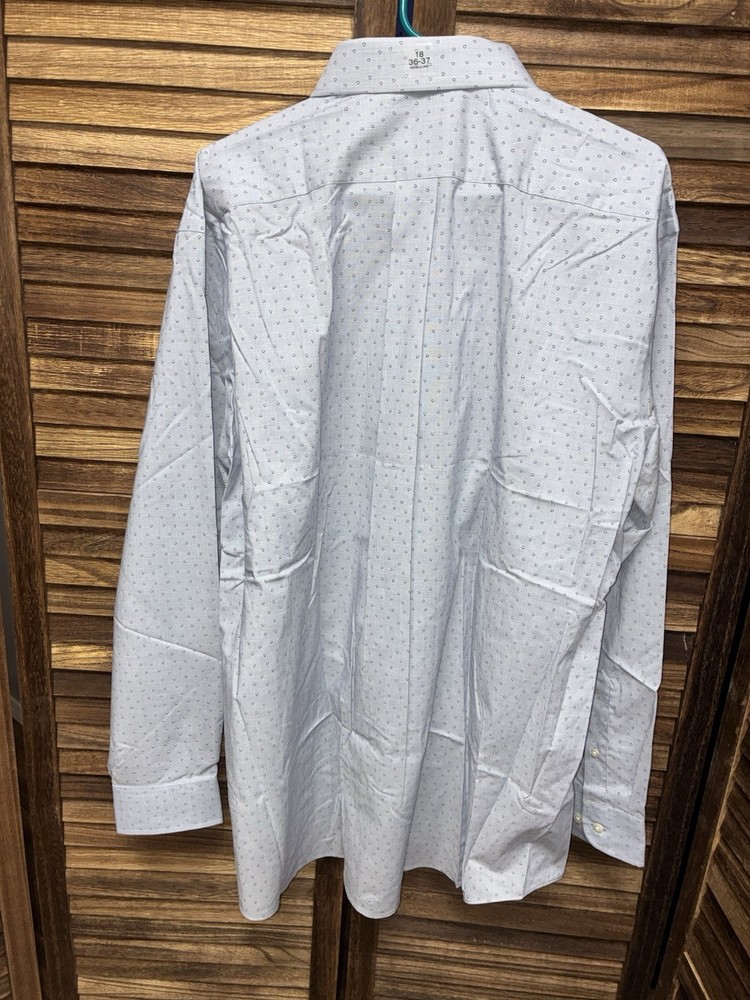 Brand: Stafford Collection: Easy Care Broadcloth / Stretch Comfort Size: 18" Neck, 36-37" Sleeve Length Color/Pattern: Light Blue "EOE Triangle" (Blue geometric triangle print) Material: 60% Cotton, 40% Polyester Features: Single front chest pocket, pointed collar, and a wrinkle-resistant finish for "easy care".