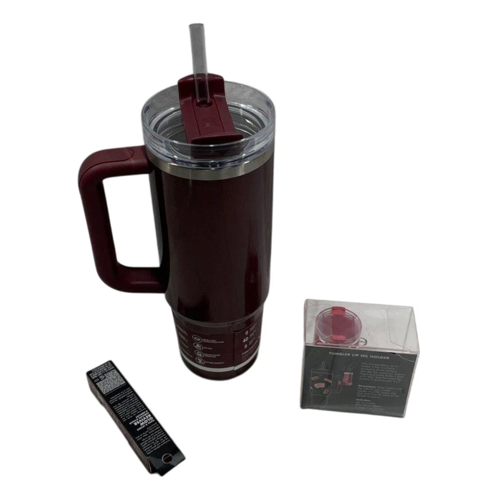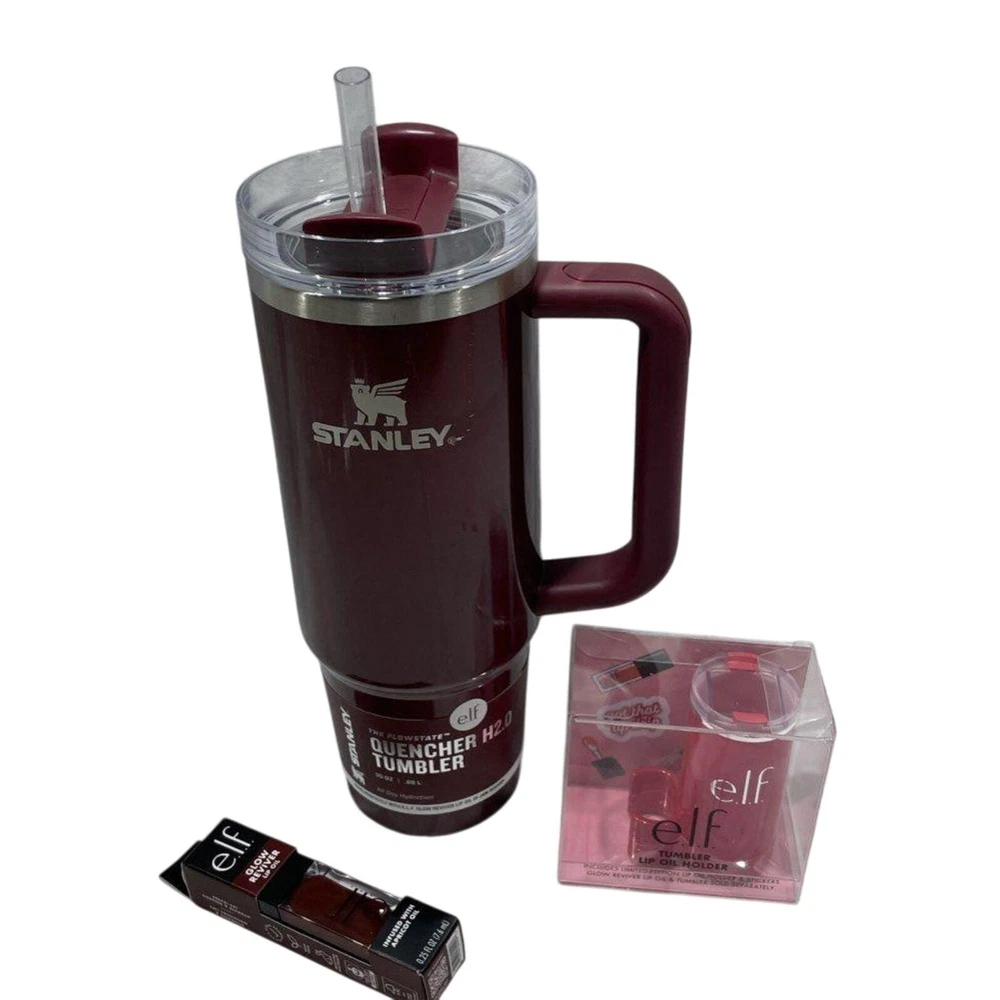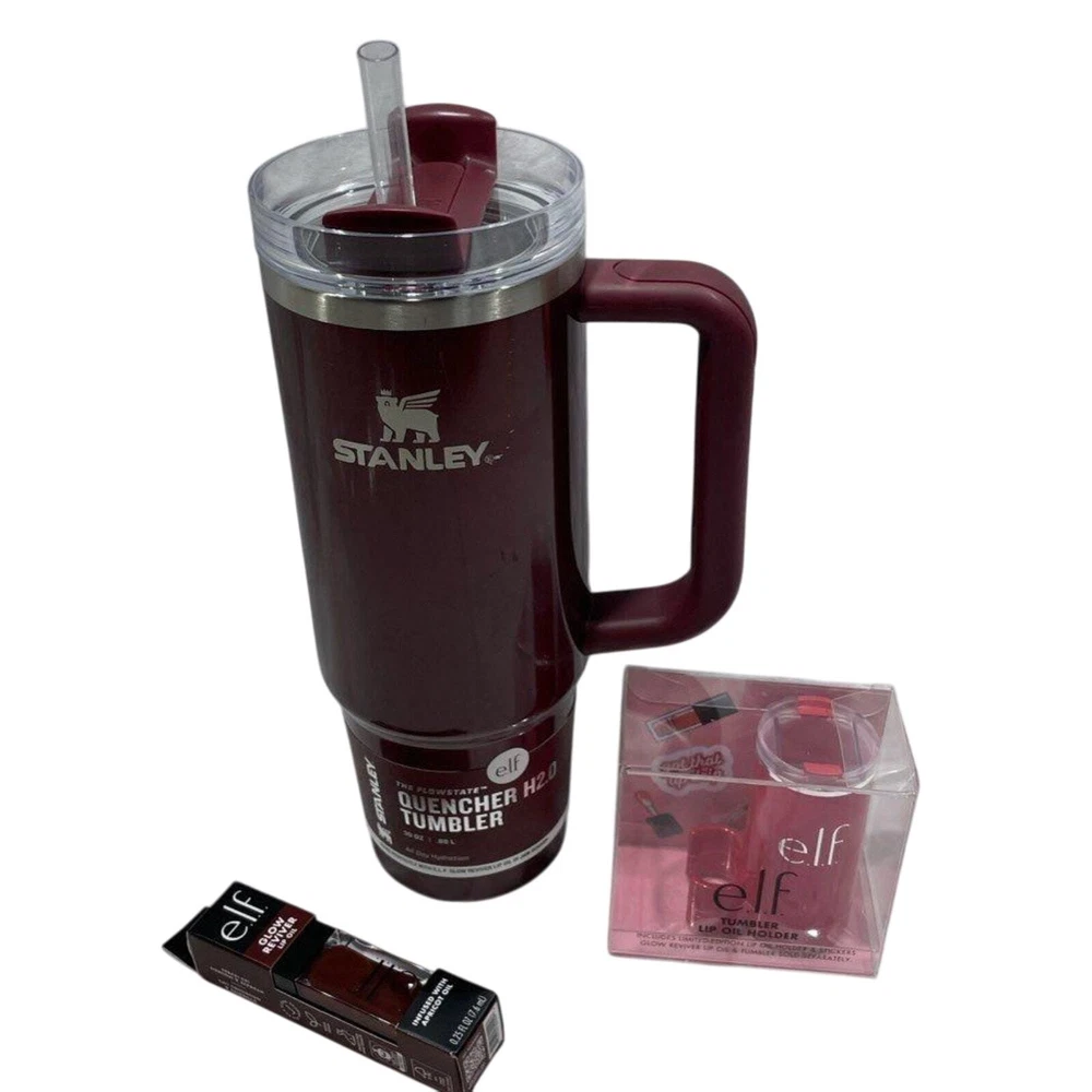30oz tumbler Lip oil holder and lip oil Brand new! NEW & NEVER USED Listing includes 1-Stanley 40 oz Stainless Steel H2.0 FlowState Quencher Tumbler Jam Session - e.l.f.: Dishwasher-Safe, Hot/Cold Drinkware 2- e.l.f. x Stanley Tumbler Lip Oil Holder - Red Delicious Includes Limited Edition Lip Oil Holder & Stickers 3) Matching to cup! e.l.f. Glow Reviver Lip Oil - Jam Session - 0.25 fl oz Ultra-glossy tinted lip oil nourishes, hydrates & enhances your lips' natural color Non-sticky, hydrating lip oil with a high-gloss finish & sheer wash of color Plush, oversized cushion applicator for an even swipeInfused with lip-loving ingredients to nourish your pout Fresh minty scent Can be worn on its own or over lipstick 100% vegan & cruelty-free, e.l.f. is Leaping Bunny Certified