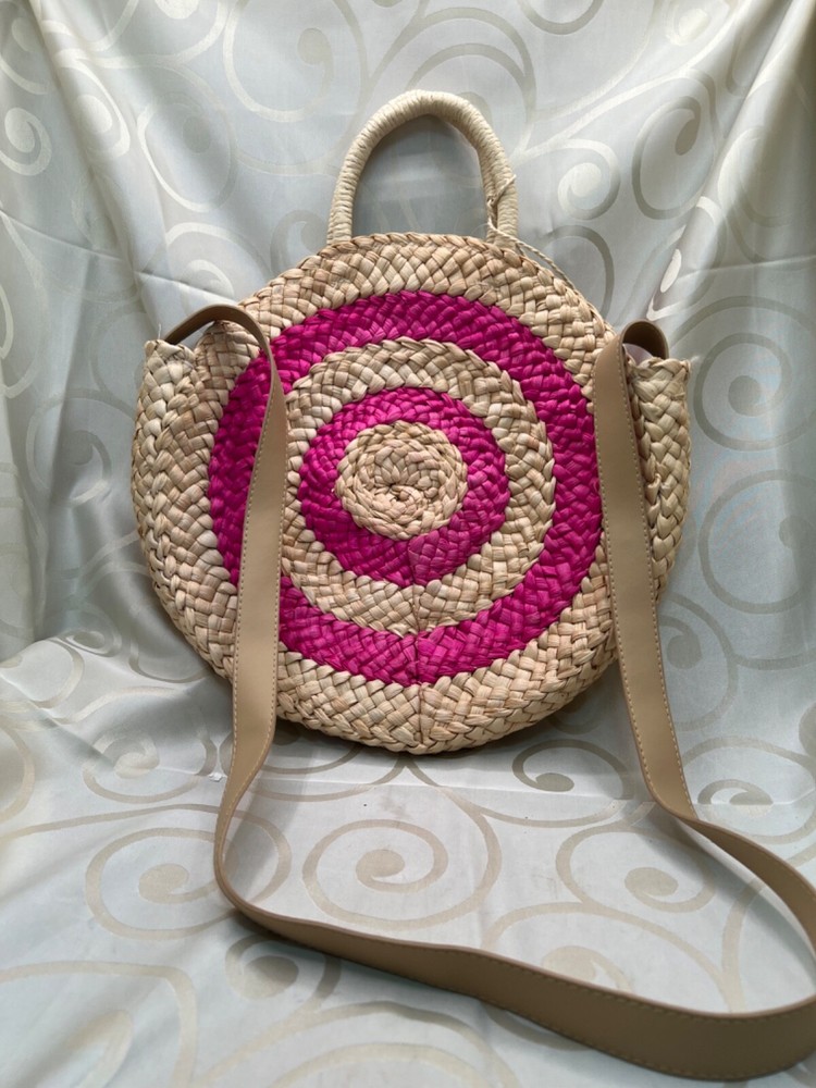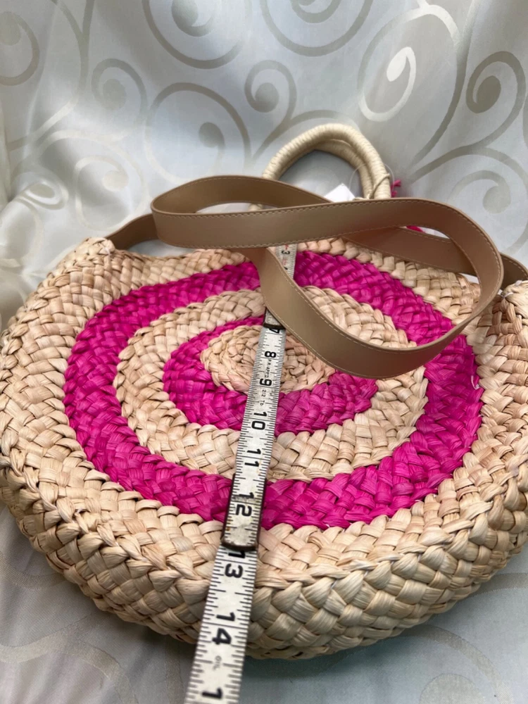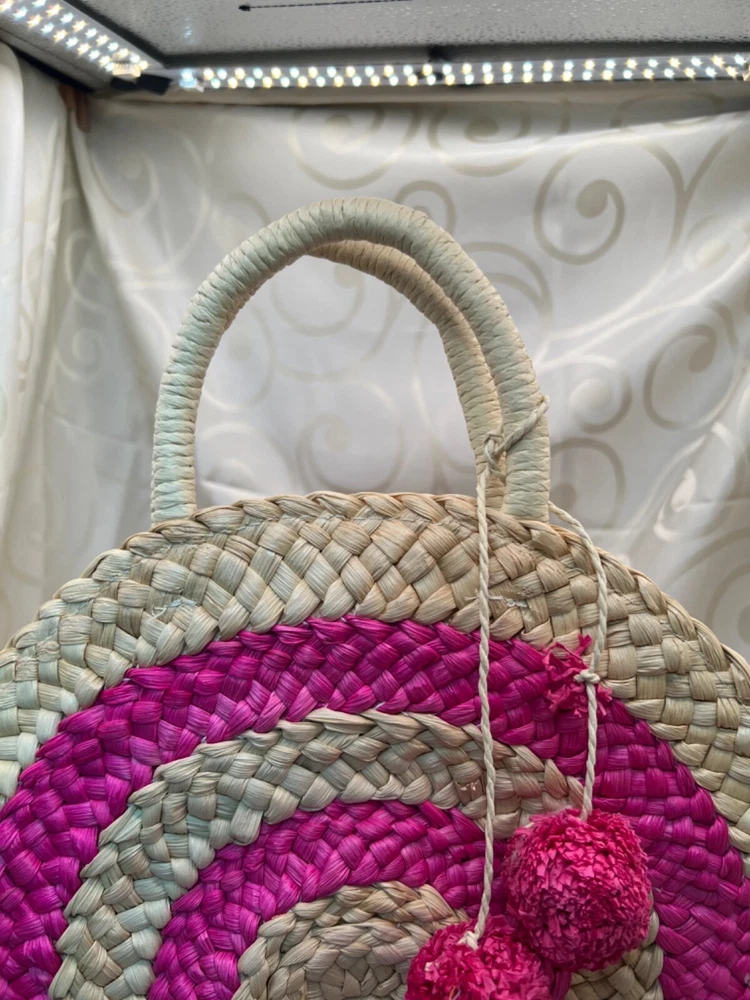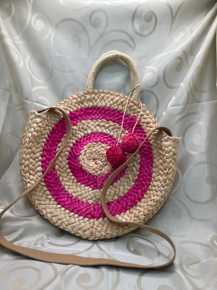 This is a medium-sized round beach bag made of corn husk and straw, featuring pink pom pom tassels and a beige fabric lining. It has a snap closure, and a beige faux leather shoulder strap and a hemp round handle. The brand is Trendedit, and it includes a bag charm. The bag has a height of 13 1/2 inches, a width of 3 inches, and a depth of 13 inches. Made in China.