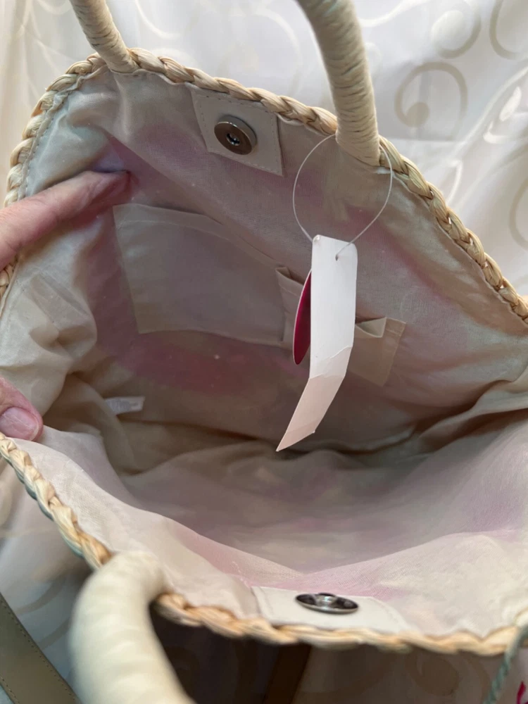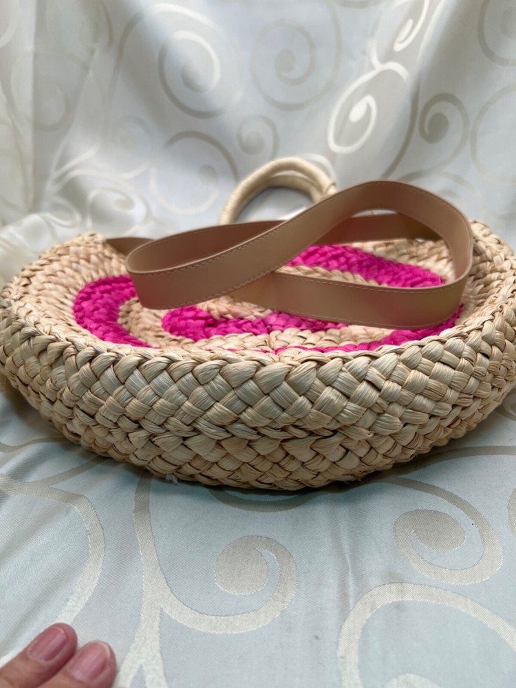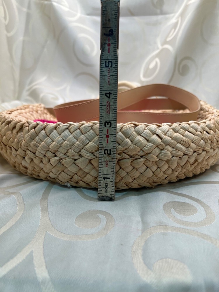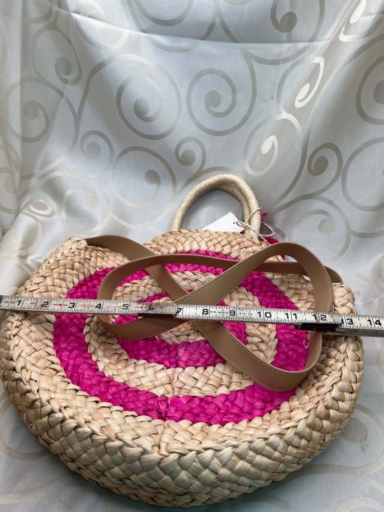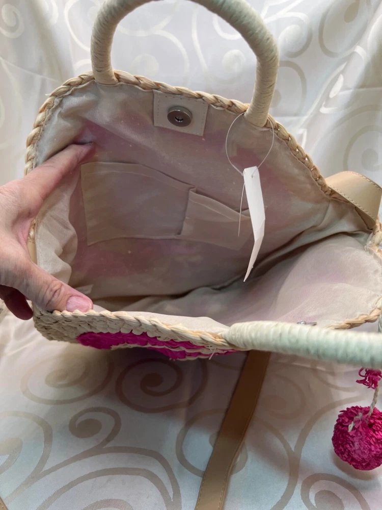 This is a medium-sized round beach bag made of corn husk and straw, featuring pink pom pom tassels and a beige fabric lining. It has a snap closure, and a beige faux leather shoulder strap and a hemp round handle. The brand is Trendedit, and it includes a bag charm. The bag has a height of 13 1/2 inches, a width of 3 inches, and a depth of 13 inches. Made in China.