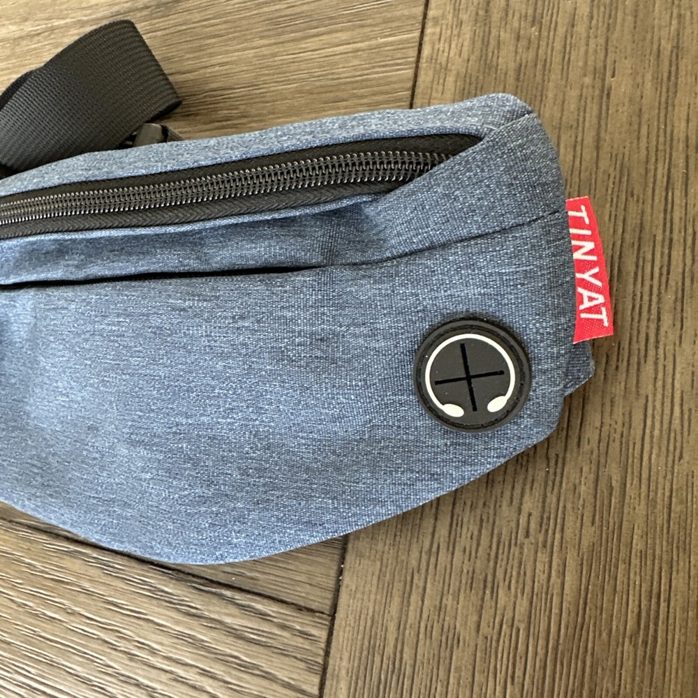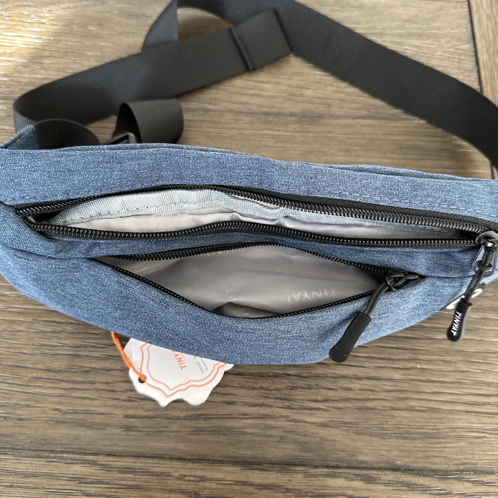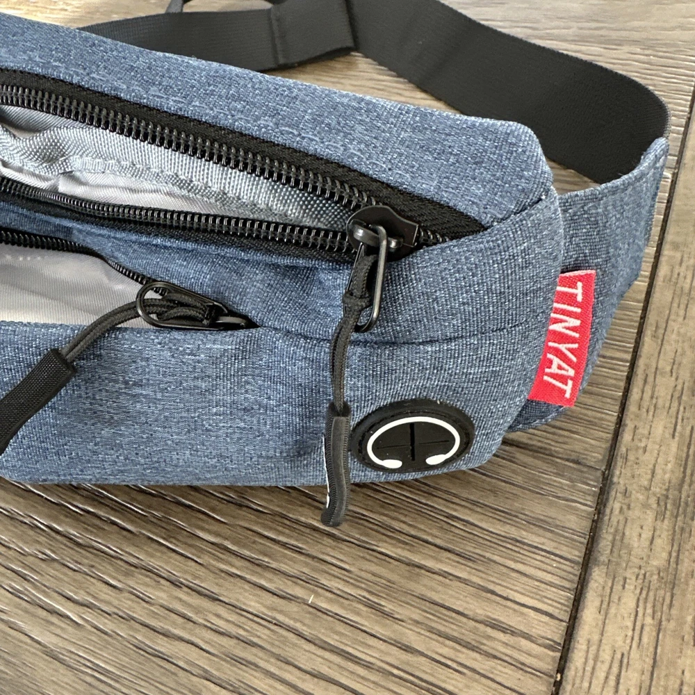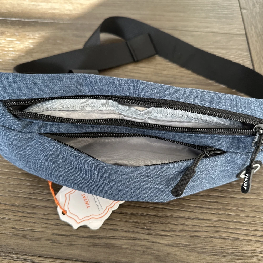 This Tinyat fanny pack waist bag is perfect for those who want a hands-free option while on-the-go. The exterior is made of durable polyethylene in a beautiful astral blue color, while the interior lining is a stylish gray linen material. The bag features a zip closure and an adjustable black strap that makes it perfect for both men and women. The bag is small in size, with three zipper compartments, making it perfect for carrying just the essentials. It has a lined interior and is lightweight, ensuring that it won't weigh you down. The hardware is also black in color, adding a sleek touch to the design. This belt bag and fanny pack is perfect for anyone who wants a convenient and stylish option for their daily outings.I’m
