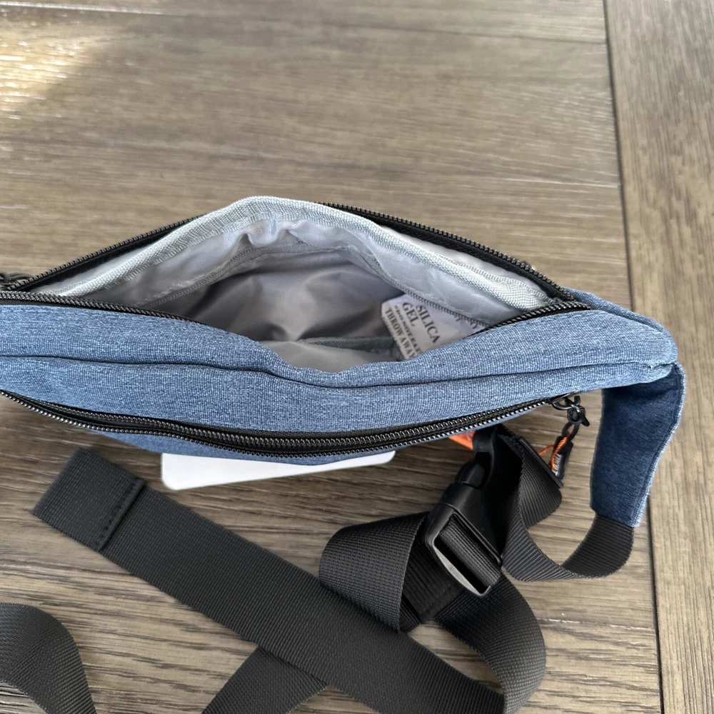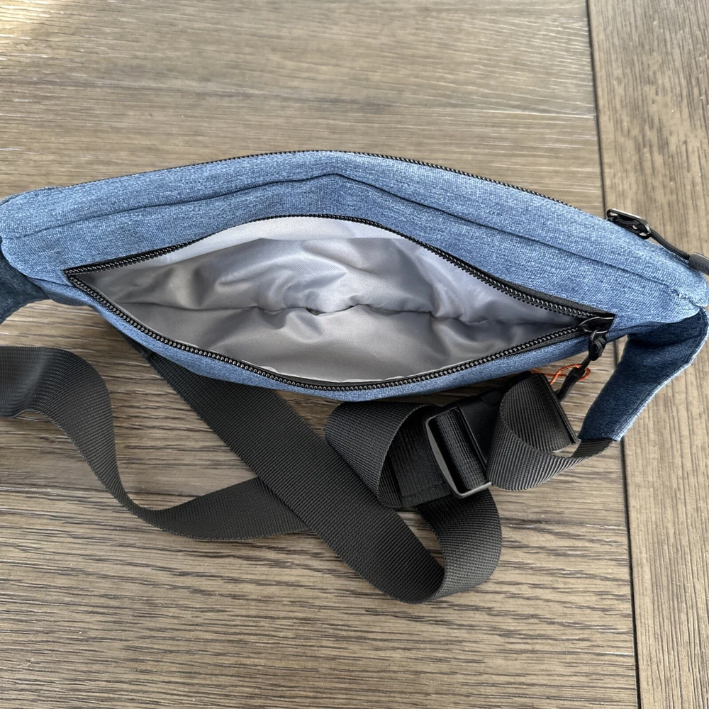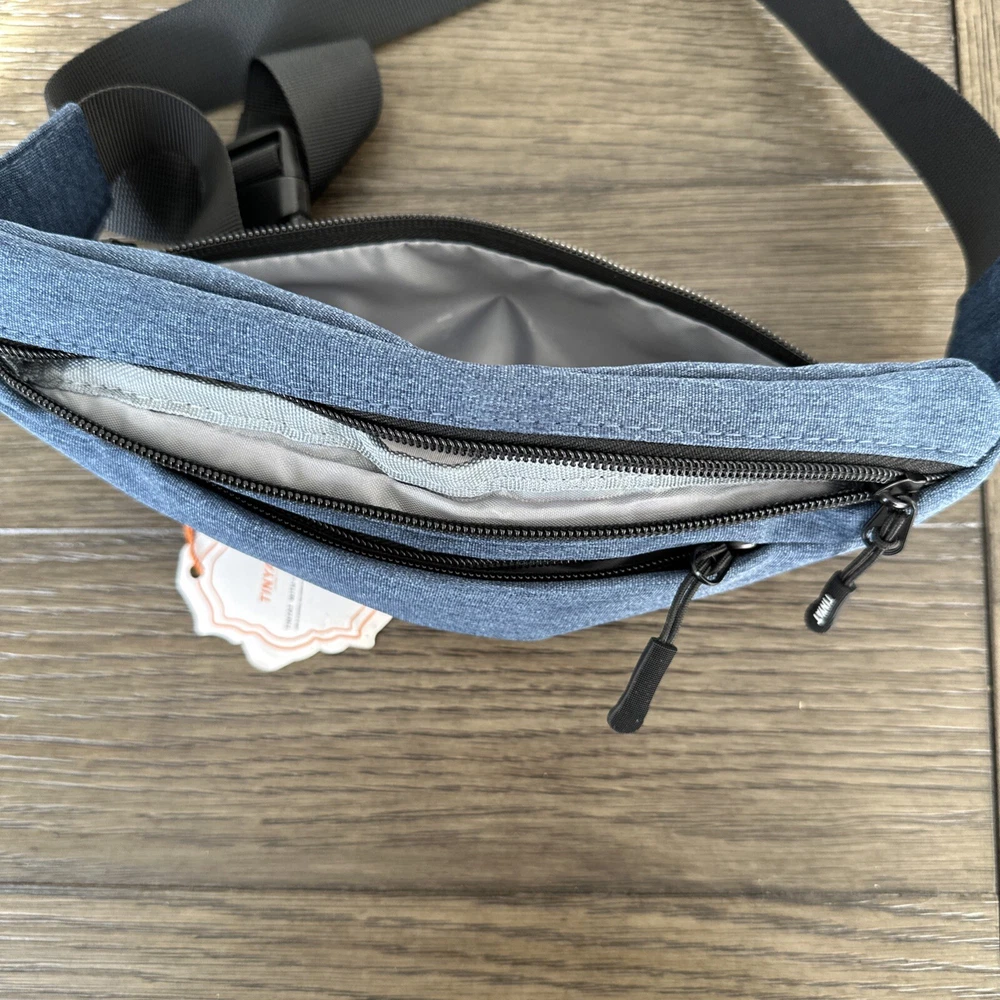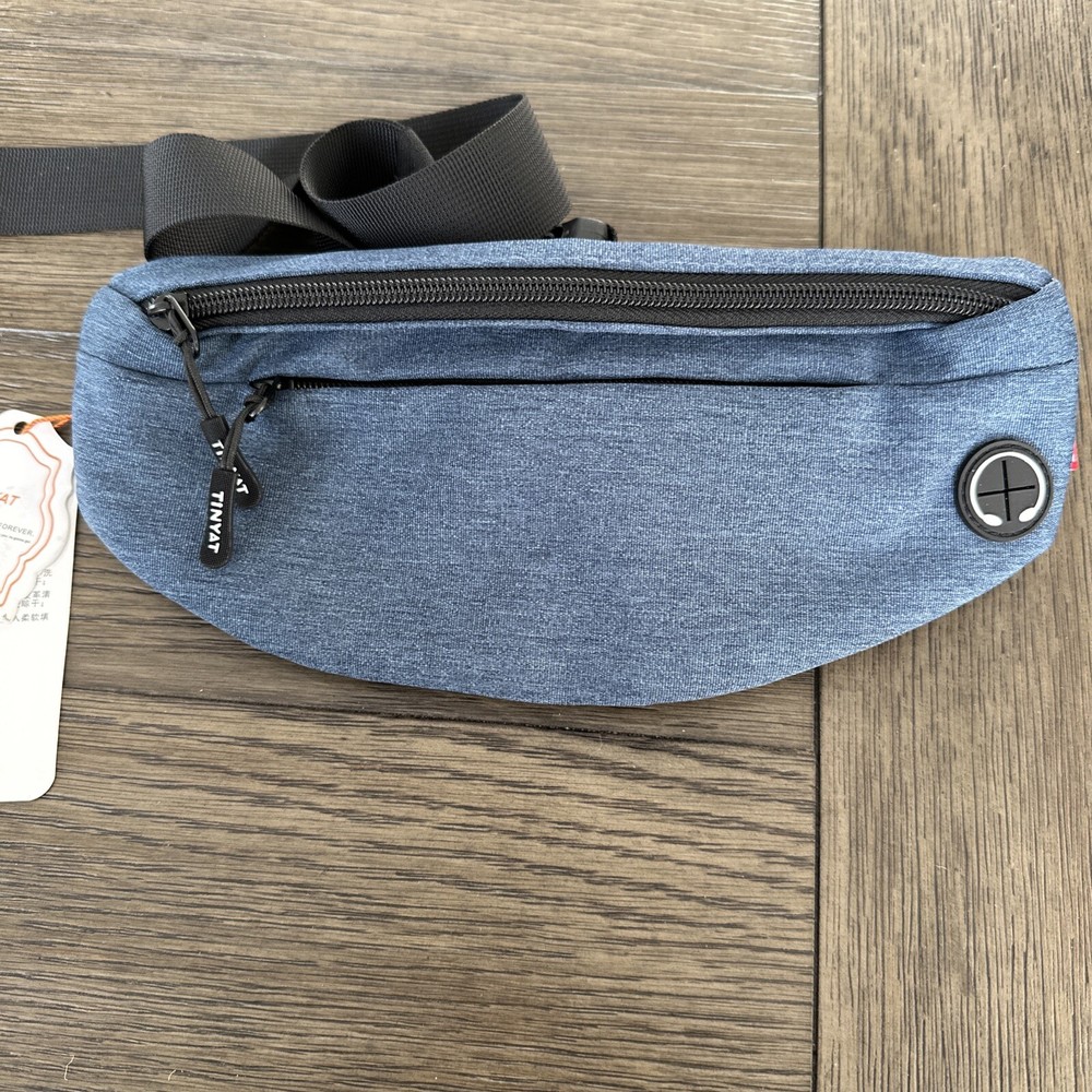 This Tinyat fanny pack waist bag is perfect for those who want a hands-free option while on-the-go. The exterior is made of durable polyethylene in a beautiful astral blue color, while the interior lining is a stylish gray linen material. The bag features a zip closure and an adjustable black strap that makes it perfect for both men and women. The bag is small in size, with three zipper compartments, making it perfect for carrying just the essentials. It has a lined interior and is lightweight, ensuring that it won't weigh you down. The hardware is also black in color, adding a sleek touch to the design. This belt bag and fanny pack is perfect for anyone who wants a convenient and stylish option for their daily outings.I’m