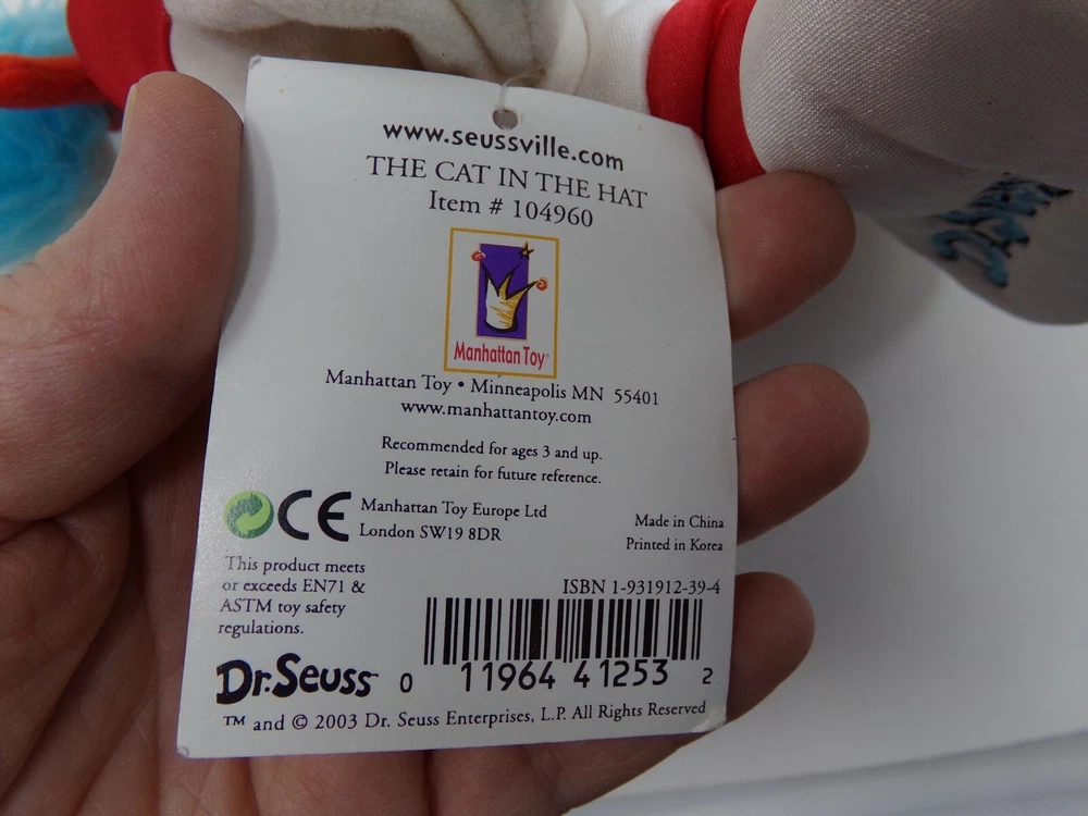 New hat shaped Hand/Finger puppet from Dr. Seuss's 100th Anniversary or as embroidered on the front: "Seussentennial - A century of Imagination! - Ted Geisel's 100th - Dr. Seuss". The plush finger puppets are the girl and boy, the Cat in the Hat, Thing 1; the thumb is the fish. The front has a embroidery of Thing with a kite, and on the rim of the hat is a hot air balloon and "Dr. Seuss". Tag is dated 2003 and is item #104960. Free shipping within the U.S. (inventory code B 3/3 )