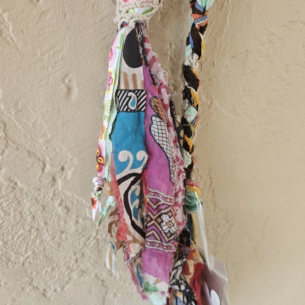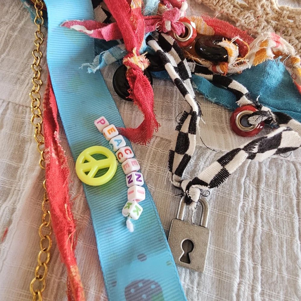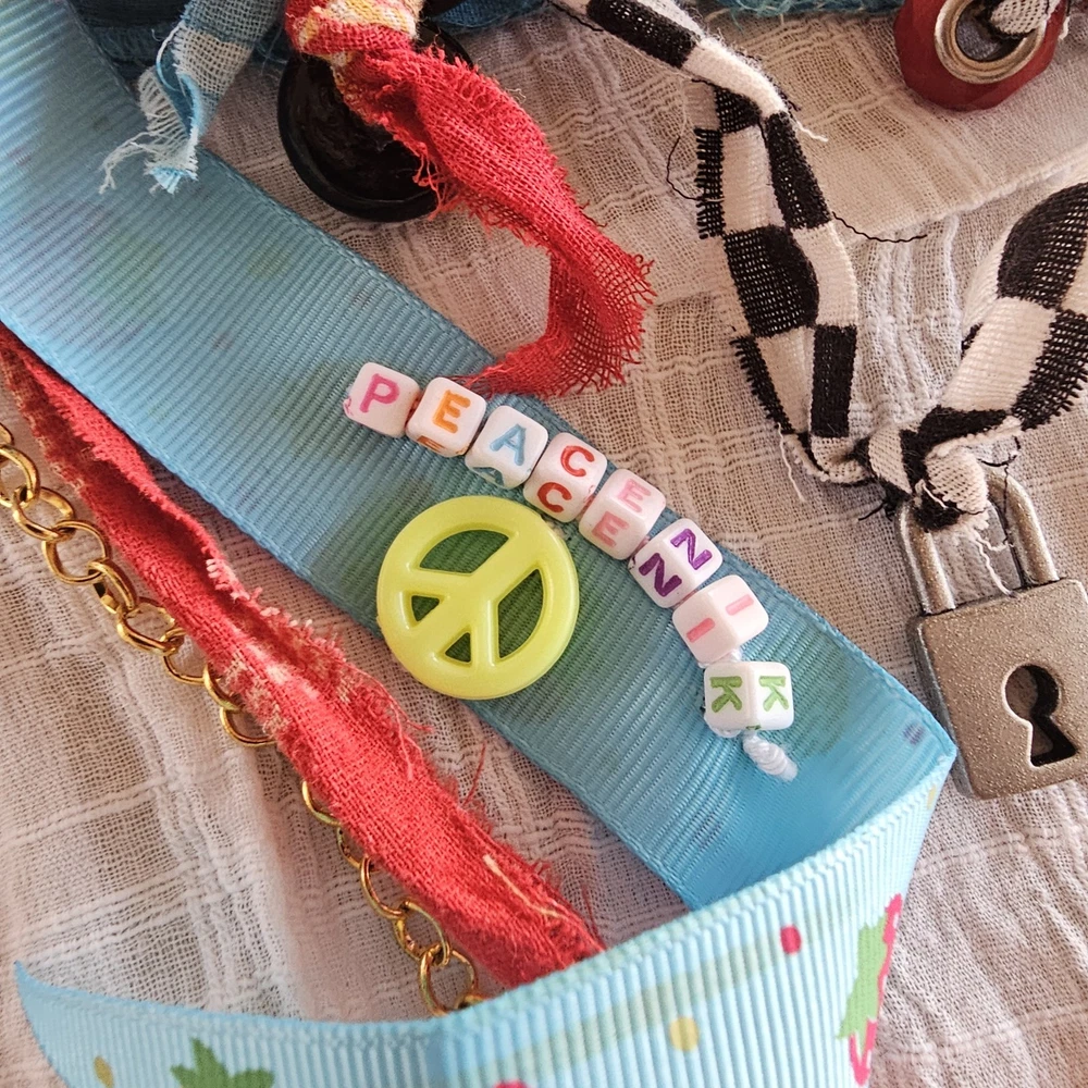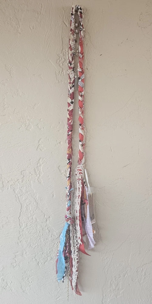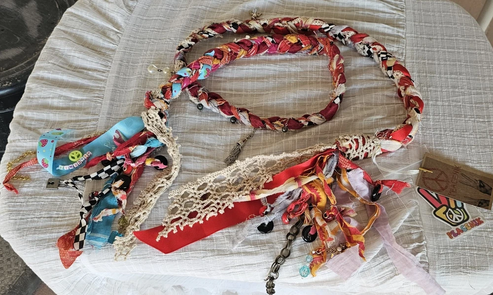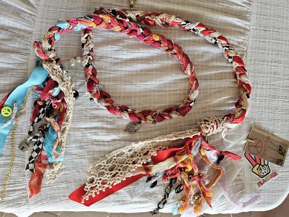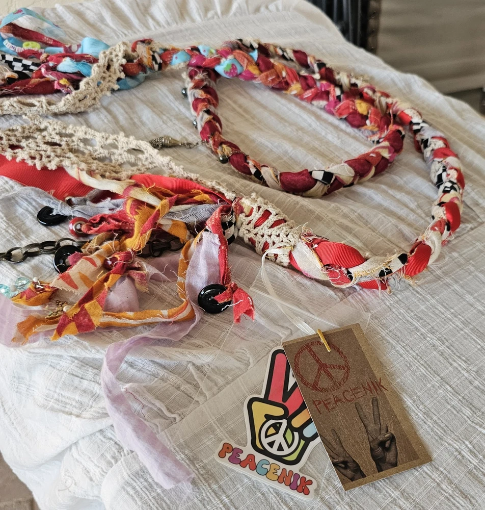 A Note From the Artists Why settle for factory-made accessories when you can tie your story together with wearable art? Every Peacenik Designs piece is hand-stitched and soul-crafted from reclaimed textiles. We don’t mass-produce—we reimagine—transforming vintage Kantha quilts into one-of-a-kind creations that carry history, beauty, and individuality. Description Introducing “Wings of Light” — a limited-edition handmade Peacenik Kantha Rope Belt. This statement accessory fuses rugged utility with boho spirit. Each belt is hand-braided from layers of vintage Kantha quilt fabric and repurposed textiles, creating a durable yet flexible rope design that molds comfortably to your body. We’ve added hand-selected embellishments — reclaimed beads, shells, vintage jewelry, charms, and metallic accents — making every belt a true work of art. Perfect for cinching dresses, flowy tops, or layering over ponchos, this belt adapts effortlessly from festival grounds to everyday wear. Tie it at the front, side, or back — its versatile styling makes it the ultimate free-spirited accessory. Details Handcrafted from upcycled vintage Kantha quilt textiles & recycled fabrics Rope-style braid for strength and comfort One-of-a-kind embellishments (each belt is unique!) Sustainable, earth-friendly fashion Approx. Length: 74" overall (51" between belt knots) Width: ~1 ¼" One size fits most (up to a 45" waist) Why You’ll Love It This isn’t just a belt. It’s wearable history, stitched with intention, meant to move with you and tell your story. Whether worn casually or as a bold statement, your Peacenik Kantha Belt is a reminder that fashion can be soulful, sustainable, and unforgettable. Fabric & Care Fabric: 100% authentic vintage Indian Kantha cotton w/ repurposed fabric blends & embellishments Care: Hand wash or spot clean, hang dry What is Kantha? Kantha is a centuries-old embroidery tradition from India and Bangladesh. Women stitched together layers of old saris and cloth scraps, creating heirloom quilts believed to offer protection. Each side is decorative and unique, carrying the soul of generations past. Why Peacenik Kantha Belts Stand Out Premium quality, authentic 3-layer vintage Kantha Fully hand-sewn and stitched Sustainable upcycling: pre-owned garments + true vintage textiles 100% one-of-a-kind — no repeats, ever Made in a smoke-free, pet-friendly studio with love and intention Shipping Packaged thoughtfully, shipped via USPS with insurance & tracking. Ships same day payment is received (excludes weekends/holidays). Important Notes Handmade using pre-loved & vintage materials Eco-conscious and one-of-a-kind Vintage wear, distressing, or variation is part of the charm All sales final (please read description & measurements carefully) Tie on the ' Wings of Light ' belt today and wrap yourself in the flowing, ancestral embrace of history, love, and memory. ✌️☮️☀️