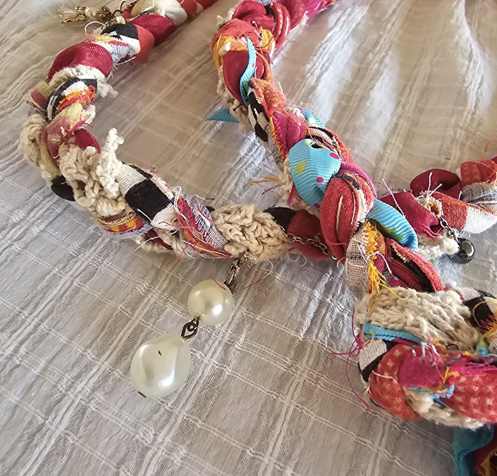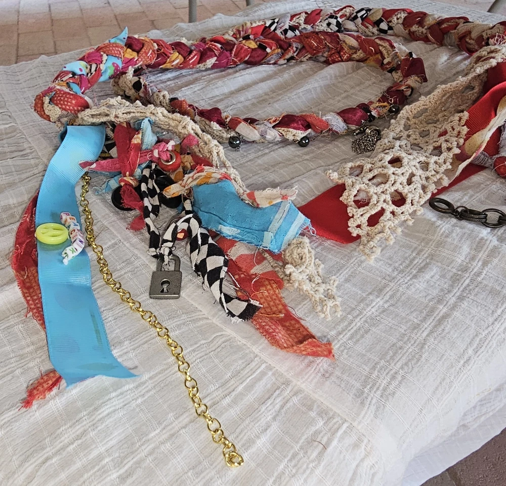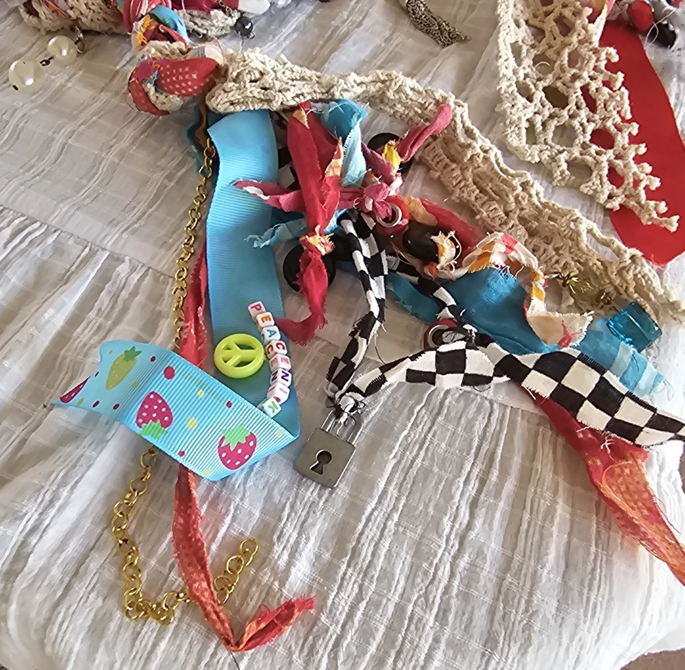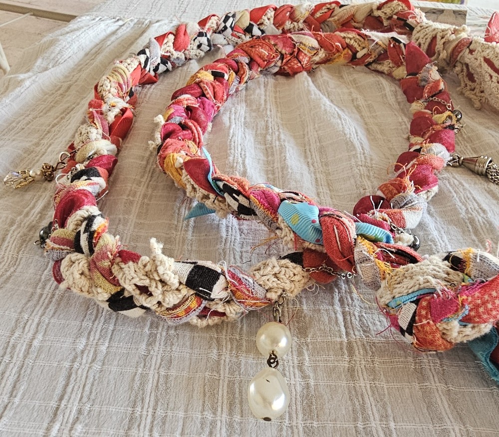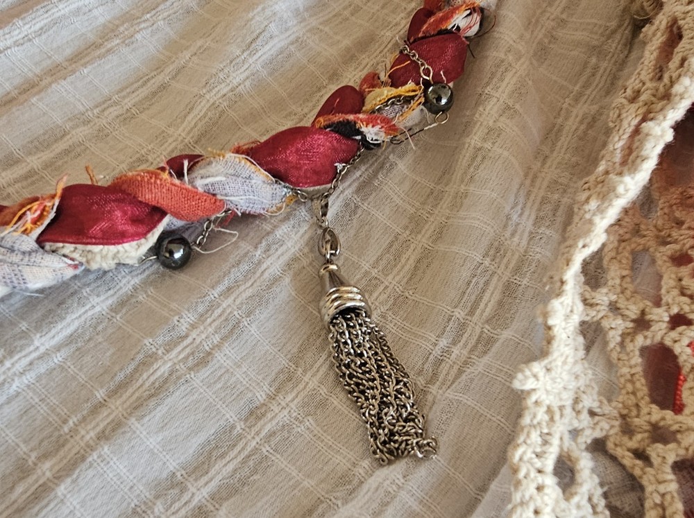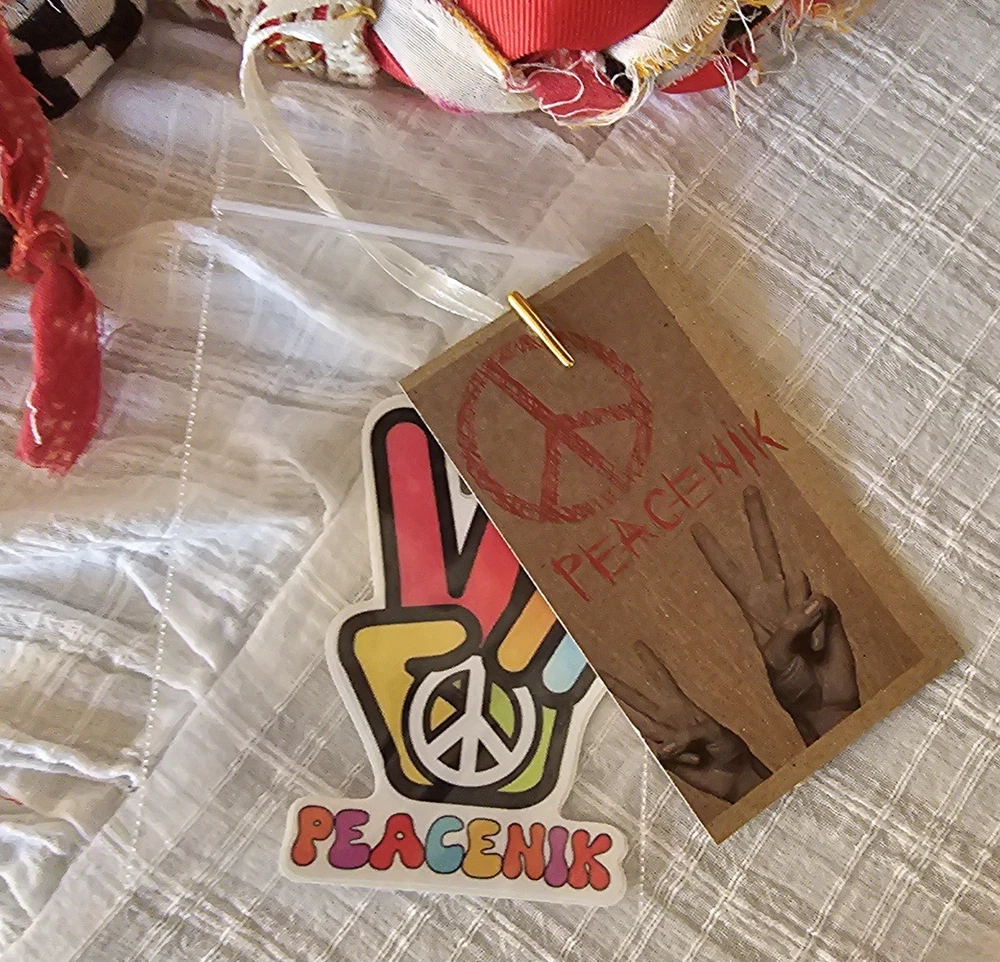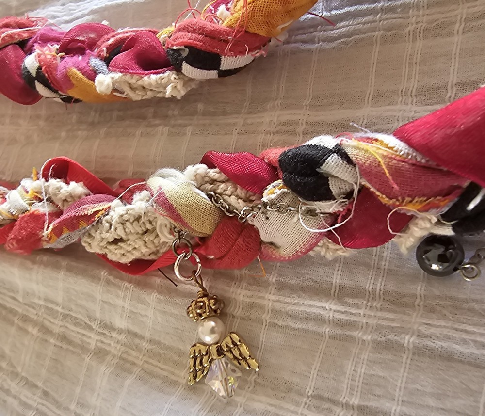 A Note From the Artists Why settle for factory-made accessories when you can tie your story together with wearable art? Every Peacenik Designs piece is hand-stitched and soul-crafted from reclaimed textiles. We don’t mass-produce—we reimagine—transforming vintage Kantha quilts into one-of-a-kind creations that carry history, beauty, and individuality. Description Introducing “Wings of Light” — a limited-edition handmade Peacenik Kantha Rope Belt. This statement accessory fuses rugged utility with boho spirit. Each belt is hand-braided from layers of vintage Kantha quilt fabric and repurposed textiles, creating a durable yet flexible rope design that molds comfortably to your body. We’ve added hand-selected embellishments — reclaimed beads, shells, vintage jewelry, charms, and metallic accents — making every belt a true work of art. Perfect for cinching dresses, flowy tops, or layering over ponchos, this belt adapts effortlessly from festival grounds to everyday wear. Tie it at the front, side, or back — its versatile styling makes it the ultimate free-spirited accessory. Details Handcrafted from upcycled vintage Kantha quilt textiles & recycled fabrics Rope-style braid for strength and comfort One-of-a-kind embellishments (each belt is unique!) Sustainable, earth-friendly fashion Approx. Length: 74" overall (51" between belt knots) Width: ~1 ¼" One size fits most (up to a 45" waist) Why You’ll Love It This isn’t just a belt. It’s wearable history, stitched with intention, meant to move with you and tell your story. Whether worn casually or as a bold statement, your Peacenik Kantha Belt is a reminder that fashion can be soulful, sustainable, and unforgettable. Fabric & Care Fabric: 100% authentic vintage Indian Kantha cotton w/ repurposed fabric blends & embellishments Care: Hand wash or spot clean, hang dry What is Kantha? Kantha is a centuries-old embroidery tradition from India and Bangladesh. Women stitched together layers of old saris and cloth scraps, creating heirloom quilts believed to offer protection. Each side is decorative and unique, carrying the soul of generations past. Why Peacenik Kantha Belts Stand Out Premium quality, authentic 3-layer vintage Kantha Fully hand-sewn and stitched Sustainable upcycling: pre-owned garments + true vintage textiles 100% one-of-a-kind — no repeats, ever Made in a smoke-free, pet-friendly studio with love and intention Shipping Packaged thoughtfully, shipped via USPS with insurance & tracking. Ships same day payment is received (excludes weekends/holidays). Important Notes Handmade using pre-loved & vintage materials Eco-conscious and one-of-a-kind Vintage wear, distressing, or variation is part of the charm All sales final (please read description & measurements carefully) Tie on the ' Wings of Light ' belt today and wrap yourself in the flowing, ancestral embrace of history, love, and memory. ✌️☮️☀️