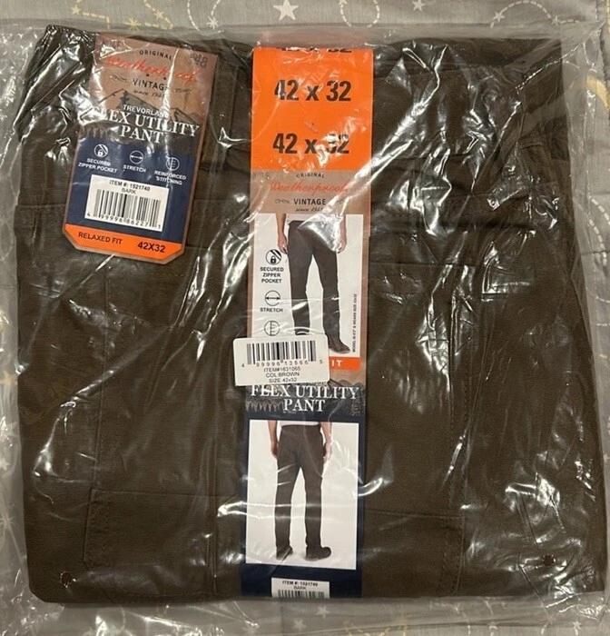 Weatherproof Vintage Men Canvas Pant Color : BROWN Size : W42 x L32 NWT ( New With Tags ) Features: • Weatherproof® Vintage • Straight leg opening • Reinforced top stitching • Side leg secured zipper pocket • Smartphone pocket • Made in Bangladesh Content: • 98% Cotton | 2% Spandex • Approximate 330 GSM (9.7oz) fabric weight • Heavyweight Sizing: • Waist (in): 42 • Inseam (in): 32 • Model is 6'1" wearing size 32x32 • Color & size subject to availability Care Instructions: • Machine wash with like colors • Gentle cycle • Only non-chlorine bleach when needed • Tumble dry low • Cool iron if necessary